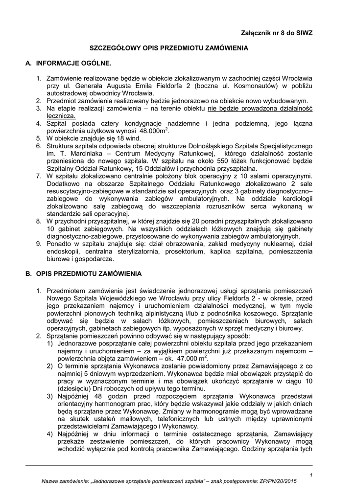Załącznik nr 8 do SIWZ SZCZEGÓŁOWY OPIS PRZEDMIOTU ZAMÓWIENIA A. INFORMACJE OGÓLNE. 1. Zamówienie realizowane będzie w obiekcie zlokalizowanym w zachodniej części Wrocławia przy ul. Generała Augusta Emila Fieldorfa 2 (boczna ul. Kosmonautów) w pobliżu autostradowej obwodnicy Wrocławia. 2. Przedmiot zamówienia realizowany będzie jednorazowo na obiekcie nowo wybudowanym. 3. Na etapie realizacji zamówienia – na terenie obiektu nie będzie prowadzona działalność lecznicza. 4. Szpital posiada cztery kondygnacje nadziemne i jedna podziemną, jego łączna powierzchnia użytkowa wynosi 48.000m2. 5. W obiekcie znajduje się 18 wind. 6. Struktura szpitala odpowiada obecnej strukturze Dolnośląskiego Szpitala Specjalistycznego im. T. Marciniaka – Centrum Medycyny Ratunkowej, którego działalność zostanie przeniesiona do nowego szpitala. W szpitalu na około 550 łóżek funkcjonować będzie Szpitalny Oddział Ratunkowy, 15 Oddziałów i przychodnia przyszpitalna. 7. W szpitalu zlokalizowano centralnie położony blok operacyjny z 10 salami operacyjnymi. Dodatkowo na obszarze Szpitalnego Oddziału Ratunkowego zlokalizowano 2 sale resuscytacyjno-zabiegowe w standardzie sal operacyjnych oraz 3 gabinety diagnostyczno– zabiegowe do wykonywania zabiegów ambulatoryjnych. Na oddziale kardiologii zlokalizowano salę zabiegową do wszczepiania rozruszników serca wykonaną w standardzie sali operacyjnej. 8. W przychodni przyszpitalnej, w której znajdzie się 20 poradni przyszpitalnych zlokalizowano 10 gabinet zabiegowych. Na wszystkich oddziałach łóżkowych znajdują się gabinety diagnostyczno-zabiegowe, przystosowane do wykonywania zabiegów ambulatoryjnych. 9. Ponadto w szpitalu znajduje się: dział obrazowania, zakład medycyny nuklearnej, dział endoskopii, centralna sterylizatornia, prosektorium, kaplica szpitalna, pomieszczenia biurowe i gospodarcze. B. OPIS PRZEDMIOTU ZAMÓWIENIA 1. Przedmiotem zamówienia jest świadczenie jednorazowej usługi sprzątania pomieszczeń Nowego Szpitala Wojewódzkiego we Wrocławiu przy ulicy Fieldorfa 2 - w okresie, przed jego przekazaniem najemcy i uruchomieniem działalności medycznej, w tym mycie powierzchni pionowych techniką alpinistyczną i/lub z podnośnika koszowego. Sprzątanie odbywać się będzie w salach łóżkowych, pomieszczeniach biurowych, salach operacyjnych, gabinetach zabiegowych itp. wyposażonych w sprzęt medyczny i biurowy. 2. Sprzątanie pomieszczeń powinno odbywać się w następujący sposób: 1) Jednorazowe posprzątanie całej powierzchni obiektu szpitala przed jego przekazaniem najemny i uruchomieniem – za wyjątkiem powierzchni już przekazanym najemcom – powierzchnia objęta zamówieniem – ok. 47.000 m2. 2) O terminie sprzątania Wykonawca zostanie powiadomiony przez Zamawiającego z co najmniej 5 dniowym wyprzedzeniem. Wykonawca będzie miał obowiązek przystąpić do pracy w wyznaczonym terminie i ma obowiązek ukończyć sprzątanie w ciągu 10 (dziesięciu) Dni roboczych od upływu tego terminu. 3) Najpóźniej 48 godzin przed rozpoczęciem sprzątania Wykonawca przedstawi orientacyjny harmonogram prac, który będzie wskazywał jakie oddziały w jakich dniach będą sprzątane przez Wykonawcę. Zmiany w harmonogramie mogą być wprowadzane na skutek ustaleń mailowych, telefonicznych lub ustnych między uprawnionymi przedstawicielami Zamawiającego i Wykonawcy. 4) Najpóźniej w dniu informacji o terminie ostatecznego sprzątania, Zamawiający przekaże zestawienie pomieszczeń, do których pracownicy Wykonawcy mogą wchodzić wyłącznie pod kontrolą pracownika Zamawiającego. Godziny sprzątania tych 1 Nazwa zamówienia: „Jednorazowe sprzątanie pomieszczeń szpitala” – znak postępowania: ZP/PN/20/2015 pomieszczeń powinny zostać niezwłocznie ustalone pomiędzy przedstawicielami Zamawiającego i Wykonawcy. 5) Prace mogą być prowadzone w dni robocze w godzinach 8.00-16.00. Do dni roboczych nie wlicza się sobót. 6) Podstawą do odbioru będzie brak uwag najemcy co do stanu czystości obiektu. Wszystkie uwagi najemcy w tym zakresie Wykonawca będzie zobowiązany uwzględnić i dokonać odpowiednich poprawek. 7) Odbiór zostanie potwierdzony protokołem odbioru. 3. Wykonawca będzie świadczył usługi przy zastosowaniu własnego sprzętu oraz własnych środków czystości spełniających normy sanitarno-epidemiologiczne oraz posiadających atesty PZH. Wykonawca zapewni: środki utrzymania czystości i pielęgnacji powierzchni podłóg i worki foliowe na śmieci, środki dezynfekcyjne do dezynfekcji dużych i małych powierzchni. Zamawiający udostępni pomieszczenia techniczne na zabezpieczenie sprzętu i środków chemicznych do czyszczenia powierzchni, pomieszczenie do wymiany wody i mycia sprzętu oraz pomieszczenie socjalne. Brak możliwości używania lub wstawienia przez Wykonawcę pralki. 4. zestawienie pomieszczeń z zestawieniem rodzajów i typów powierzchni ścian, podłóg i sufitów (tabela Excel) zawiera załącznik nr 9.1 do SIWZ. 5. Wykaz typów powierzchni wymienionych w załączniku nr 9.1 do SIWZ w obiekcie oraz wskazań do ich pielęgnacji zawiera załącznik nr 9.2 do SIWZ 6. Instrukcję eksploatacji poszczególnych rodzajów powierzchni zawiera załącznik nr 10 do SIWZ. 7. Podziału obowiązków pomiędzy osoby sprzątające dokonuje Wykonawca, lecz Zamawiający zastrzega sobie prawo do ingerencji za pośrednictwem Wykonawcy w sposób podziału obowiązków oraz do wydawania poleceń osobom sprzątającym w razie stwierdzenia nieprawidłowości w wykonywaniu ich czynności. 8. Odpady komunalne produkowane podczas prac Wykonawca powinien wynieść do szpitalnych kontenerów na odpady komunalne. Miejsce ich ustawienia zostanie wskazane Wykonawcy najpóźniej w dniu rozpoczęcia prac. Odpady nie będące odpadami komunalnymi Wykonawca usunie na własny koszt w zgodzie z obowiązującymi przepisami. 9. Na terenie obiektu szpitalnego podczas prac zwi