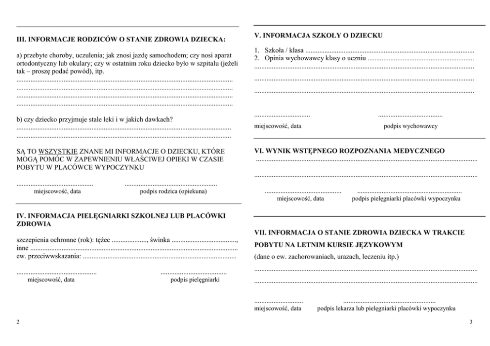______________________________________________________________________________________ III. INFORMACJE RODZICÓW O STANIE ZDROWIA DZIECKA: a) przebyte choroby, uczulenia; jak znosi jazdę samochodem; czy nosi aparat ortodontyczny lub okulary; czy w ostatnim roku dziecko było w szpitalu (jeżeli tak – proszę podać powód), itp. ............................................................................................................................ ............................................................................................................................ ............................................................................................................................ ............................................................................................................................ b) czy dziecko przyjmuje stale leki i w jakich dawkach? ........................................................................................................................... ........................................................................................................................... SĄ TO WSZYSTKIE ZNANE MI INFORMACJE O DZIECKU, KTÓRE MOGĄ POMÓC W ZAPEWNIENIU WŁAŚCIWEJ OPIEKI W CZASIE POBYTU W PLACÓWCE WYPOCZYNKU V. INFORMACJA SZKOŁY O DZIECKU 1. Szkoła / klasa ................................................................................................. 2. Opinia wychowawcy klasy o uczniu ............................................................. .............................................................................................................................. .............................................................................................................................. .............................................................................................................................. ................................ ..................................... miejscowość, data podpis wychowawcy VI. WYNIK WSTĘPNEGO ROZPOZNANIA MEDYCZNEGO ............................................................................................................................... ................................................................................................................................ ............................................ miejscowość, data ..................................................... podpis rodzica (opiekuna) ............................................ miejscowość, data ............................................................ podpis pielęgniarki placówki wypoczynku IV. INFORMACJA PIELĘGNIARKI SZKOLNEJ LUB PLACÓWKI ZDROWIA szczepienia ochronne (rok): tężec ...................., świnka ....................................., inne ....................................................................................................................... ew. przeciwwskazania: ........................................................................................ .............................................. miejscowość, data ...................................... podpis pielęgniarki VII. INFORMACJA O STANIE ZDROWIA DZIECKA W TRAKCIE POBYTU NA LETNIM KURSIE JĘZYKOWYM (dane o ew. zachorowaniach, urazach, leczeniu itp.) ................................................................................................................................ ................................................................................................................................ ............................ miejscowość, data 2 ..................................................... podpis lekarza lub pielęgniarki placówki wypoczynku 3