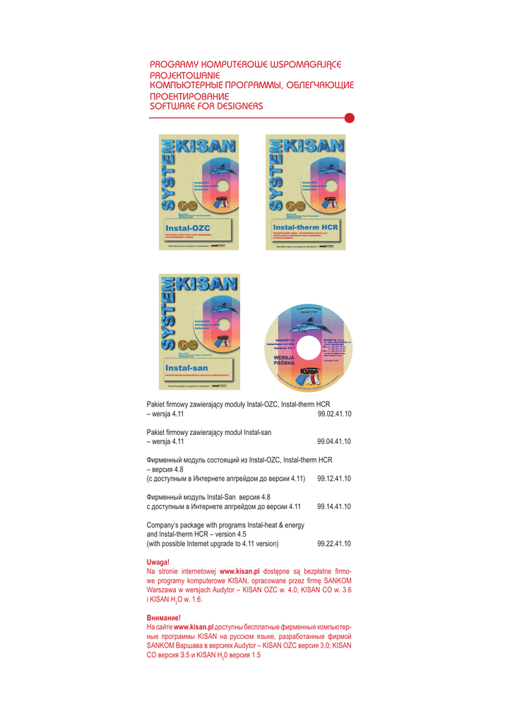 PROGRAMY KOMPUTEROWE WSPOMAGAJĄCE PROJEKTOWANIE КОМПЬЮТЕРНЫЕ ПРОГРАММЫ, ОБЛЕГЧАЮЩИЕ ПРОЕКТИРОВАНИЕ SOFTWARE FOR DESIGNERS Pakiet firmowy zawierający moduły Instal-OZC, Instal-therm HCR – wersja 4.11 99.02.41.10 Pakiet firmowy zawierający moduł Instal-san – wersja 4.11 99.04.41.10 Фирменный модуль состоящий из Instal-OZC, Instal-therm HCR – версия 4.8 (с доступным в Интернете апгрейдом до версии 4.11) 99.12.41.10 Фирменный модуль Instal-San версия 4.8 с доступным в Интернете апгрейдом до версии 4.11 99.14.41.10 Company’s package with programs Instal-heat & energy and Instal-therm HCR – version 4.5 (with possible Internet upgrade to 4.11 version) 99.22.41.10 Uwaga! Na stronie internetowej www.kisan.pl dostępne są bezpłatne firmowe programy komputerowe KISAN, opracowane przez firmę SANKOM Warszawa w wersjach Audytor – KISAN OZC w. 4.0; KISAN CO w. 3.6 i KISAN H2O w. 1.6. Внимание! На сайте www.kisan.pl доступны бесплатные фирменные компьютерные программы KISAN на русском языке, разработанные фирмой SANKOM Варшава в версиях Audytor – KISAN OZC версия 3.0; KISAN СО версия З.5 и KISAN Н20 версия 1.5