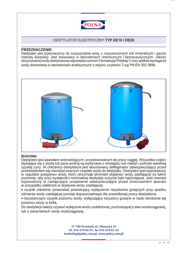 DESTYLATOR ELEKTRYCZNY TYP DE10 i DE20 PRZEZNACZENIE: Destylator jest przeznaczony do oczyszczania wody z rozpuszczonych soli mineralnych i gazów metodą destylacji. Jest stosowany w laboratoriach chemicznych i farmaceutycznych. Jakość otrzymywanej wody destylowanej odpowiada normom Farmakopei Polskiej V oraz spełnia wymagania wody stosowanej w laboratoriach analitycznych o stopniu czystości 3 wg PN-EN ISO 3696. BUDOWA: Destylator jest aparatem wolnostojącym, przystosowanym do pracy ciągłej. Wszystkie części stykające się z wodą lub parą wodną są wykonane z mosiądzu lub miedzi i pokryte warstwą czystej cyny. W chłodnicy destylatora jest wbudowany deflegmator zabezpieczający przed przedostaniem się nieodparowanych cząstek wody do destylatu. Destylator jest wyposażony w regulator przepływu wody, który utrzymuje strumień objętości wody zasilającej na takim poziomie, aby przy wydajności nominalnej destylatu zużycie było najmniejsze. Jest również wyposażony w następujące urządzenia zabezpieczające przed zniszczeniem aparatu w przypadku zakłóceń w dopływie wody zasilającej: • czujnik ciśnienia (presostat) powodujący wyłączenie rezystorów grzejnych przy spadku ciśnienia wody zasilającej poniżej dopuszczalnego dla prawidłowej pracy destylatora, • rezystancyjny czujnik poziomu wody, wyłączający rezystory grzejne w razie obniżenia się poziomu wody w kotle. Do destylacji należy używać wyłącznie wody uzdatnionej, pochodzącej z sieci wodociągowej, lub o parametrach wody wodociągowej. 37-700 Przemyśl, ul. Obozowa 23 tel. 016 678 66 01, fax 016 678 65 24 [email protected], www.polna.com.pl ZASADA DZIAŁANIA Woda z przewodu zasilającego ogrzana wstępnie podczas przepływu przez chłodnicę, zasila kocioł do określonego poziomu, a jej nadmiar jest odprowadzany na zewnątrz. Pod wpływem ciepła dostarczonego przez rezystory grzejne woda wrze, a wytworzona para wodna wpływa do chłodnicy, gdzie po ochłodzeniu ulega kondensacji i wypływa na zewnątrz jako destylat. DANE TECHNICZNE DE10 DE20 Klasa ochrony aparatu I Wydajność ok. 10 dm3/h ok. 18 dm3/h Zyżycie wody ok. 150 ok. 220 Moc pobierana 7,2 kW 12 kW Napięcie zasilania 3x400V Masa 14 kg 18 kg Rys. 1 Wymiary zewnętrzne destylatorów. Aparat A B C D DE10 582 394 146 16 DE20 670 548 160 22 SPOSÓB ZAMAWIANIA W zamówieniu należy podać nazwę i typ destylatora. Wydanie: DE10-20/09/2009 Ważne do następnego wydania.