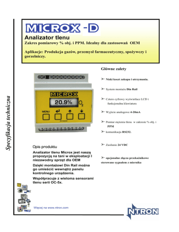 Analizator tlenu Zakres pomiarowy % obj. i PPM. Idealny dla zastosowań OEM Aplikacje: Produkcja gazów, przemysł farmaceutyczny, spożywczy i gorzelniczy. Główne zalety ➣ Niski koszt zakupu i utrzymania. Specyfikacja techniczna ➣ System montażu Din Rail ➣ Cztero cyfrowy wyświetlacz LCD i funkcjonalna klawiatura ➣ Wyjście analogowe 4-20mA ➣ Pomiar stężenia tlenu w zakresie % obj. i PPM ➣ komunikacja RS232. Opis produktu Analizator tlenu Microx jest naszą propozycją na tani w eksploatacji I niezawodny sprzęt dla OEM Dzięki montażowi Din Rail można go umieścić wewnątrz panelu kontrolnego urządzenia. Współpracuje z wieloma sensorami tlenu serii OC-5x. Więcej na www.ntron.com ➣ Zasilanie 24 VDC ➣ opcjonalne złącza przekaźnikowe sterowane sygnałem z miernika Specyfikacja techniczna Wymiary: 86 mm Wys x 69 mm Sz x 58 mm Gł. Montaż: Din Rail lub powierzchniowy Waga: 150 gr. Mierzony gaz: Tlen. Zakres pomiaru: 0-25% obj. 1.-500 ppm. Czas odpowiedzi T 90: 12 s Rozdzielczość: 0.1% lub 1.0 ppm Zasilanie: 24 VDC +/- 10%. (Maks 160mA) Wyświetlacz: 100 x 33 punkt. Klawiatura: 4 przyciski Komunikacja: RS 232. Wyjście analogowe: 4-20 mA zasilane pętlą prądową. Liniowość +/- 1%. opcjonalnie. Opcjonalne wyjście cyfrowe: 2 Format wyświetlania: % lub ppm. Zakres temperatur: 5 Amp. - Użycie -5 to + 40°C. - przechowywanie -20 to +50°C. Stopień ochrony: Rózne stopnie IP, w zależności od wymagań Certyfikaty: CE EN61000-6-4; EN61000-6-2; EN55022. Microx-D zawor OC-5X Sensor Proces 4-20mA/RS232 przepływo System kontrolny zawór Typowa konfiguracja Biuro w Irlandii: Mullaghboy Industrial Park, Navan, Co Meath, Ireland. Biuro w Wielkiej Brytanii Dallam Court, Dallam Lane, Warrington, WA2 7LT. United Kingdom. Telephone +353 46 9071333 Fax: +353 46 9071331 Telephone +44 (161) 9308690 Fax +44 (161) 9308691 E-mail: [email protected] Web: www.ntron.com E-mail: [email protected] Web: www.ntron.com PSP-Microx-D-003-08 1-5 VDC