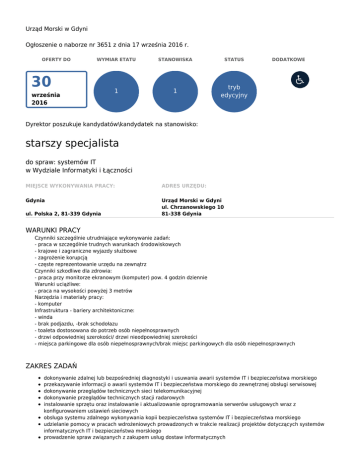 Urząd Morski w Gdyni Ogłoszenie o naborze nr 3651 z dnia 17 września 2016 r. OFERTY DO WYMIAR ETATU STANOWISKA STATUS 1 1 tryb edycyjny 30 września 2016 DODATKOWE Dyrektor poszukuje kandydatów\kandydatek na stanowisko: starszy specjalista do spraw: systemów IT w Wydziale Informatyki i Łączności MIEJSCE WYKONYWANIA PRACY: ADRES URZĘDU: Gdynia Urząd Morski w Gdyni ul. Chrzanowskiego 10 81-338 Gdynia ul. Polska 2, 81-339 Gdynia WARUNKI PRACY Czynniki szczególnie utrudniające wykonywanie zadań: - praca w szczególnie trudnych warunkach środowiskowych - krajowe i zagraniczne wyjazdy służbowe - zagrożenie korupcją - częste reprezentowanie urzędu na zewnątrz Czynniki szkodliwe dla zdrowia: - praca przy monitorze ekranowym (komputer) pow. 4 godzin dziennie Warunki uciążliwe: - praca na wysokości powyżej 3 metrów Narzędzia i materiały pracy: - komputer Infrastruktura - bariery architektoniczne: - winda - brak podjazdu, -brak schodołazu - toaleta dostosowana do potrzeb osób niepełnosprawnych - drzwi odpowiedniej szerokości/ drzwi nieodpowiedniej szerokości - miejsca parkingowe dla osób niepełnosprawnych/brak miejsc parkingowych dla osób niepełnosprawnych ZAKRES ZADAŃ dokonywanie zdalnej lub bezpośredniej diagnostyki i usuwania awarii systemów IT i bezpieczeństwa morskiego przekazywanie informacji o awarii systemów IT i bezpieczeństwa morskiego do zewnętrznej obsługi serwisowej dokonywanie przeglądów technicznych sieci telekomunikacyjnej dokonywanie przeglądów technicznych stacji radarowych instalowanie sprzętu oraz instalowanie i aktualizowanie oprogramowania serwerów usługowych wraz z konfigurowaniem ustawień sieciowych obsługa systemu zdalnego wykonywania kopii bezpieczeństwa systemów IT i bezpieczeństwa morskiego udzielanie pomocy w pracach wdrożeniowych prowadzonych w trakcie realizacji projektów dotyczących systemów informatycznych IT i bezpieczeństwa morskiego prowadzenie spraw związanych z zakupem usług dostaw informatycznych WYMAGANIA NIEZBĘDNE Wykształcenie: wyższe na kierunku informatyka, informatyka i ekonometria, elektronika i telekomunikacja, zarządzanie i inżynieria produkcji doświadczenie zawodowe: 2 lata w obszarze informatyki komunikatywna znajomość języka angielskiego (A2 wg ESOKJ) umiejętność administrowania aktywnymi urządzeniami sieciowymi wiedza z zakresu bezpieczeństwo sieciowe, bezpieczeństwo systemów operacyjnych i informatycznych wiedza z zakresu platform serwerowych: Microsoft Windows i Unix/Linux znajomość strukturalnego języka zapytań – SQL umiejętność zarządzania systemami bazodanowymi Posiadanie obywatelstwa polskiego Korzystanie z pełni praw publicznych Nieskazanie prawomocnym wyrokiem za umyślne przestępstwo lub umyśle przestępstwo skarbowe WYMAGANIA DODATKOWE doświadczenie zawodowe: 3 lata w obszarze informatyki dyplom ukończenia studiów podyplomowych w zakresie informatyka lub zarządzania projektami posiadanie certyfikatów administratora baz danych Oracle i MS SQL, certyfikatów Microsoft MCTS, certyfikatów sieciowych CCNA, CCNP posiadanie uprawnień do zajmowania się eksploatacją urządzeń, instalacji i sieci na stanowisku eksploatacji (świadectwo kwalifikacyjne E/1) bardzo dobra znajomość języka angielskiego (B2 wg ESOKJ) znajomość współczesnych języków programowania: strukturalnych i obiektowych umiejętność tworzenia skryptów znajomość XHTML i XML znajomość projektowania systemów IT znajomość zagadnień sieciowych IP/MPLS DOKUMENTY I OŚWIADCZENIA NIEZBĘDNE Życiorys/CV i list motywacyjny Kopie dokumentów potwierdzających spełnienie wymagania niezbędnego w zakresie wykształcenia Kopie dokumentów potwierdzających spełnienie wymagania niezbędnego w zakresie doświadczenia zawodowego / stażu pracy Oświadczenie o posiadaniu obywatelstwa polskiego albo kopia dokumentu potwierdzającego posiadanie polskiego obywatelstwa Oświadczenie o wyrażeniu zgody na przetwarzanie danych osobowych do celów naboru Oświadczenie o korzystaniu z pełni praw publicznych Oświadczenie o nieskazaniu prawomocnym wyrokiem za umyślne przestępstwo lub umyślne przestępstwo skarbowe DOKUMENTY I OŚWIADCZENIA DODATKOWE kopia dokumentu potwierdzającego niepełnosprawność - w przypadku kandydatek/kandydatów, zamierzających skorzystać z pierwszeństwa w zatrudnieniu w przypadku, gdy znajdą się w gronie najlepszych kandydatek/kandydatów Kopie dokumentów potwierdzających spełnienie wymagania dodatkowego w zakresie doświadczenia zawodowego / stażu pracy TERMINY I MIEJSCE SKŁADANIA DOKUMENTÓW Dokumenty należy złożyć do: 30 września 2016 r. Decyduje data: stempla pocztowego / osobistego dostarczenia oferty do urzędu Miejsce składania dokumentów: Urząd Morski w Gdyni Kancelaria Ogólna ul. Chrzanowskiego 10 81-338 Gdynia z dopiskiem: Nr ogłoszenia o naborze…………. INNE INFORMACJE: W miesiącu poprzedzającym datę upublicznienia ogłoszenia wskaźnik zatrudnienia osób niepełnosprawnych w urzędzie, w rozumieniu przepisów o rehabilitacji zawodowej i społecznej oraz zatrudnianiu osób niepełnosprawnych, nie wynosi co najmniej 6%. • oferty niekompletne, w tym brak własnoręcznie podpisanych listu motywacyjnego i wymaganych oświadczeń oraz złożone po terminie nie będą rozpatrywane (decyduje data stempla pocztowego) • Urząd poinformuje osoby, które zakwalifikowały się do poszczególnych etapów naboru telefoniczne lub drogą elektroniczną, a brak kontaktu jest równoznaczny z niezakwalifikowaniem kandydata do dalszych etapów naboru • aplikacje odrzucone zostaną komisyjnie zniszczone • proponowane wynagrodzenie zasadnicze brutto 3 258,61-3 742,06 zł • do składania ofert zachęcamy również osoby niepełnosprawne, które spełniają wymagania określone w ogłoszeniu • dodatkowe informacje można uzyskać pod nr. tel. : 58 355 37 50 lub 58 355 31 72 Legenda Pierwszeństwo dla osób z niepełnosprawno