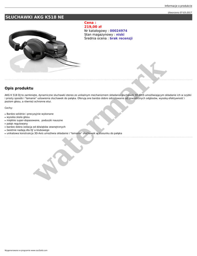 Informacje o produkcie Utworzono 07-03-2017 SŁUCHAWKI AKG K518 NE Cena : 219,00 zł Opis produktu er m ar k Nr katalogowy : 00024974 Stan magazynowy : niski Średnia ocena : brak recenzji AKG K 518 DJ to zamknięte, dynamiczne słuchawki stereo ze unikalnym mechanizmem składania słuchawek 3D-AXIS umożliwiającym składanie ich w szybki i prosty sposób i "łamanie" ustawienia słuchawek do pałąka. Oferują one bardzo dobre odizolowanie od zewnętrznych odgłosów, wysoką efektywność i poziom głosu, a również ochronne etui. Cechy: ● ● ● ● ● ● w at ● Bardzo solidnie i precyzyjnie wykonane wysoka skala głosu miękkie super-dopasowane, poduszki nauszne pałąk regulowany bardzo dobra izolacja od dźwięków zewnętrznych świetnie nadają dla DJ`a klubowego unikatowa konstrukcja 3D-Axis umożliwia składanie i "łamanie" słuchawek w stosunku do pałąka Wygenerowano w programie www.oscGold.com