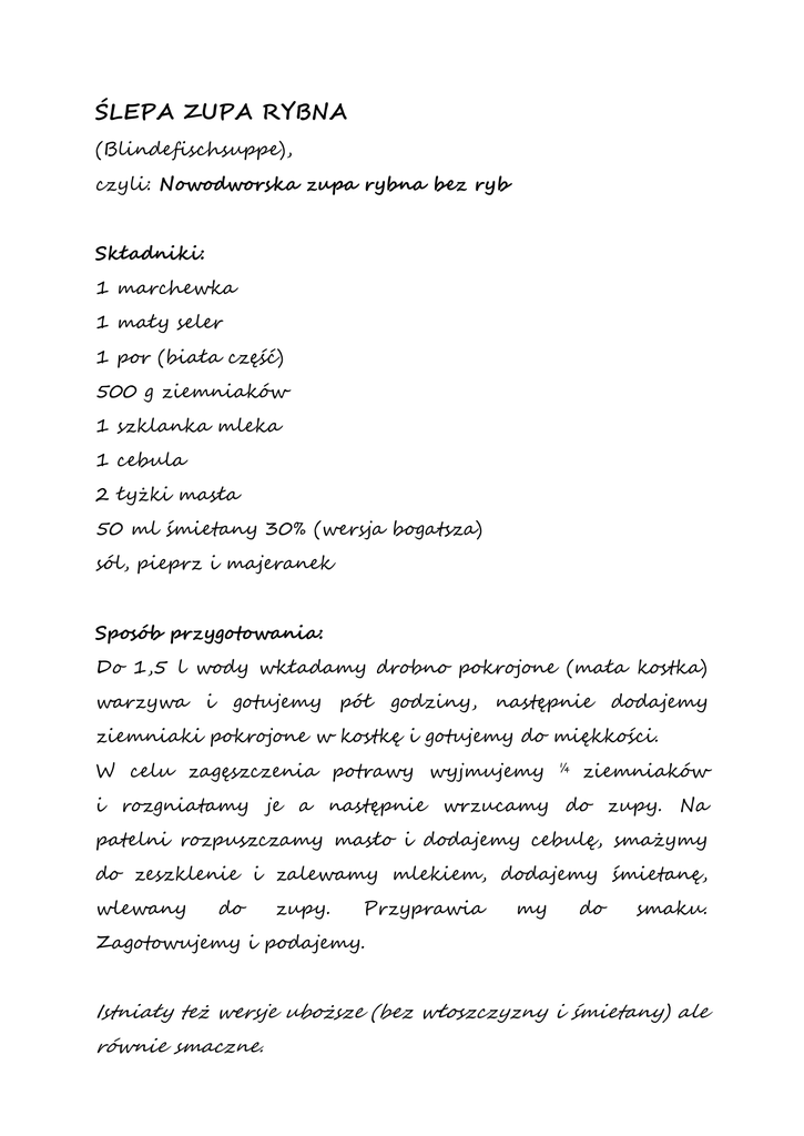 ŚLEPA ZUPA RYBNA (Blindefischsuppe), czyli: Nowodworska zupa rybna bez ryb Składniki: 1 marchewka 1 mały seler 1 por (biała część) 500 g ziemniaków 1 szklanka mleka 1 cebula 2 łyżki masła 50 ml śmietany 30% (wersja bogatsza) sól, pieprz i majeranek Sposób przygotowania: Do 1,5 l wody wkładamy drobno pokrojone (mała kostka) warzywa i gotujemy pół godziny, następnie dodajemy ziemniaki pokrojone w kostkę i gotujemy do miękkości. W celu zagęszczenia potrawy wyjmujemy ¼ ziemniaków i rozgniatamy je a następnie wrzucamy do zupy. Na patelni rozpuszczamy masło i dodajemy cebulę, smażymy do zeszklenie i zalewamy mlekiem, dodajemy śmietanę, wlewany do zupy. Przyprawia my do smaku. Zagotowujemy i podajemy. Istniały też wersje uboższe (bez włoszczyzny i śmietany) ale równie smaczne.