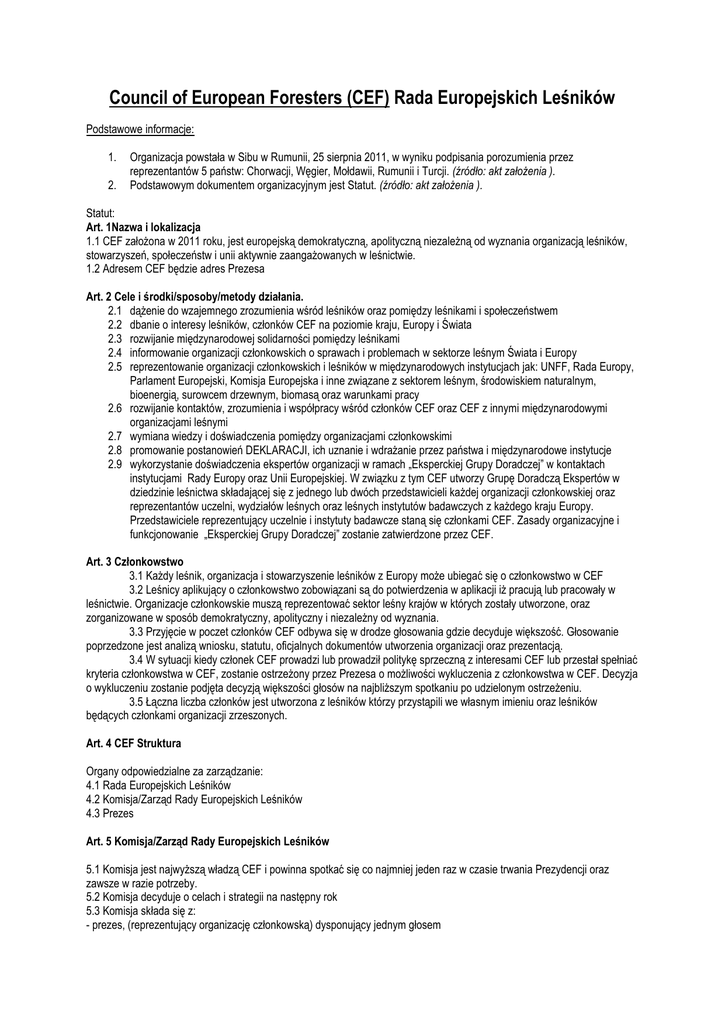 Council of European Foresters (CEF) Rada Europejskich Leśników Podstawowe informacje: 1. 2. Organizacja powstała w Sibu w Rumunii, 25 sierpnia 2011, w wyniku podpisania porozumienia przez reprezentantów 5 państw: Chorwacji, Węgier, Mołdawii, Rumunii i Turcji. (źródło: akt założenia ). Podstawowym dokumentem organizacyjnym jest Statut. (źródło: akt założenia ). Statut: Art. 1Nazwa i lokalizacja 1.1 CEF założona w 2011 roku, jest europejską demokratyczną, apolityczną niezależną od wyznania organizacją leśników, stowarzyszeń, społeczeństw i unii aktywnie zaangażowanych w leśnictwie. 1.2 Adresem CEF będzie adres Prezesa Art. 2 Cele i środki/sposoby/metody działania. 2.1 dążenie do wzajemnego zrozumienia wśród leśników oraz pomiędzy leśnikami i społeczeństwem 2.2 dbanie o interesy leśników, członków CEF na poziomie kraju, Europy i Świata 2.3 rozwijanie międzynarodowej solidarności pomiędzy leśnikami 2.4 informowanie organizacji członkowskich o sprawach i problemach w sektorze leśnym Świata i Europy 2.5 reprezentowanie organizacji członkowskich i leśników w międzynarodowych instytucjach jak: UNFF, Rada Europy, Parlament Europejski, Komisja Europejska i inne związane z sektorem leśnym, środowiskiem naturalnym, bioenergią, surowcem drzewnym, biomasą oraz warunkami pracy 2.6 rozwijanie kontaktów, zrozumienia i współpracy wśród członków CEF oraz CEF z innymi międzynarodowymi organizacjami leśnymi 2.7 wymiana wiedzy i doświadczenia pomiędzy organizacjami członkowskimi 2.8 promowanie postanowień DEKLARACJI, ich uznanie i wdrażanie przez państwa i międzynarodowe instytucje 2.9 wykorzystanie doświadczenia ekspertów organizacji w ramach „Eksperckiej Grupy Doradczej” w kontaktach instytucjami Rady Europy oraz Unii Europejskiej. W związku z tym CEF utworzy Grupę Doradczą Ekspertów w dziedzinie leśnictwa składającej się z jednego lub dwóch przedstawicieli każdej organizacji członkowskiej oraz reprezentantów uczelni, wydziałów leśnych oraz leśnych instytutów badawczych z każdego kraju Europy. Przedstawiciele reprezentujący uczelnie i instytuty badawcze staną się członkami CEF. Zasady organizacyjne i funkcjonowanie „Eksperckiej Grupy Doradczej” zostanie zatwierdzone przez CEF. Art. 3 Członkowstwo 3.1 Każdy leśnik, organizacja i stowarzyszenie leśników z Europy może ubiegać się o członkowstwo w CEF 3.2 Leśnicy aplikujący o członkowstwo zobowiązani są do potwierdzenia w aplikacji iż pracują lub pracowały w leśnictwie. Organizacje członkowskie muszą reprezentować sektor leśny krajów w których zostały utworzone, oraz zorganizowane w sposób demokratyczny, apolityczny i niezależny od wyznania. 3.3 Przyjęcie w poczet członków CEF odbywa się w drodze głosowania gdzie decyduje większość. Głosowanie poprzedzone jest analizą wniosku, statutu, oficjalnych dokumentów utworzenia organizacji oraz prezentacją. 3.4 W sytuacji kiedy członek CEF prowadzi lub prowadził politykę sprzeczną z interesami CEF lub przestał spełniać kryteria członkowstwa w CEF, zostanie ostrzeżony przez Prezesa o możliwości wykluczenia z członkowstwa w CEF. Decyzja o wykluczeniu zostanie podjęta decyzją większości głosów na najbliższym spotkaniu po udzielonym ostrzeżeniu. 3.5 Łączna liczba członków jest utworzona z leśników którzy przystąpili we własnym imieniu oraz leśników będących członkami organizacji zrzeszonych. Art. 4 CEF Struktura Organy odpowiedzialne za zarządzanie: 4.1 Rada Europejskich Leśników 4.2 Komisja/Zarząd Rady Europejskich Leśników 4.3 Prezes Art. 5 Komisja/Zarząd Rady Europejskich Leśników 5.1 Komisja jest najwyższą władzą CEF i powinna spotkać się co najmniej jeden raz w czasie trwania Prezydencji oraz zawsze w razie potrzeby. 5.2 Komisja decyduje o celach i strategii na następny rok 5.3 Komisja składa się z: - prezes, (reprezentujący organizację członkowską) dysponujący jednym głosem - vice prezes, (każda organizacja członkowska ma reprezentanta w randze vice prezesa) dysponuje jednym głosem - leśnicy indywidualni, każdy kraj dysponuje jednym głosem 5.4 Koszty udziału w spotkaniach komisji powinny być finansowane przez ich organizacje 5.5 Kworum dla Komisji jest obecność 2/3 organizacji członkowskich 5.6 Decyzje Komisji są przyjmowane większością głosów 5.7 Inne członkowie i organizacje członkowskie mogą brać udział w spotkaniach Komisji jako obserwatorzy Art. 6 Prezes 6.1 W kontaktach międzynarodowych osobą reprezentującą interesy CEF jest Prezes 6.2 Prezes wybierany jest na okres jednego roku. Komisja decyduje o kolejności krajów obejmujących prezydencję. Lista krajów do prezydentury w CEF zostanie sporządzona w oparciu o termin przystąpienia kraju do CEF. Powtórna prezydentura jest możliwa w sytuacji kiedy wszystkie kraje dzierżyły tą pozycję lub jej odmówiły. 6.3 Prezes powinien uczestniczyć we wszystkich ważnych spotkaniach oraz prezentować stanowisko CEF, stanowione przez Komisję CEF. 6.4 Prezes powinien w każdym miesiącu informować organizacje członkowskie o CEF i swojej działalności. 6.5 Prezes musi stosować odpowiedni personel i logistykę dla dobrego funkcjonowania CEF Należy zapewnić kontynuację funkcjonowania CEF, strony internetowej, a koszty są pokrywane przez organizację dzierżącą prezydenturę. Wszystkie koszt związane z działalnością Prezesa, łącznie z udziałem w spotkaniach międzynarodowych powinny być finansowane przez organizację Prezesa. 6.6 W interesie CEF i kontynuacji funkcjonowania, działalność Prezesa jest wspierana przez byłego i przyszłego Prezesa CEF. Jego działalność jest również wspierana przez Prezesa „Eksperckiej Grupy Doradczej”. W związku z powyższym wszystkie koszty związane z działalności byłego i przyszłego Prezesa łącznie z udziałem w międzynarodowych spotkaniach wspierane są przez Prezes