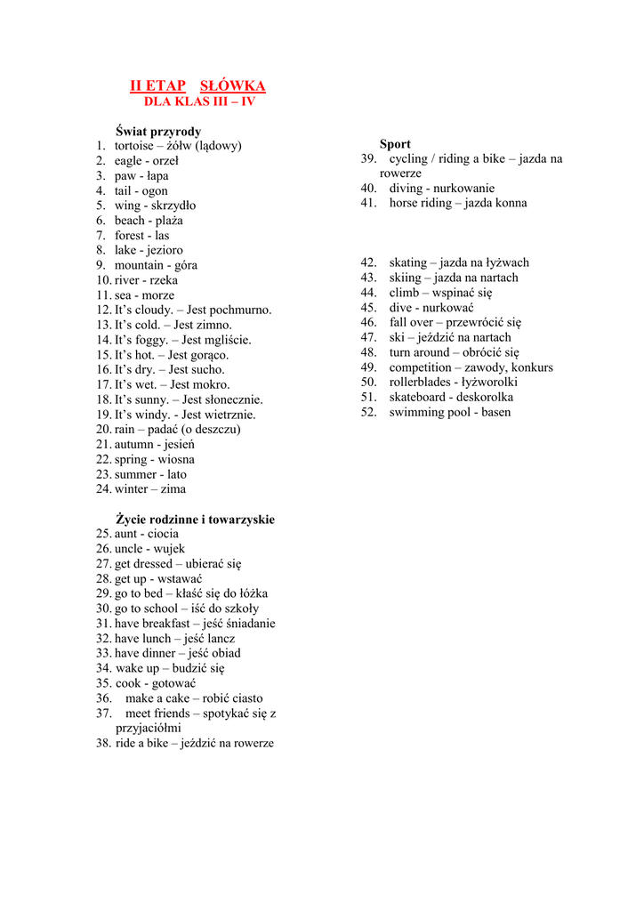 II ETAP SŁÓWKA DLA KLAS III – IV Świat przyrody 1. tortoise – żółw (lądowy) 2. eagle - orzeł 3. paw - łapa 4. tail - ogon 5. wing - skrzydło 6. beach - plaża 7. forest - las 8. lake - jezioro 9. mountain - góra 10. river - rzeka 11. sea - morze 12. It’s cloudy. – Jest pochmurno. 13. It’s cold. – Jest zimno. 14. It’s foggy. – Jest mgliście. 15. It’s hot. – Jest gorąco. 16. It’s dry. – Jest sucho. 17. It’s wet. – Jest mokro. 18. It’s sunny. – Jest słonecznie. 19. It’s windy. - Jest wietrznie. 20. rain – padać (o deszczu) 21. autumn - jesień 22. spring - wiosna 23. summer - lato 24. winter – zima Życie rodzinne i towarzyskie 25. aunt - ciocia 26. uncle - wujek 27. get dressed – ubierać się 28. get up - wstawać 29. go to bed – kłaść się do łóżka 30. go to school – iść do szkoły 31. have breakfast – jeść śniadanie 32. have lunch – jeść lancz 33. have dinner – jeść obiad 34. wake up – budzić się 35. cook - gotować 36. make a cake – robić ciasto 37. meet friends – spotykać się z przyjaciółmi 38. ride a bike – jeździć na rowerze Sport 39. cycling / riding a bike – jazda na rowerze 40. diving - nurkowanie 41. horse riding – jazda konna 42. 43. 44. 45. 46. 47. 48. 49. 50. 51. 52. skating – jazda na łyżwach skiing – jazda na nartach climb – wspinać się dive - nurkować fall over – przewrócić się ski – jeździć na nartach turn around – obrócić się competition – zawody, konkurs rollerblades - łyżworolki skateboard - deskorolka swimming pool - basen