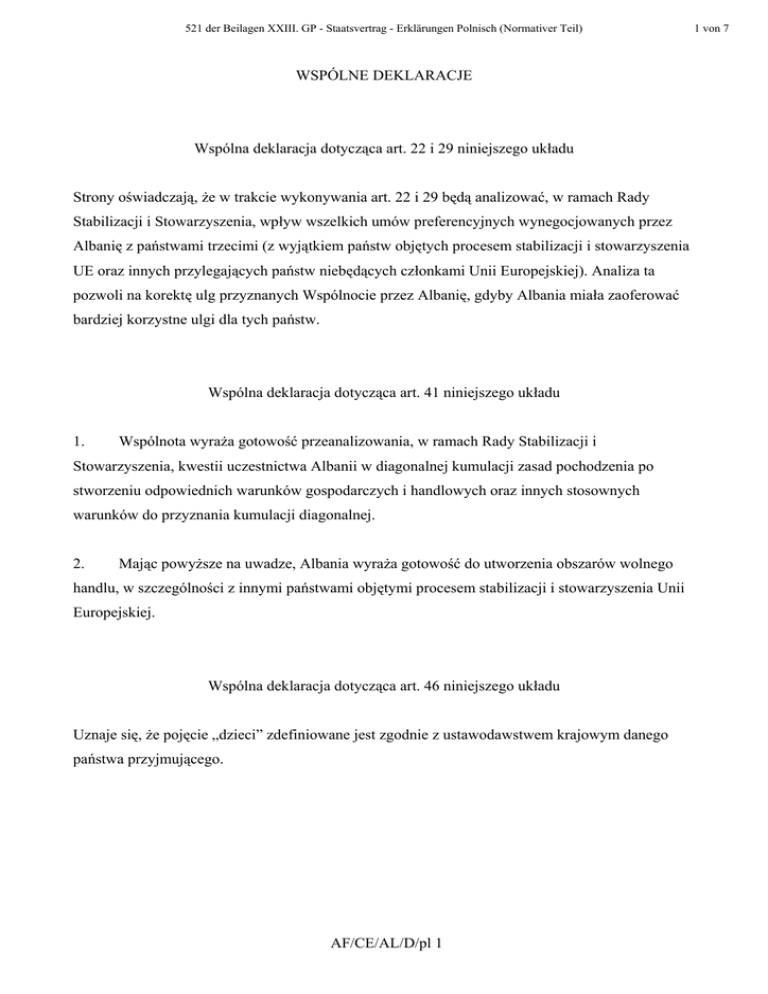 521 der Beilagen XXIII. GP - Staatsvertrag - Erklärungen Polnisch (Normativer Teil) WSPÓLNE DEKLARACJE Wspólna deklaracja dotycząca art. 22 i 29 niniejszego układu Strony oświadczają, że w trakcie wykonywania art. 22 i 29 będą analizować, w ramach Rady Stabilizacji i Stowarzyszenia, wpływ wszelkich umów preferencyjnych wynegocjowanych przez Albanię z państwami trzecimi (z wyjątkiem państw objętych procesem stabilizacji i stowarzyszenia UE oraz innych przylegających państw niebędących członkami Unii Europejskiej). Analiza ta pozwoli na korektę ulg przyznanych Wspólnocie przez Albanię, gdyby Albania miała zaoferować bardziej korzystne ulgi dla tych państw. Wspólna deklaracja dotycząca art. 41 niniejszego układu 1. Wspólnota wyraża gotowość przeanalizowania, w ramach Rady Stabilizacji i Stowarzyszenia, kwestii uczestnictwa Albanii w diagonalnej kumulacji zasad pochodzenia po stworzeniu odpowiednich warunków gospodarczych i handlowych oraz innych stosownych warunków do przyznania kumulacji diagonalnej. 2. Mając powyższe na uwadze, Albania wyraża gotowość do utworzenia obszarów wolnego handlu, w szczególności z innymi państwami objętymi procesem stabilizacji i stowarzyszenia Unii Europejskiej. Wspólna deklaracja dotycząca art. 46 niniejszego układu Uznaje się, że pojęcie „dzieci” zdefiniowane jest zgodnie z ustawodawstwem krajowym danego państwa przyjmującego. AF/CE/AL/D/pl 1 1 von 7 2 von 7 521 der Beilagen XXIII. GP - Staatsvertrag - Erklärungen Polnisch (Normativer Teil) Wspólna deklaracja dotycząca art. 48 niniejszego układu Uznaje się, że pojęcie „członkowie ich rodzin” zdefiniowane jest zgodnie z ustawodawstwem krajowym danego państwa przyjmującego. Wspólna deklaracja dotycząca art. 61 niniejszego układu Strony uzgadniają, że postanowienia zawarte w art. 61 nie będą interpretowane w sposób uniemożliwiający wprowadzenie proporcjonalnych, niedyskryminujących ograniczeń w nabywaniu nieruchomości opartych na interesie ogólnym, ani w żaden inny sposób nie będą wpływać na zasady rządzące systemem własności Stron, z wyjątkiem postanowień zawartych we wspomnianym artykule. Uznaje się, że nabywanie nieruchomości przez obywateli Albanii jest dozwolone w państwach członkowskich Unii Europejskiej zgodnie z obowiązującym prawem wspólnotowym, z zastrzeżeniem określonych wyjątków w nim przewidzianych i zastosowanych zgodnie z obowiązującym ustawodawstwem krajowym państw członkowskich Unii Europejskiej. Wspólna deklaracja dotycząca art. 73 niniejszego układu Strony uzgadniają, że do celów niniejszego układu określenie własność intelektualna, przemysłowa i handlowa obejmuje w szczególności prawa autorskie, w tym prawa autorskie do programu komputerowego, a także prawa pokrewne, prawa odnoszące się do baz danych, patentów, wzorów przemysłowych, znaków towarowych i usługowych, topografii obwodów scalonych oraz oznaczeń geograficznych, w tym nazw pochodzenia, jak również ochronę przed nieuczciwą konkurencją, określoną w artykule 10a Konwencji paryskiej o ochronie własności przemysłowej i ochronę informacji niejawnych dotyczących know-how. AF/CE/AL/D/pl 2 521 der Beilagen XXIII. GP - Staatsvertrag - Erklärungen Polnisch (Normativer Teil) Wspólna deklaracja dotycząca art. 80 niniejszego układu Strony są świadome znaczenia, jakie społeczeństwo i rząd Albanii przywiązują do perspektywy liberalizacji systemu wizowego. W międzyczasie postęp w tej kwestii uzależniony jest od przeprowadzenia przez Albanię zasadniczych reform w takich dziedzinach jak umacnianie państwa prawa, zwalczanie przestępczości zorganizowanej, korupcji i nielegalnej migracji oraz od poprawy zdolności administracyjnej w zakresie kontroli granicznej i zabezpieczeń dokumentów. Wspólna deklaracja dotycząca art. 126 niniejszego układu 1. Do celów interpretacji i praktycznego stosowania niniejszego układu Strony uzgadniają, że przypadki szczególnie pilne, o których mowa w art. 126 niniejszego układu oznaczają przypadki istotnego naruszenia postanowień układu przez jedną ze Stron. Istotne naruszenie układu polega na: – odrzuceniu niniejszego układu nieznajdującym uzasadnienia w zasadach ogólnych prawa międzynarodowego; oraz – 2. naruszeniu istotnych elementów niniejszego układu, określonych w art. 2. Strony uzgadniają, że „odpowiednie środki”, o których mowa w art. 126, oznaczają środki podjęte zgodnie z prawem międzynarodowym. Jeśli jedna ze Stron podejmie jakiś środek w szczególnie pilnym przypadku zgodnie z art. 126, druga Strona może skorzystać z procedury rozstrzygania sporów. AF/CE/AL/D/pl 3 3 von 7 4 von 7 521 der Beilagen XXIII. GP - Staatsvertrag - Erklärungen Polnisch (Normativer Teil) Wspólna deklaracja dotycząca legalnej migracji, swobodnego przepływu i praw pracowników Przyznawanie, przedłużanie lub odmowa udzielenia zezwolenia na pobyt regulowane są ustawodawstwem każdego państwa członkowskiego oraz obowiązującymi dwustronnymi porozumieniami i konwencjami między Albanią a danympaństwem członkowskim. Wspólna deklaracja dotycząca Księstwa Andory w sprawie protokołu 4 niniejszego układu 1. Produkty pochodzące z Księstwa Andory objęte działami 25-97 systemu zharmonizowanego są uznawane przez Albanię za produkty pochodzące ze Wspólnoty w rozumieniu niniejszego układu. 2. Protokół 4 stosuje się mutatis mutandis do celów określenia statusu pochodzenia wyżej wymienionych produktów. Wspólna deklaracja dotycząca Republiki San Marino w sprawie protokołu 4 niniejszego układu 1. Produkty pochodzące z Republiki San Marino są uznawane przez Albanię za produkty pochodzące ze Wspólnoty w rozumieniu niniejszego układu. 2. Protokół 4 stosuje się mutatis mutandis do celów określenia statusu pochodzenia wyżej wymienionych produktów. AF/CE/AL/D/pl 4 521 der Beilagen XXIII. GP - Staatsvert