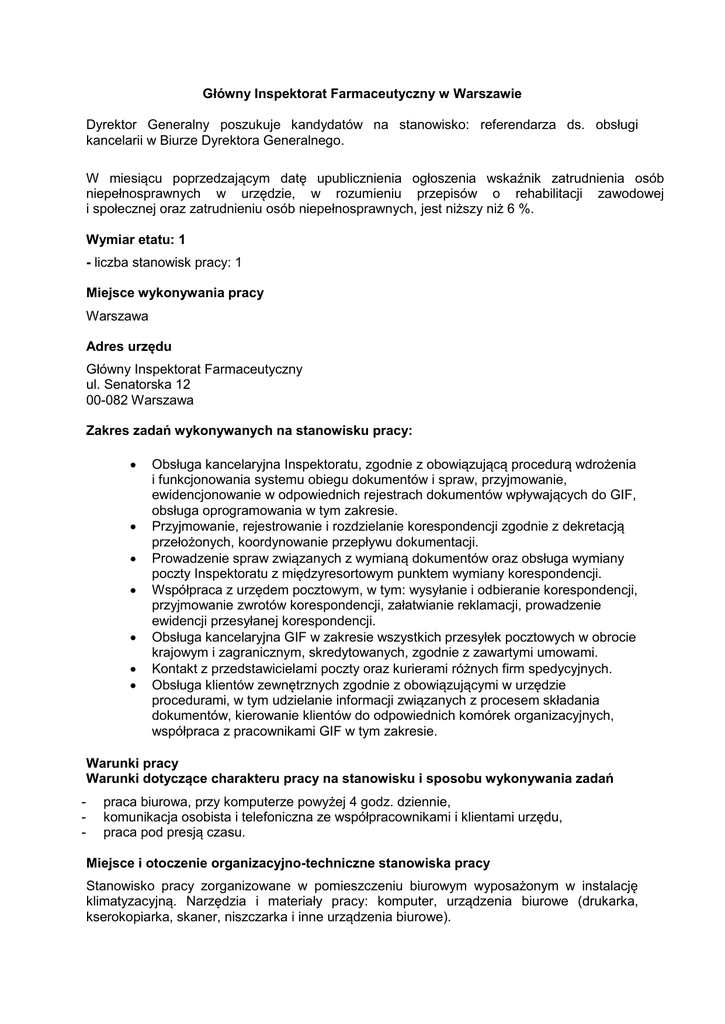 Główny Inspektorat Farmaceutyczny w Warszawie Dyrektor Generalny poszukuje kandydatów na stanowisko: referendarza ds. obsługi kancelarii w Biurze Dyrektora Generalnego. W miesiącu poprzedzającym datę upublicznienia ogłoszenia wskaźnik zatrudnienia osób niepełnosprawnych w urzędzie, w rozumieniu przepisów o rehabilitacji zawodowej i społecznej oraz zatrudnieniu osób niepełnosprawnych, jest niższy niż 6 %. Wymiar etatu: 1 - liczba stanowisk pracy: 1 Miejsce wykonywania pracy Warszawa Adres urzędu Główny Inspektorat Farmaceutyczny ul. Senatorska 12 00-082 Warszawa Zakres zadań wykonywanych na stanowisku pracy: Obsługa kancelaryjna Inspektoratu, zgodnie z obowiązującą procedurą wdrożenia i funkcjonowania systemu obiegu dokumentów i spraw, przyjmowanie, ewidencjonowanie w odpowiednich rejestrach dokumentów wpływających do GIF, obsługa oprogramowania w tym zakresie. Przyjmowanie, rejestrowanie i rozdzielanie korespondencji zgodnie z dekretacją przełożonych, koordynowanie przepływu dokumentacji. Prowadzenie spraw związanych z wymianą dokumentów oraz obsługa wymiany poczty Inspektoratu z międzyresortowym punktem wymiany korespondencji. Współpraca z urzędem pocztowym, w tym: wysyłanie i odbieranie korespondencji, przyjmowanie zwrotów korespondencji, załatwianie reklamacji, prowadzenie ewidencji przesyłanej korespondencji. Obsługa kancelaryjna GIF w zakresie wszystkich przesyłek pocztowych w obrocie krajowym i zagranicznym, skredytowanych, zgodnie z zawartymi umowami. Kontakt z przedstawicielami poczty oraz kurierami różnych firm spedycyjnych. Obsługa klientów zewnętrznych zgodnie z obowiązującymi w urzędzie procedurami, w tym udzielanie informacji związanych z procesem składania dokumentów, kierowanie klientów do odpowiednich komórek organizacyjnych, współpraca z pracownikami GIF w tym zakresie. Warunki pracy Warunki dotyczące charakteru pracy na stanowisku i sposobu wykonywania zadań - praca biurowa, przy komputerze powyżej 4 godz. dziennie, komunikacja osobista i telefoniczna ze współpracownikami i klientami urzędu, praca pod presją czasu. Miejsce i otoczenie organizacyjno-techniczne stanowiska pracy Stanowisko pracy zorganizowane w pomieszczeniu biurowym wyposażonym w instalację klimatyzacyjną. Narzędzia i materiały pracy: komputer, urządzenia biurowe (drukarka, kserokopiarka, skaner, niszczarka i inne urządzenia biurowe). Budynek posiada windę osobową do transportu pionowego, nie posiada podjazdów dla osób niepełnosprawnych, ale jest wyposażony w transporter gąsiennicowy typu T09 "ROBY" służący do transportu po schodach wejściowych do budynku osób poruszających się na wózkach inwalidzkich. Pomieszczenia pracy GIF mieszczą się na parterze, I oraz III piętrze budynku. Wymagania związane ze stanowiskiem pracy: Niezbędne: - wykształcenie: wyższe - doświadczenie: 1 rok doświadczenia zawodowego na stanowisku związanym z obsługą kancelaryjną lub w recepcji. - pozostałe wymagania niezbędne: - znajomość struktury organizacyjnej urzędu oraz jego zadań. - wymagania dodatkowe: - komunikatywność, - umiejętność organizacji pracy własnej, - odporność na stres. Wymagane dokumenty i oświadczenia: - życiorys i list motywacyjny, - kopie dokumentów potwierdzających wykształcenie, - kopia dokumentu potwierdzającego posiadanie polskiego obywatelstwa lub oświadczenie o posiadaniu obywatelstwa polskiego, - oświadczenie kandydata o korzystaniu z pełni praw publicznych, - oświadczenie kandydata o nieskazaniu prawomocnym wyrokiem za umyślne przestępstwo lub umyślne przestępstwo skarbowe, - oświadczenie kandydata o wyrażeniu zgody na przetwarzanie danych osobowych do celów rekrutacji, - kopie dokumentów potwierdzających 1 rok doświadczenia na stanowisku związanym z obsługą kancelaryjną lub w recepcji. Inne dokumenty i oświadczenia: Kopia dokumentu potwierdzającego niepełnosprawność - w przypadku kandydatów, którzy zamierzają skorzystać z pierwszeństwa w zatrudnieniu w przypadku, gdy znajdą się w gronie najlepszych kandydatów. Termin składania dokumentów: 18 kwietnia 2016 r. Miejsce składania dokumentów: Główny Inspektorat Farmaceutyczny ul. Senatorska 12 00-082 Warszawa z dopiskiem „Referendarz ds. obsługi kancelarii w Biurze Dyrektora Generalnego”. Inne informacje: Nasz urząd jest pracodawcą równych szans i wszystkie aplikacje są rozważane z równą uwagą bez względu na płeć, wiek, niepełnosprawność, rasę, narodowość, przekonania polityczne, przynależność związkową, pochodzenie etniczne, wyznanie, orientację seksualną czy też jakąkolwiek inną cechę prawnie chronioną. Oferty otrzymane po terminie nie będą rozpatrywane. W przypadku przesłania oferty drogą pocztową decyduje data wpływu do urzędu. Przed złożeniem aplikacji prosimy o zapoznanie się z informacjami zamieszczonymi na stronie www.gif.gov.pl w zakładce Urząd - Ogłoszenia o pracy. Wymagane oświadczenia, życiorys i list motywacyjny muszą być własnoręcznie podpisane. Kandydaci spełniający wymagania formalne zostaną zakwalifikowani do dalszych etapów naboru, o czym zostaną powiadomieni telefonicznie lub e-mailem. Osoby, których oferty zostaną rozpatrzone negatywnie nie będą o tym informowane. Oferty osób niezakwalifikowanych zostaną komisyjnie zniszczone po zakończeniu procedury naboru. Do składania dokumentów zachęcamy również osoby niepełnosprawne. Dodatkowe informacje można uzyskać pod numerem tel. (22) 44-10-734 lub 735.