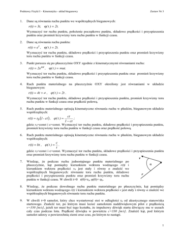 Podstawy Fizyki I – Kinematyka - układ biegunowy 1. Zestaw Nr 3 Dane są równania ruchu punktu we współrzędnych biegunowych: r(t) = 3t, ϕ( t ) = 2t. Wyznaczyć tor ruchu punktu, położenie początkowe punktu, składowe prędkości i przyspieszenia punktu oraz promień krzywizny toru ruchu punktu w funkcji czasu. 2. Dane są równania ruchu punktu: r(t) = e t , ϕ( t ) = 2t. Wyznaczyć tor ruchu punktu, składowe prędkości i przyspieszenia punktu oraz promień krzywizny toru ruchu punktu w funkcji czasu. 3. Punkt porusza się po płaszczyźnie OXY zgodnie z kinematycznymi równaniami ruchu: r(t) = 2e ωt , ϕ( t ) = πωt. Wyznaczyć tor ruchu punktu, składowe prędkości i przyspieszenia punktu oraz promień krzywizny toru ruchu punktu w funkcji czasu. 4. Ruch punktu materialnego na płaszczyźnie OXY określony jest równaniami w układzie biegunowym: r(t) = 4t + π , ϕ ( t ) = 2t . Wyznaczyć tor ruchu punktu, składowe prędkości i przyspieszenia punktu, promień krzywizny toru ruchu punktu w funkcji czasu oraz prędkość polową. 5. Ruch punktu materialnego opisują kinematyczne równania ruchu w płaskim, biegunowym układzie współrzędnych: r(t) = r0 (1 - ct ) , ϕ ( t ) = ct ; 1 − ct gdzie r0=const i c=const. Wyznaczyć tor ruchu punktu, składowe prędkości i przyspieszenia punktu, promień krzywizny toru ruchu punktu w funkcji czasu oraz prędkość polową. 6. Ruch punktu materialnego opisują kinematyczne równania ruchu w płaskim, biegunowym układzie współrzędnych: r(t) = bt , ϕ ( t ) = c . t gdzie r0=const i c=const. Wyznaczyć tor ruchu punktu, składowe prędkości i przyspieszenia punktu oraz promień krzywizny toru ruchu punktu w funkcji czasu. v 7. Wiedząc, że podczas ruchu jednostajnego punktu materialnego po płaszczyźnie, kąt pomiędzy kierunkiem wektora wodzącego r(t) i kierunkiem wektora prędkości v0 jest stały i równy α znaleźć we współrzędnych biegunowych: równanie toru ruchu punktu, składowe prędkości i przyspieszenia punktu oraz promień krzywizny toru ruchu punktu w funkcji czasu. W chwili t=0 r(0)=r0, ϕ(0)= ϕ0. α r 8. Wiedząc, że podczas dowolnego ruchu punktu materialnego po płaszczyźnie, kąt pomiędzy kierunkiem wektora wodzącego r(t) i kierunkiem wektora prędkości v jest stały i równy α znaleźć we współrzędnych biegunowych równanie toru ruchu punktu. 9. W chwili t=0 samolot, który chce wystartować stoi w odległości r0 od akustycznego stanowiska startowego. Znaleźć tor, po którym musi lecieć samolotem naddźwiękowym pilot z prędkością v=350 [m/s], jeżeli tor musi być tego kształtu, że impulsowy dźwięk startu dźwięczy mu w uszach cały czas podczas lotu. Prędkość dźwięku w powietrzu c=330 [m/s]. Znaleźć kąt, pod którym samolot uderzy o powierzchnię ziemi oraz czas, po którym to nastąpi. 1 Podstawy Fizyki I – Kinematyka - układ biegunowy Zestaw Nr 3 10. Z naroży wielokąta foremnego o boku L o a) trzech, b) pięciu oraz c) sześciu wierzchołkach startują odpowiednio: trzy, pięć albo sześć pająków goniąc się wzajemnie z prędkością vP każdy. Znaleźć równanie dowolnego pająka oraz czas, po którym odległości pomiędzy nimi zmniejszą się do L/2. 11. Punkt przemieszcza się po obracającej się z prędkością ω tarczy o promieniu R wzdłuż promienia tarczy poruszając się od brzegu tarczy w kierunku jej środka z prędkością v0 względem tarczy. Znaleźć równanie toru ruchu punktu, składowe i wartość prędkości oraz przyspieszenia, a także promień krzywizny toru ruchu punktu w funkcji czasu. 12. *Łódka chce dotrzeć z punktu A znajdującego się po jednej stronie rzeki do punktu B znajdującego się po drugiej stronie rzeki jak na rysunku obok. Wiedząc, że prąd w rzece płynie ze stałą wartością vR oraz że łódka płynie ze stałą prędkością u względem wody w ten sposób, że jej wektor prędkości u względem wody jest stale skierowany w kierunku punktu B znaleźć równanie toru ruchu łodzi gdy; a). u>vR oraz b) u=vR. Przyjąć, że w chwili początkowej r(0)=r0 oraz że φ(0)=φ0. Potrzebne wzory: A r0 φ0 u B ∫ (1/sin(ϕ)) dϕ = ln | tg(ϕ/2) | + C ; ∫ (ctg(ϕ)) dϕ = ln | sin(ϕ) | + C . * Zadanie o podwyższonym stopniu trudności. 2