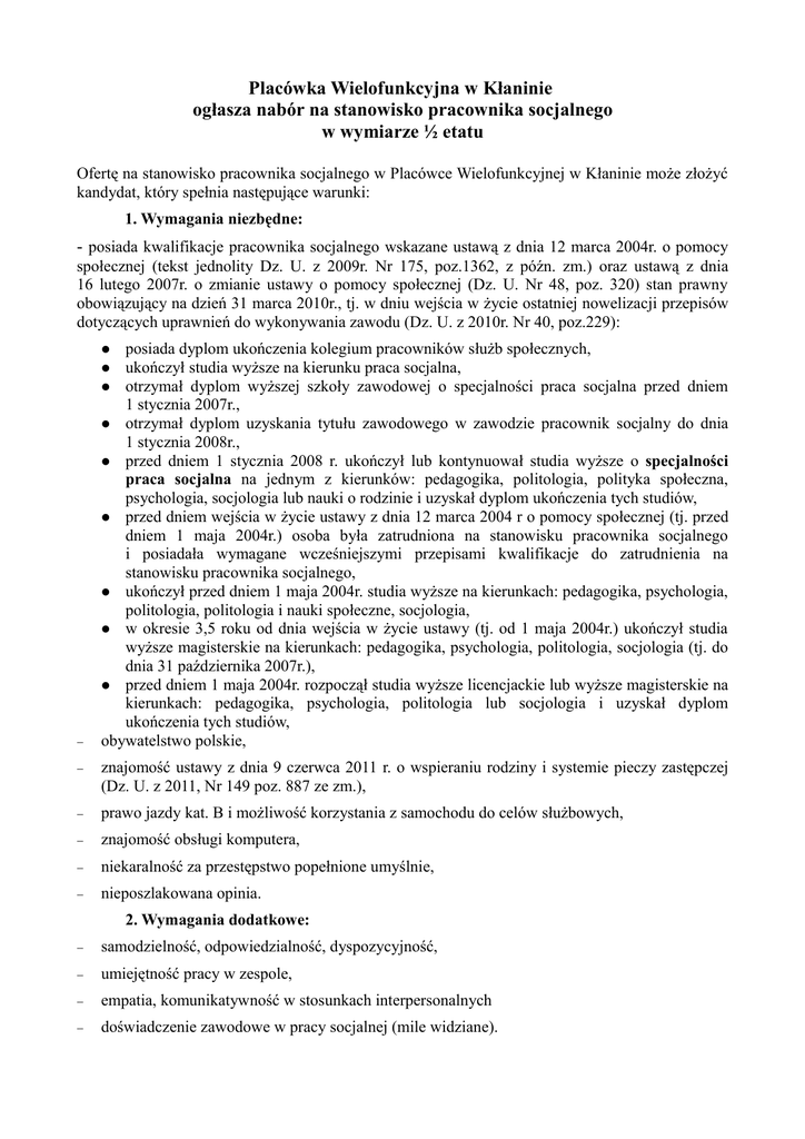 Placówka Wielofunkcyjna w Kłaninie ogłasza nabór na stanowisko pracownika socjalnego w wymiarze ½ etatu Ofertę na stanowisko pracownika socjalnego w Placówce Wielofunkcyjnej w Kłaninie może złożyć kandydat, który spełnia następujące warunki: 1. Wymagania niezbędne: - posiada kwalifikacje pracownika socjalnego wskazane ustawą z dnia 12 marca 2004r. o pomocy społecznej (tekst jednolity Dz. U. z 2009r. Nr 175, poz.1362, z późn. zm.) oraz ustawą z dnia 16 lutego 2007r. o zmianie ustawy o pomocy społecznej (Dz. U. Nr 48, poz. 320) stan prawny obowiązujący na dzień 31 marca 2010r., tj. w dniu wejścia w życie ostatniej nowelizacji przepisów dotyczących uprawnień do wykonywania zawodu (Dz. U. z 2010r. Nr 40, poz.229): posiada dyplom ukończenia kolegium pracowników służb społecznych, ukończył studia wyższe na kierunku praca socjalna, otrzymał dyplom wyższej szkoły zawodowej o specjalności praca socjalna przed dniem 1 stycznia 2007r., otrzymał dyplom uzyskania tytułu zawodowego w zawodzie pracownik socjalny do dnia 1 stycznia 2008r., przed dniem 1 stycznia 2008 r. ukończył lub kontynuował studia wyższe o specjalności praca socjalna na jednym z kierunków: pedagogika, politologia, polityka społeczna, psychologia, socjologia lub nauki o rodzinie i uzyskał dyplom ukończenia tych studiów, przed dniem wejścia w życie ustawy z dnia 12 marca 2004 r o pomocy społecznej (tj. przed dniem 1 maja 2004r.) osoba była zatrudniona na stanowisku pracownika socjalnego i posiadała wymagane wcześniejszymi przepisami kwalifikacje do zatrudnienia na stanowisku pracownika socjalnego, ukończył przed dniem 1 maja 2004r. studia wyższe na kierunkach: pedagogika, psychologia, politologia, politologia i nauki społeczne, socjologia, w okresie 3,5 roku od dnia wejścia w życie ustawy (tj. od 1 maja 2004r.) ukończył studia wyższe magisterskie na kierunkach: pedagogika, psychologia, politologia, socjologia (tj. do dnia 31 października 2007r.), przed dniem 1 maja 2004r. rozpoczął studia wyższe licencjackie lub wyższe magisterskie na kierunkach: pedagogika, psychologia, politologia lub socjologia i uzyskał dyplom ukończenia tych studiów, obywatelstwo polskie, − − znajomość ustawy z dnia 9 czerwca 2011 r. o wspieraniu rodziny i systemie pieczy zastępczej (Dz. U. z 2011, Nr 149 poz. 887 ze zm.), − prawo jazdy kat. B i możliwość korzystania z samochodu do celów służbowych, − znajomość obsługi komputera, − niekaralność za przestępstwo popełnione umyślnie, − nieposzlakowana opinia. 2. Wymagania dodatkowe: − samodzielność, odpowiedzialność, dyspozycyjność, − umiejętność pracy w zespole, − empatia, komunikatywność w stosunkach interpersonalnych − doświadczenie zawodowe w pracy socjalnej (mile widziane). 3. Wymagane dokumenty: − list motywacyjny, − życiorys (CV), − kserokopia dokumentów potwierdzających wykształcenie, − oświadczenie kandydata o niekaralności, − oświadczenie kandydata o braku przeciwwskazań zdrowotnych do pracy na zajmowanym stanowisku, − oświadczenie kandydata wyrażające zgodę na przetwarzanie danych osobowych zawartych w ofercie pracy dla potrzeb rekrutacji zgodnie z obowiązującą ustawą. Zakres wykonywanych zadań na stanowisku Do bezpośrednich obowiązków pracownika socjalnego w Placówce należy: 1. Poszanowanie podmiotowości dziecka i w miarę możliwości uwzględnianie jego wniosków we wszystkich dotyczących go sprawach oraz informowanie dziecka o podejmowanych wobec niego działaniach. 2. Rozpoznawanie sytuacji rodzinnej dziecka. 3. Praca z rodzina dziecka. 4. Inicjacja działań niezbędnych do unormowania sytuacji rodziny i umożliwienie powrotu dziecka do rodziny. 5. Utrzymanie kontaktu z instytucjami wspierającymi rodzinę dziecka. 6. Organizacja zapotrzebowania w niezbędne artykuły codziennego użytku. 7. Dbałość o zachowanie bezpieczeństwa wychowanków na terenie Placówki i poza nią. 8. Prowadzenie dokumentacji wychowanków. 9. Współtworzenie indywidualnych planów pracy. 10. Konsultacje medyczne. 11. Kontakt z kuratorem sądowym, policja, sądem, szkołą, powiatowym centrum pomocy rodzinie, ośrodkami pomocy społecznej, ośrodkami adopcyjno- opiekuńczymi, organizacjami zajmującymi się statutowo pomocą rodzinom. 12. Dbałość o doskonalenie swojego warsztatu pracy, własnych kompetencji i umiejętności zawodowych. 13. Ponadto do obowiązków pracownika socjalnego należy znajomość przepisów prawa dotyczących funkcjonowania placówek opiekuńczo - wychowawczych, postępowania z małoletnimi i innych bezpośrednio związanych z wykonywaną pracą. Rodzaj umowy: Umowa o pracę. Oferty prosimy przesyłać do 20 listopada 2012r. na adres pocztowy: Placówka Wielofunkcyjna w Kłaninie, Kłanino 21, 84-107 Starzyno lub email: [email protected]