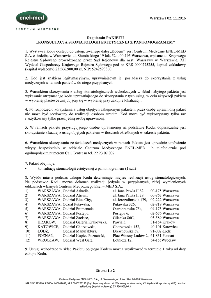 Warszawa 02. 11.2016 Regulamin PAKIETU „KONSULTACJA STOMATOLOGII ESTETYCZNEJ Z PANTOMOGRAMEM” 1. Wystawcą Kodu dostępu do usługi, zwanego dalej „Kodem” jest Centrum Medyczne ENEL-MED S.A. z siedzibą w Warszawie, ul. Słomińskiego 19 lok. 524, 00-195 Warszawa, wpisane do Krajowego Rejestru Sądowego prowadzonego przez Sąd Rejonowy dla m.st. Warszawy w Warszawie, XII Wydział Gospodarczy Krajowego Rejestru Sądowego pod nr KRS 0000275255, kapitał zakładowy (kapitał wpłacony) 23.566.900,00 zł, NIP: 5242593360. 2. Kod jest znakiem legitymacyjnym, uprawniającym jej posiadacza do skorzystania z usług medycznych w ramach pakietów do niego przypisanych. 3. Warunkiem skorzystania z usług stomatologicznych wchodzących w skład nabytego pakietu jest wykazanie otrzymanego kodu uprawniającego do skorzystania z tych usług, w celu aktywacji pakietu w wybranej placówce znajdującej się w wybranej przy zakupie lokalizacji. 4. Po rozpoczęciu korzystania z usług objętych zakupionym pakietem przez osobę uprawnioną pakiet nie może być scedowany do realizacji osobom trzecim. Kod może być wykorzystany tylko raz i użytkowany tylko przez jedną osobę uprawnioną. 5. W ramach pakietu przysługującego osobie uprawnionej na podstawie Kodu, dopuszczalne jest skorzystanie z każdej z usług objętych pakietem w ilościach określonych w zakresie pakietu. 6. Warunkiem skorzystania ze świadczeń medycznych w ramach Pakietu jest uprzednie umówienie wizyty bezpośrednio w oddziale Centrum Medycznego ENEL-MED lub telefonicznie pod ogólnopolskim numerem Call Center nr tel. 22 23 07 007. 7. Pakiet obejmuje: • konsultację stomatologii estetycznej z pantomogramem (1 szt.) 8. Wybór miasta podczas zakupu Kodu determinuje miejsce realizacji usług stomatologicznych. Na podstawie Kodu można dokonać realizacji jedynie w przypisanych, niżej wymienionych oddziałach własnych Centrum Medycznego Enel – MED S.A.: 1) WARSZAWA, Oddział Arkadia, al. Jana Pawła II 82, 00-175 Warszawa 2) WARSZAWA, Oddział Atrium, al. Jana Pawła II 29, 00-867 Warszawa 3) WARSZAWA, Oddział Blue City, al. Jerozolimskie 179, 02-222 Warszawa 4) WARSZAWA, Odział Puławska, Puławska 326, 02-819 Warszawa 5) WARSZAWA, Oddział Promenada, Ostrobramska 75c, 04-175 Warszawa 6) WARSZAWA, Oddział Postępu, Postępu 6, 02-676 Warszawa 7) WARSZAWA, Oddział Zacisze, Gilarska 86C, 03-589 Warszawa 8) KRAKÓW, Oddział Galeria Krakowska, Pawia 5, 31-154 Kraków 9) KATOWICE, Oddział Chorzowska, Chorzowska 152, 40-101 Katowice 10) ŁÓDŹ, Oddział Manufaktura, Drewnowska 58, 91-002 Łódź 11) POZNAŃ, Oddział Kupiec Poznański, Plac Wiosny Ludów 2, 61-831 Poznań 12) WROCŁAW, Oddział West Gate, Lotnicza 12, 54-155Wrocław 9. Usługi wchodzące w skład Pakietu objętego Kodem można zrealizować w terminie 1 roku od daty zakupu Kodu. Strona 1 z 2 Centrum Medyczne ENEL-MED S.A., ul. Słomińskiego 19 lok. 524, 00-195 Warszawa NIP 5242593360, REGON 140802685, KRS 0000275255 (Sąd Rejonowy dla m. st. Warszawy w Warszawie, XII Wydział Gospodarczy KRS). Kapitał zakładowy (kapitał wpłacony) 23.566.900,00 zł Warszawa 02. 11.2016 10. Rabaty związane z Kodem nie łączą się z innymi rabatami i promocjami udzielanymi przez Centrum Medyczne ENEL-MED. S.A. 11. Postanowienia niniejszego Regulaminu określające uprawnienia lub obowiązki Kupującego sprzecznie z prawami Konsumentów wynikającymi z powszechnie obowiązujących przepisów prawa lub też naruszające interesy konsumentów nie dotyczą Konsumentów. Strona 2 z 2 Centrum Medyczne ENEL-MED S.A., ul. Słomińskiego 19 lok. 524, 00-195 Warszawa NIP 5242593360, REGON 140802685, KRS 0000275255 (Sąd Rejonowy dla m. st. Warszawy w Warszawie, XII Wydział Gospodarczy KRS). Kapitał zakładowy (kapitał wpłacony) 23.566.900,00 zł