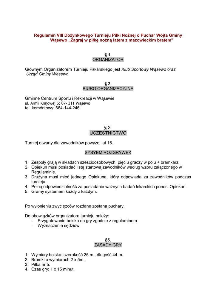 Regulamin VIII Dożynkowego Turnieju Piłki Nożnej o Puchar Wójta Gminy Wąsewo „Zagraj w piłkę nożną latem z mazowieckim bratem” § 1. ORGANIZATOR Głównym Organizatorem Turnieju Piłkarskiego jest Klub Sportowy Wąsewo oraz Urząd Gminy Wąsewo. § 2. BIURO ORGANIZACYJNE Gminne Centrum Sportu i Rekreacji w Wąsewie ul. Armii Krajowej 6; 07- 311 Wąsewo tel. komórkowy: 664-144-246 § 3. UCZESTNICTWO Turniej otwarty dla zawodników powyżej lat 16. SYSYEM ROZGRYWEK 1. Zespoły grają w składach sześcioosobowych, pięciu graczy w polu + bramkarz. 2. Opiekun musi posiadać listę startową zawodników według wzoru załączonego w Regulaminie. 3. Drużyna musi mieć jednego Opiekuna, który odpowiada za zawodników podczas turnieju. 4. Pełną odpowiedzialność za posiadanie ważnych badań lekarskich ponosi Opiekun. 5. Gramy systemem każdy z każdym. Po wyłonieniu zwycięzców rozdane zostaną puchary. Do obowiązków organizatora turnieju należy: - Przygotowanie boiska do gry zgodnie z regulaminem - Wyznaczenie sędziów §5. ZASADY GRY 1. 2. 3. 4. Wymiary boiska: szerokość 25 m., długość 44 m. Bramki o wymiarach 2 x 5m., Piłka nr 5. Czas gry: 1 x 15 minut. 5. Zespół liczy max. 10 zawodników: na boisku znajduje się 5 zawodników w polu + bramkarz oraz 4 zawodników rezerwowych. 6. Obuwie: korkotrampki (miękkie korki). Zakaz gry w butach wkrętach. 7. Pole bramkowe: prostokąt o wymiarach 7 x 15 m. 8. Bramkarz może chwytać piłkę tylko w polu bramkowym. 9. Rzut od bramki wykonywany jest nogą. 10. Piłka z rzutu od bramki nie może bezpośrednio przekroczyć linii środkowej. 11. Jeżeli piłka z rzutu od bramki przekroczy bezpośrednio linię środkową to drużyna, która nie popełniła przewinienia wykonuje rzut wolny pośredni z linii środkowej boiska. W tym przypadku nie obowiązuje przepis o „prawie korzyści”. 12. Gra bez „spalonego”. 13. Zmiany hokejowe. 14. Podczas wykonywania stałych fragmentów gry zawodnicy drużyny przeciwnej muszą znajdować się przynajmniej w odległości 5 m. od piłki. 15. Rzut karny wykonywany jest z odległości 9 m. od bramki. 16. Pozostałe przepisy zgodnie z przepisami Polskiego Związku Piłki Nożnej. § 6. PUNKTACJA Za wygrany mecz drużyna otrzymuje 3 punkty, za remis 1 punkt, w przypadku porażki 0 punktów. O kolejności miejsc w grupie oraz całym turnieju decydują: 1. Większa liczba zdobytych punktów. 2. W przypadku uzyskania równej liczby punktów przez dwa zespoły decydują: A/ wynik bezpośredniego spotkania, B/ lepsza różnica bramek w całym turnieju, C/ większa liczba zdobytych bramek w całym turnieju. 3. W przypadku uzyskania równej liczby punktów przez więcej niż dwa zespoły przeprowadza się dodatkową punktację pomocniczą spotkań wyłącznie między zainteresowanymi zespołami (tzw. „mała tabela”), kierując się kolejno zasadami podanymi w punkcie 2 w podpunktach A, B oraz C biorąc pod uwagę jedynie wyniki spotkań pomiędzy zainteresowanymi zespołami. § 7. ZGŁOSZENIA DO TURNIEJU PIŁKARSKIEGO Zgłoszenia (załącznik nr 1 do niniejszego Regulaminu) należy wypełnić i przekazać przed turniejem organizatorom do godziny 9:30 w dniu zawodów. 1. - Karta drużyny musi zawierać: nazwę drużyny, imię, nazwisko, podpis i telefon kontaktowy Opiekuna drużyny, podpis Opiekuna zespołu, § 8. UBEZPIECZENIE 1. Uczestnicy rundy eliminacyjnej, finału ubezpieczeni są na koszt własny. --------------------------------------------------------------------------------------------------------------------Sposób interpretacji regulaminu oraz wszystkie sprawy sporne rozstrzyga Biuro Organizacyjne Turnieju Piłkarskiego : Gminne Centrum Sportu i Rekreacji w Wąsewie ul. Armii Krajowej 6; 07- 311 Wąsewo tel. komórkowy: 664-144-246 Biuro Organizacyjne czynne od poniedziałku do piątku: godz. 8.00 – 21.00 (załącznik nr 1 do Regulaminu) ZGŁOSZENIE Zawodników na Dożynkowy Turniej Piłki Nożnej o Puchar Wójta Gminy Wąsewo ...................................................................................................................................... nazwa zespołu Lp. Imię i nazwisko zawodnika Data urodzenia 1. 2. 3. 4. 5. 6. 7. 8. 9. 10. Potwierdzam, że wyżej wymienieni zawodnicy nie mają przeciwwskazań do gry w piłkę nożną. Opiekunem zespołu jest Pan/Pani: imię i nazwisko