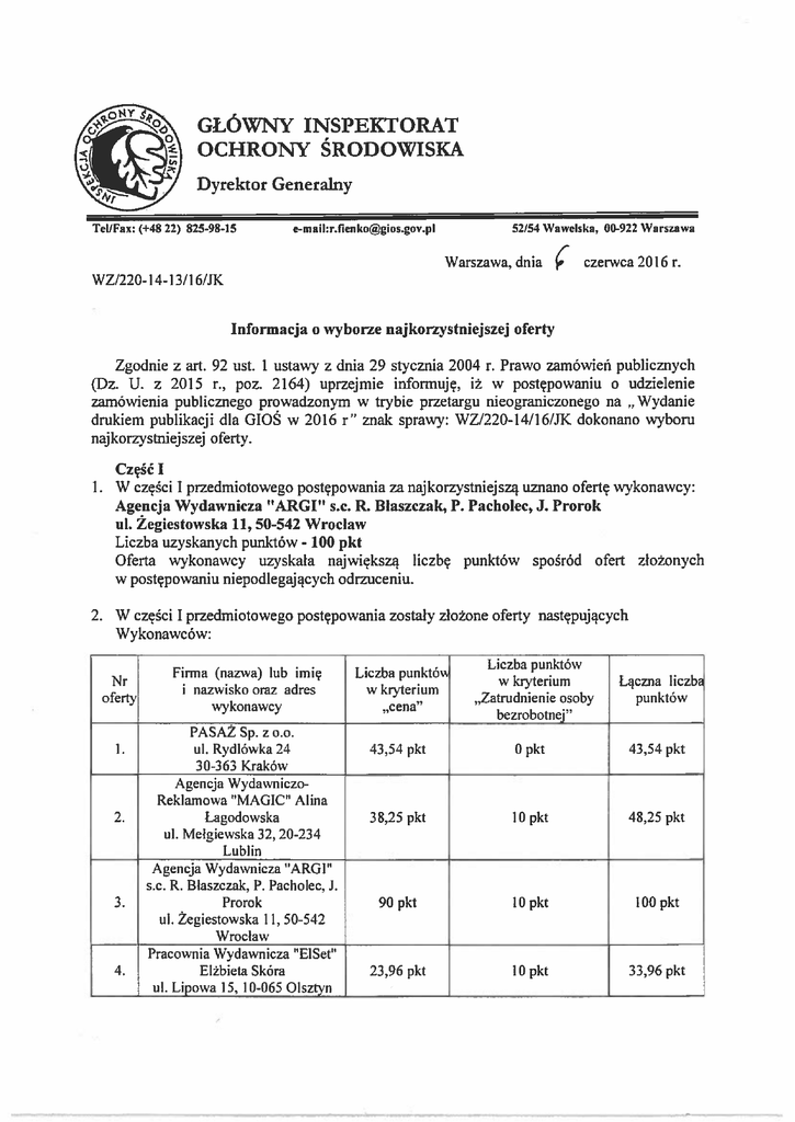 GŁÓWNY INSPEKTORAT OCHRONY ŚRODOWISKA Dyrektor Generaby Tel/Fax: (+48 22) 825-98-15 e-maii:r.fienko®gios.goy.pI 52/54 Wawelska, OO-922 Warszawa Warszawa, dnia WZ/220-1 4-13/1 6/JK ( czerwca 2016 r. Informacja o wyborze najkorzystniejszej oferty Zgodnie z art. 92 ust. 1 ustawy z dnia 29 stycznia 2004 r. Prawo zamówień publicznych (Dz. U. z 2015 r., poz. 2164) uprzejmie informuję, iż w postępowaniu o udzielenie zamówienia publicznego prowadzonym w trybie przetargu nieograniczonego na „Wydanie drukiem publikacji dla GlOS w 2016 r” znak sprawy: WZ/220-14/16/JK dokonano wyboru najkorzystniejszej oferty. Część I 1. W części I przedmiotowego postępowania za najkorzystniejszą uznano ofertę wykonawcy: Agencja Wydawnicza „ARGI” s.c. R. Blaszczak, P. Pacholec, J. Prorok ul. Zegiestowska 11, 50-542 Wrocław Liczba uzyskanych punktów 100 pkt Oferta wykonawcy uzyskała największą liczbę punktów spośród ofert złożonych w postępowaniu niepodlegających odrzuceniu. - 2. W części I przedmiotowego postępowania zostały złożone oferty następujących Wykonawców: . Nr oferty . . Firma (nazwa) lub imię i nazwisko oraz adres wykonawcy . . Liczba punktów w kryterium .„Zatrudmenie osoby bezrobotnej” Łączna liczb punktow 43,54 pkt O pkt 43,54 pkt 38,25 pkt 10 pkt 48,25 pkt 90 pkt 10 pkt 100 pkt 23,96 pkt 10 pkt 33,96 pkt . . Liczba punktoy w kryterium „.cena . .„ - 1. 2. 3. 4. PASAŻ Sp. z o.o. ul. Rydlówka 24 30-363 Kraków Agencja WydawniczoReklamowa MAG1C Alina Lagodowska ul. Melgiewska 32, 20-234 Lublin Agencja Wydawnicza „ARGI” s.c. R. Blaszczak, P. Pacholec, J. Prorok ul. Zegiestowska 11, 50-542 Wrocław Pracownia Wydawnicza „ElSet” Elżbieta Skóra ul._Lipowa_15,_10-065_Olsztyn 5. 6. 7. 8. 9 „EURO PILOT” Sp. z o.o. ul. Konarskiego 3, Ol-355 Warszawa „OMIKRON” Sp. z o.o. ul. Kutrzeby 15, 05-082 Stare Babice Izabela Dziekońska ul. Kobylepole 8d 61-304 Poznań Agencja Reklamowa „TOP” AgŁ 87-800 Włocławek PARINET POLIGRAFIA Andrzej Kadasz ul. Zwycięstwa 10 I 5-703 Biakstok 38,79 pkt O pkt 38,79 pkt 41,32 pkt O pkt 41,32 pkt 21,77 pkt O pkt 21,77 pkt 3 8,70 pkt 0 pkt 3 8,70 pkt 49.48 pkt O pkt 49,48 pkt Część II 1. W części I przedmiotowego postępowania za najkorzystniejszą uznano ofertę wykonawcy; PASAZ Sp. z o.o. ul. Rydlówka 24, 30-363 Kraków Liczba uzyskanych punktów 90 pkt Oferta wykonawcy uzyskala największą liczbę punktów spośród ofert złożonych w postępowaniu niepodlegających odrzuceniu. - 2. W części II przedmiotowego postępowania zostały złożone oferty następujących Wykonawców: . . Nr oferty . . Firma (nazwa) lub imię i nazwisko onz adres wikonawcy . . . . Liczba punktow w kryterium ..cena . .. . 1. 2. 3. 4. 5. 6. PASAŻ Sp. z o.o. ul. Rydlówka 24 30-363 Kraków Agencja WydawniczoReklamowa „MAGIC” Alina Łagodowska ul. Melgiewska 32, 20-234 Lublin Pracownia Wydawnicza „ElSet” Elżbieta Skóra ul._Lipowa_15,_10-065_Olsztyn „EURO PILOT” Sp. z o.o. ul. Konarskiego 3, 01-355 Warszawa „OMIKRON” Sp. z o.o. ul. Kutrzeby 15, 05-082 Stare Babice Izabela Dziekońska ul. Kobylepole 8d 61-304 Poznań Liczba punktów w kryterium „.Zatrudnienie osoby bezrobotnej Laczna liczbz punktow 90 pkt O pkt 90 pkt 49,3 7 pkt 10 pkt 59,37 pkt 48,73 pkt 10 pkt 58,73 pkt 63,75 pkt O pkt 63,75 pkt 65,72 pkt O pkt 65,72 pkt 37,32 pkt O pkt 37,32 pkt 7 8 Agencja Reklamowa °TOP” Agnieszka Łuczak ul. Toruńska 148 87-800 Włocławek PARTNET POLIGRAFIA Andrzej Kadasz ul. Zwycięstwa 10 15-703 Białystok 43,84 pkt 0 pkt 43,84 pkt 4347 pkt O pkt 43,47 pkt Część HI I. W części III przedmiotowego postępowania za najkorzystniejszą uznano ofertę wykonawcy: Agencja Wydawnicza „ARGI” s.c. R. Blaszczak, P. Pachole; J. Prorok ul. Zegiestowska 11, 50-542 Wrocław Liczba uzyskanych puitów 90,28 pkt Oferta wykonawcy uzyskała największą liczbę punktów spośród ofert złożonych w postępowaniu niepodlegających odrzuceniu. — 2. W części III przedmiotowego postępowania zostały złożone oferty następujących Wykonawców; . Nr oferty 1. 2. 3. 4. 5. 6. 7. 8. . . Firma (nazwa) lub imię i nazwisko onz adres wykonawcy . . Agencja WydawniczoReklamowa „MACIC” Alina Łagodowska ul. Mełgiewska 32, 20-234 Lublin Agencja Wydawnicza „ARGI” s.c. R. Błaszczak. P. Pacholec. J. Prorok, ul. Zegiestowska 11, 50-542 Wrocław Pracownia Wydawnicza ElSet” Elżbieta Skóra ul._Lipowa_15,_10-065_Olsztyn EURO PILOT” Sp. z o.o. ul. Konarskiego 3, 01-355 Warszawa „OMIKRON” Sp. z o.o. ul. Kutrzeby 15, 05-082 Stare Babice Izabela Dziekońska ul. Kobylepole 8d 61-304 Poznań Agencja Reklamowa „TOP” Agnieszka Łuczak ul. Torunska 148 87-800 Włoclawek PARTNET POLIGRAFIA Andrzej Kadasz u]. Zwycięstwa 10 15-703 Białystok I Liczba punktow iy kryterium ..cena Liczba punktów w kn”tenum .„Zatrudnienie osoby bezrobotnej Łączna IiczbE punktow 41,86 pkt 10 pkt 5 1,86 pkt 80.28 pkt 10 pkt 90.28 pkt . . . „ - - - 19,08 pkt 10 pkt 29,08 pkt 3 1,09 pkt O pkt 31,09 pkt 44,13 pkt O pkt 44,13 pkt 18 pkt O pkt 18 pkt 90 pkt O pkt 90 pkt 89,18 pkt O pkt 89,18 pkt 7 J .3.