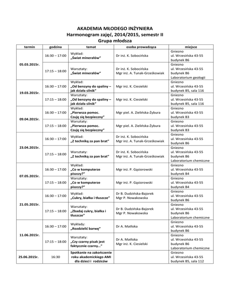 AKADEMIA MŁODEGO INŻYNIERA Harmonogram zajęć, 2014/2015, semestr II Grupa młodsza termin godzina temat osoba prowadząca 16:30 – 17:00 Wykład: „Świat minerałów” Dr inż. K. Sobocińska 17:15 – 18:00 Warsztaty: „Świat minerałów” Dr inż. K. Sobocińska Mgr inż. A. Tunak-Grześkowiak 05.03.2015r. 16:30 – 17:00 19.03.2015r. 17:15 – 18:00 16:30 – 17:00 09.04.2015r. 17:15 – 18:00 Wykład: „Od benzyny do spaliny – jak działa silnik” Warsztaty: „Od benzyny do spaliny – jak działa silnik” Wykład: „Pierwsza pomoc. Czuję się bezpieczny” Warsztaty: „Pierwsza pomoc. Czuję się bezpieczny” Mgr inż. K. Ciesielski Mgr inż. K. Ciesielski Mgr piel. A. Zielińska-Żybura Mgr piel. A. Zielińska-Żybura 16:30 – 17:00 Wykład: „Z techniką za pan brat” Dr inż. K. Sobocińska Mgr inż. A. Tunak-Grześkowiak 17:15 – 18:00 Warsztaty: „Z techniką za pan brat” Dr inż. K. Sobocińska Mgr inż. A. Tunak-Grześkowiak 23.04.2015r. 16:30 – 17:00 07.05.2015r. 17:15 – 18:00 Mgr inż. P. Gąsiorowski Mgr inż. P. Gąsiorowski 16:30 – 17:00 Wykład: „Cukry, białka i tłuszcze” Dr B. Dudzińska-Bajorek Mgr P. Nowakowska 17:15 – 18:00 Warsztaty: „Zbadaj cukry, białka i tłuszcze” Dr B. Dudzińska-Bajorek Mgr P. Nowakowska 16:30 – 17:00 Wykłady: „Rozdzielić barwę” Dr A. Matłoka 17:15 – 18:00 Warsztaty: „Czy czarny pisak jest faktycznie czarny…” Dr A. Matłoka Mgr inż. K. Ciesielski 21.05.2015r. 11.06.2015r. 25.06.2015r. Wykład: „Co w komputerze piszczy?” Warsztaty: „Co w komputerze piszczy?” 16:30 Spotkanie na zakończenie roku akademickiego AMI dla dzieci i rodziców miejsce Gniezno ul. Wrzesińska 43-55 budynek B6 Gniezno ul. Wrzesińska 43-55 budynek B6 Laboratorium geologii Gniezno ul. Wrzesińska 43-55 budynek B5, sala 116 Gniezno ul. Wrzesińska 43-55 budynek B5, sala 116 Gniezno ul. Wrzesińska 43-55 budynek B3 Gniezno ul. Wrzesińska 43-55 budynek B3 Gniezno ul. Wrzesińska 43-55 budynek B6 Gniezno ul. Wrzesińska 43-55 budynek B6 Laboratorium chemiczne Gniezno ul. Wrzesińska 43-55 budynek B4 Gniezno ul. Wrzesińska 43-55 budynek B4 Gniezno ul. Wrzesińska 43-55 budynek B6 Gniezno ul. Wrzesińska 43-55 budynek B6 Laboratorium chemiczne Gniezno ul. Wrzesińska 43-55 budynek B6 Gniezno ul. Wrzesińska 43-55 budynek B6 Laboratorium chemiczne Gniezno ul. Wrzesińska 43-55 budynek B5, sala 112