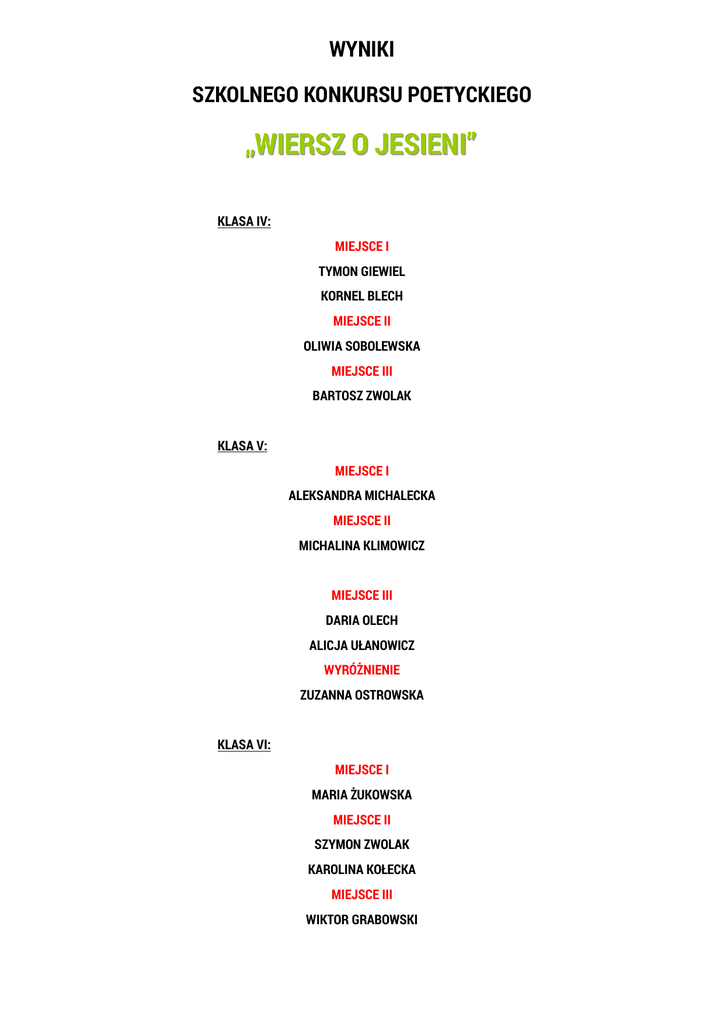 WYNIKI SZKOLNEGO KONKURSU POETYCKIEGO „WIERSZ O JESIENI” KLASA IV: MIEJSCE I TYMON GIEWIEL KORNEL BLECH MIEJSCE II OLIWIA SOBOLEWSKA MIEJSCE III BARTOSZ ZWOLAK KLASA V: MIEJSCE I ALEKSANDRA MICHALECKA MIEJSCE II MICHALINA KLIMOWICZ MIEJSCE III DARIA OLECH ALICJA UŁANOWICZ WYRÓŻNIENIE ZUZANNA OSTROWSKA KLASA VI: MIEJSCE I MARIA ŻUKOWSKA MIEJSCE II SZYMON ZWOLAK KAROLINA KOŁECKA MIEJSCE III WIKTOR GRABOWSKI