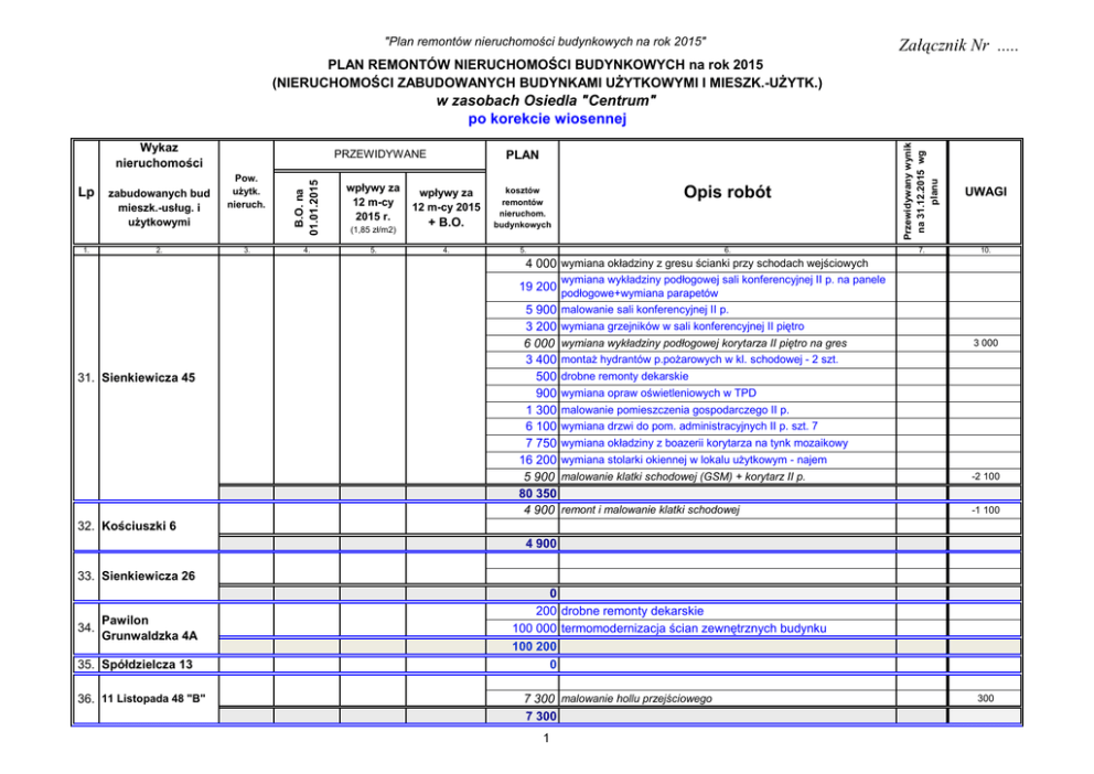 "Plan remontów nieruchomości budynkowych na rok 2015" Załącznik Nr ..... PLAN REMONTÓW NIERUCHOMOŚCI BUDYNKOWYCH na rok 2015 (NIERUCHOMOŚCI ZABUDOWANYCH BUDYNKAMI UŻYTKOWYMI I MIESZK.-UŻYTK.) Wykaz nieruchomości 1. zabudowanych bud mieszk.-usług. i użytkowymi 2. Opis robót + B.O. kosztów remontów nieruchom. budynkowych 4. 5. 6. 7. PRZEWIDYWANE Pow. użytk. nieruch. 3. B.O. na 01.01.2015 Lp Przewidywany wynik na 31.12.2015 wg planu w zasobach Osiedla "Centrum" po korekcie wiosennej wpływy za 12 m-cy 2015 r. 4. 5. (1,85 zł/m2) PLAN wpływy za 12 m-cy 2015 REALIZACJA P o n i e s i 8.9 UWAGI 10. 4 000 wymiana okładziny z gresu ścianki przy schodach wejściowych wymiana wykładziny podłogowej sali konferencyjnej II p. na panele podłogowe+wymiana parapetów 5 900 malowanie sali konferencyjnej II p. 3 200 wymiana grzejników w sali konferencyjnej II piętro 19 200 31. Sienkiewicza 45 6 000 3 400 500 900 1 300 6 100 7 750 16 200 5 900 80 350 4 900 wymiana wykładziny podłogowej korytarza II piętro na gres 3 000 montaż hydrantów p.pożarowych w kl. schodowej - 2 szt. drobne remonty dekarskie wymiana opraw oświetleniowych w TPD malowanie pomieszczenia gospodarczego II p. wymiana drzwi do pom. administracyjnych II p. szt. 7 wymiana okładziny z boazerii korytarza na tynk mozaikowy wymiana stolarki okiennej w lokalu użytkowym - najem malowanie klatki schodowej (GSM) + korytarz II p. -2 100 remont i malowanie klatki schodowej -1 100 32. Kościuszki 6 4 900 33. Sienkiewicza 26 34. Pawilon Grunwaldzka 4A 35. Spółdzielcza 13 36. 11 Listopada 48 "B" 0 200 drobne remonty dekarskie 100 000 termomodernizacja ścian zewnętrznych budynku 100 200 0 7 300 malowanie hollu przejściowego 7 300 1 300 "Plan remontów nieruchomości budynkowych na rok 2015" zabudowanych bud mieszk.-usług. i użytkowymi 1. 2. Pow. użytk. nieruch. 3. B.O. na 01.01.2015 Lp PRZEWIDYWANE wpływy za 12 m-cy 2015 r. 4. 5. (1,85 zł/m2) 6. 7. PLAN wpływy za 12 m-cy 2015 REALIZACJA + B.O. kosztów remontów nieruchom. budynkowych 4. 5. 4 000 2 800 300 5 600 12 700 37. Cicha 11 38. Pańska 8 39. Opis robót Przewidywany wynik na 31.12.2015 wg planu Wykaz nieruchomości Załącznik Nr ..... przebudowa tablicy energetycznej malowanie klatki schodowej+okładzina z mozaiki na lamperii 1 600 -5 000 dziennik budowy 6 318,20 88 777,69 140 264,04 229 041,73 230 450 LEGENDA: roboty dodatkowo wprowadzone do planu 167 750 zmiana wartości robót w stosunku do planu z 20.11.2014 r. (w uwagach +/-) -3 300 2 10. wymiana odcinka rynny nad garażami+ 1 rura spustowa 25 000 RAZEM nieruchomości użytkowe 8.9 UWAGI przebudowa schodów zewnętrznych z okładziną z gresu 0 25 000 roboty rozbiórkowe budynku Skłodowskiej 11A P o n i e s i -1 408