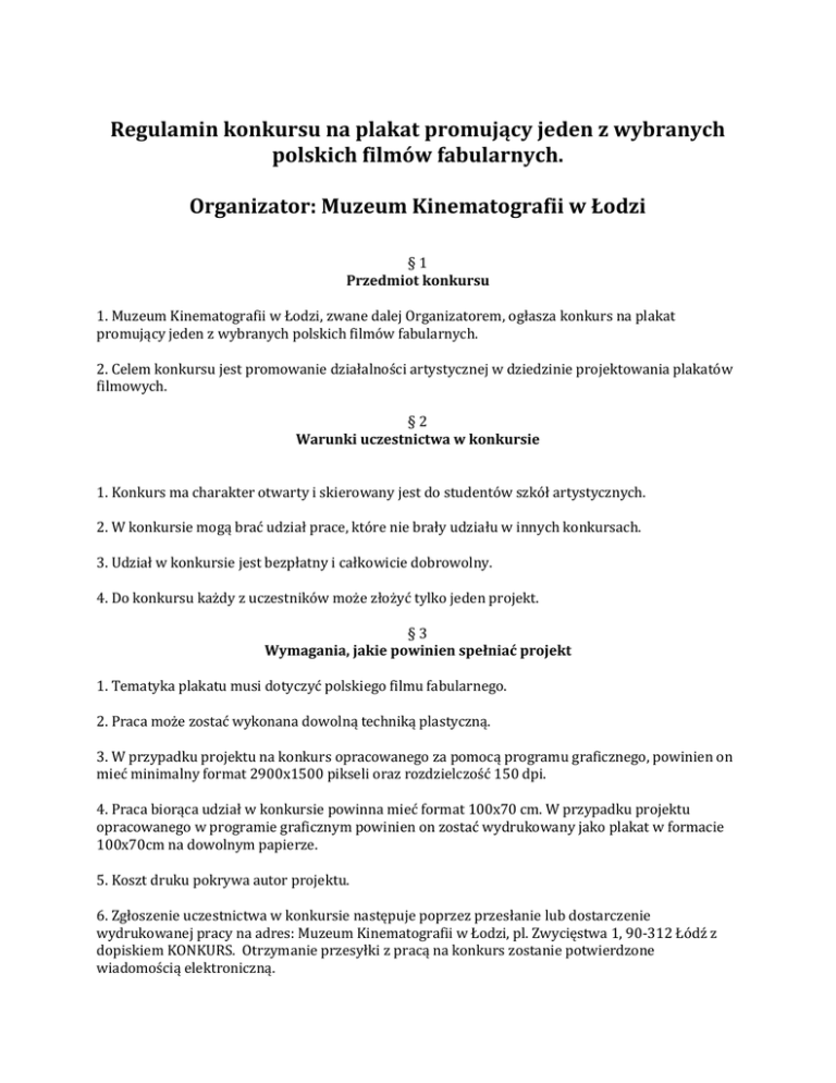 Regulamin konkursu na plakat promujący jeden z wybranych polskich filmów fabularnych. Organizator: Muzeum Kinematografii w Łodzi §1 Przedmiot konkursu 1. Muzeum Kinematografii w Łodzi, zwane dalej Organizatorem, ogłasza konkurs na plakat promujący jeden z wybranych polskich filmów fabularnych. 2. Celem konkursu jest promowanie działalności artystycznej w dziedzinie projektowania plakatów filmowych. §2 Warunki uczestnictwa w konkursie 1. Konkurs ma charakter otwarty i skierowany jest do studentów szkół artystycznych. 2. W konkursie mogą brać udział prace, które nie brały udziału w innych konkursach. 3. Udział w konkursie jest bezpłatny i całkowicie dobrowolny. 4. Do konkursu każdy z uczestników może złożyć tylko jeden projekt. §3 Wymagania, jakie powinien spełniać projekt 1. Tematyka plakatu musi dotyczyć polskiego filmu fabularnego. 2. Praca może zostać wykonana dowolną techniką plastyczną. 3. W przypadku projektu na konkurs opracowanego za pomocą programu graficznego, powinien on mieć minimalny format 2900x1500 pikseli oraz rozdzielczość 150 dpi. 4. Praca biorąca udział w konkursie powinna mieć format 100x70 cm. W przypadku projektu opracowanego w programie graficznym powinien on zostać wydrukowany jako plakat w formacie 100x70cm na dowolnym papierze. 5. Koszt druku pokrywa autor projektu. 6. Zgłoszenie uczestnictwa w konkursie następuje poprzez przesłanie lub dostarczenie wydrukowanej pracy na adres: Muzeum Kinematografii w Łodzi, pl. Zwycięstwa 1, 90-312 Łódź z dopiskiem KONKURS. Otrzymanie przesyłki z pracą na konkurs zostanie potwierdzone wiadomością elektroniczną. 7. Na odwrocie zgłoszonej pracy powinna zostać umieszczona metryczka zawierająca dane autora: imię i nazwisko, adres pocztowy, adres e-mail i nr tel. kontaktowego oraz zgoda na przetwarzanie danych. 8. Termin nadesłania prac - 15 kwietnia 2013 roku (decyduje data stempla pocztowego). 9. Organizator konkursu nie będzie w żaden sposób ingerował lub modyfikował zwycięskiego plakatu. §4 Kryteria oceny 1. Prace zostaną poddane ocenie przez Komisję Konkursową, powołaną przez Dyrektora Muzeum Kinematografii Mieczysława Kuźmickiego, której przewodzić będzie grafik Andrzej Pągowski. 2. Komisja Konkursowa dokona wyboru trzech najlepszych plakatów. 3. Decyzja Komisji jest ostateczna i nie przysługuje od niej odwołanie. §5 Warunki ogólne 1. Osoby nadsyłające zgłoszenia w ramach konkursu tym samym wyrażają zgodę na przetwarzanie przez Organizatora swoich danych osobowych wyłącznie na potrzeby konkursu w zakresie koniecznym do prawidłowego przeprowadzenia konkursu (ustawa o ochronie danych osobowych z dn. 29 sierpnia 1997 roku Dz.U. Nr 133, poz. 833 z późn. zm.). 2. Zgłoszenie pracy do konkursu jest jednoznaczne z przyjęciem warunków niniejszego regulaminu i oświadczeniem, że prace zgłoszone na Konkurs zostały wykonane osobiście. 3. Przekazanie prac konkursowych oznacza jednocześnie, że przekazujący oświadcza, iż nie naruszają one praw osób trzecich, w szczególności nie naruszają ich majątkowych i osobistych praw autorskich. W przypadku wystąpienia przez osobę trzecią z roszczeniami wynikającymi z tytułu naruszenia praw określonych powyżej osoba przekazująca zrekompensuje Organizatorowi, jako wyłącznie odpowiedzialna, koszty poniesione w związku ze skierowaniem przeciwko niemu roszczeń odszkodowawczych, zwalniając Organizatora od wszelkich zobowiązań, jakie powstaną z tego tytułu. §6 Nagrody 1. Organizator nagrodzi trzy najlepsze prace przyporządkowane do kategorii: I miejsce, II miejsce oraz III miejsce. 2. Za zajęcie pierwszego miejsca zostanie przyznana nagroda pieniężna w wysokości 1.000,00 PLN brutto (jeden tysiąc złotych 0/100) 3. Ponadto nagrodą dla każdego z trzech laureatów konkursu będzie możliwość zaprezentowania własnej wystawy autorskiej w galerii Muzeum Kinematografii w Łodzi, w uzgodnionym wcześniej terminie. 4. Ogłoszenie wyników konkursu nastąpi 19 kwietnia 2013 roku. Nagroda zostanie wpłacona na wskazane przez zwycięzcę konto do 23 kwietnia 2013 roku. §7 Prawo własności i prawo wykorzystania zwycięskiego plakatu. 1.Zwycięski projekt nie staje się własnością Organizatora. Wszelkie prawa autorskie pozostają przy autorze pracy. §8 Postanowienia końcowe 1. Wszystkie prace, które wezmą udział w konkursie zostaną wykorzystane przez Organizatora do opracowania wystawy, która zostanie zaprezentowana we wnętrzach pałacu Karola Scheiblera od 20 kwietnia do 31 maja 2013 r. 2. Organizator zastrzega sobie prawo zmiany postanowień niniejszego regulaminu w każdym czasie bez podania przyczyny. 3. We wszystkich sprawach spornych decyduje Komisja Konkursowa. 4. Niniejszy regulamin podlega ogłoszeniu na stronie internetowej Organizatora: www.kinomuzeum.pl