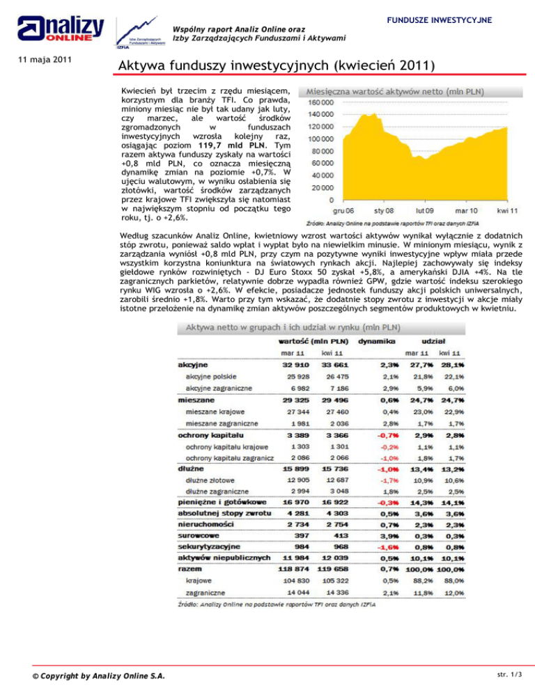 FUNDUSZE INWESTYCYJNE Wspólny raport Analiz Online oraz Izby Zarządzających Funduszami i Aktywami 11 maja 2011 Aktywa funduszy inwestycyjnych (kwiecień 2011) Kwiecień był trzecim z rzędu miesiącem, korzystnym dla branży TFI. Co prawda, miniony miesiąc nie był tak udany jak luty, czy marzec, ale wartość środków zgromadzonych w funduszach inwestycyjnych wzrosła kolejny raz, osiągając poziom 119,7 mld PLN. Tym razem aktywa funduszy zyskały na wartości +0,8 mld PLN, co oznacza miesięczną dynamikę zmian na poziomie +0,7%. W ujęciu walutowym, w wyniku osłabienia się złotówki, wartość środków zarządzanych przez krajowe TFI zwiększyła się natomiast w największym stopniu od początku tego roku, tj. o +2,6%. Według szacunków Analiz Online, kwietniowy wzrost wartości aktywów wynikał wyłącznie z dodatnich stóp zwrotu, ponieważ saldo wpłat i wypłat było na niewielkim minusie. W minionym miesiącu, wynik z zarządzania wyniósł +0,8 mld PLN, przy czym na pozytywne wyniki inwestycyjne wpływ miała przede wszystkim korzystna koniunktura na światowych rynkach akcji. Najlepiej zachowywały się indeksy giełdowe rynków rozwiniętych - DJ Euro Stoxx 50 zyskał +5,8%, a amerykański DJIA +4%. Na tle zagranicznych parkietów, relatywnie dobrze wypadła również GPW, gdzie wartość indeksu szerokiego rynku WIG wzrosła o +2,6%. W efekcie, posiadacze jednostek funduszy akcji polskich uniwersalnych, zarobili średnio +1,8%. Warto przy tym wskazać, że dodatnie stopy zwrotu z inwestycji w akcje miały istotne przełożenie na dynamikę zmian aktywów poszczególnych segmentów produktowych w kwietniu. © Copyright by Analizy Online S.A. str. 1/3 FUNDUSZE INWESTYCYJNE Wspólny raport Analiz Online oraz Izby Zarządzających Funduszami i Aktywami 11 maja 2011 Aktywa funduszy inwestycyjnych (kwiecień 2011) Biorąc pod uwagę dynamikę zmian aktywów dla poszczególnych segmentów, w kwietniu, po raz pierwszy od 9 miesięcy, widoczny był odwrót klientów od funduszy pieniężnych i gotówkowych. Pomimo dodatnich stóp zwrotu wypracowanych przez zarządzających tymi produktami, kwietniowe tempo zmian aktywów w przypadku najbezpieczniejszego sektora produktowego ukształtowało się bowiem na poziomie -0,3%. Tym samym, w minionym miesiącu, aktywa funduszy pieniężnych i gotówkowych zmniejszyły swój udział rynkowy o -0,2 pkt proc. do poziomu 14,1%. W kwietniu swój udział w rynku zmniejszyły również inne bezpieczne rozwiązania, czyli fundusze dłużne oraz ochrony kapitału. Jeżeli chodzi o fundusze obligacji, to produkty te odnotowały kwietniową dynamikę zmian aktywów na poziomie równym -1,0%. Taka sytuacja spowodowana była głównie przewagą wypłat na wpłatami klientów TFI do tych funduszy. Na koniec kwietnia, w strukturze wszystkich funduszy dłużnych dostępnych na polskim rynku, największy udział wynoszący 48,1% stanowiły fundusze dłużne uniwersalne. Dla porównania, rynkowy udział funduszy dłużnych skarbowych oraz korporacyjnych kształtował się na poziomie równym odpowiednio 43,1% oraz 8,8%. Kwiecień był kolejnym, dobrym miesiącem dla funduszy akcyjnych. Dzięki zarówno dobrej koniunkturze giełdowej, jak i dodatniemu saldu wpłat i wypłat, aktywa zgromadzone w tym segmencie produktowym powiększyły swoją wartość o +2,3% do poziomu 33,7 mld PLN. Najszybciej rosły środki zgromadzone w funduszach akcji zagranicznych (+2,9%), w efekcie czego ich wartość przekroczyła poziom 7 mld PLN. Z kolei w funduszach akcji polskich, klienci TFI zgromadzili już prawie 26 mld PLN, co odpowiada za udział w rynku na poziomie 22,1%. W podziale na dostępność funduszy inwestycyjnych dla inwestorów, w kwietniu aktywa funduszy klientów indywidualnych wynosiły 104,3 mld PLN, a instytucjonalnych 15,4 mld PLN. Zespół Analiz Online Spółka Analizy Online jest niezależną firmą analityczną zajmującą się monitoringiem rynku polskich i zagranicznych instytucji zbiorowego lokowania środków: funduszy inwestycyjnych, emerytalnych oraz ubezpieczeniowych funduszy kapitałowych). W zakres analiz rynku funduszy wchodzą między innymi rankingi funduszy, ocena efektywności działań zarządzających oraz analiza ich wpływu na polski rynek finansowy. Działalności firmy obejmuje również monitoring rynku produktów strukturyzowanych, zmian akcjonariatu polskich spółek publicznych oraz analizę rynku polskich papierów dłużnych. Izba Zarządzających Funduszami i Aktywami jest organizacją zrzeszającą, na zasadach dobrowolności, działające w Polsce towarzystwa funduszy inwestycyjnych, działa na mocy ustawy z dnia 27 maja 2004 roku o funduszach inwestycyjnych (Dz. U. Nr 146 poz. 1546 ze zmianami). Izba została powołana 28 października 2004 roku (wcześniej – od 1997 roku środowisko było reprezentowane przez Stowarzyszenie Towarzystw Funduszy Inwestycyjnych, którego następcą jest Izba). Do jej statutowych celów należy reprezentowanie środowiska towarzystw funduszy inwestycyjnych, wspieranie rozwoju towarzystw funduszy inwestycyjnych w Polsce, upowszechnianie wiedzy o funduszach, rozwijanie i doskonalenie zasad etyki zawodowej specjalistów związanych z zarządzaniem funduszami inwestycyjnymi. Członkami Izby jest obecnie 21 działających w Polsce towarzystw funduszy inwestycyjnych. Niniejsze opracowanie zostało sporządzone wyłącznie w celu informacyjnym zgodnie z najlepszą wiedzą i starannością autorów. Dane wykorzystane przy tworzeniu opracowania pochodzą ze źródeł uważanych przez firmę Analizy Online S.A. za wiarygodne i dokładne, lecz nie istnieje gwarancja, iż są one kompletne i odzwierciedlają stan faktyczny. Opinie zawarte w niniejszym opracowaniu częściowo bazują na wartościach szacunkowych, wyznaczanych zgodnie z metodologią stosowaną przez Analizy Online S.A., które mogą odbiegać od danych rzeczywistych. Spółka Analizy Online S.A. nie ponosi odpowiedzialności z