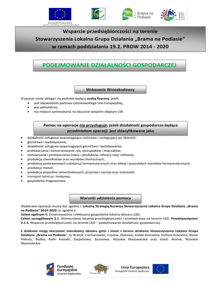 Wsparcie przedsiębiorczości na terenie Stowarzyszenia Lokalna Grupa Działania „Brama na Podlasie” w ramach poddziałania 19.2. PROW 2014 - 2020 PODEJMOWANIE DZIAŁALNOŚCI GOSPODARCZEJ Wskazanie Wnioskodawcy O pomoc może ubiegać się podmiot będący osobą fizyczną, jeżeli: jest obywatelem państwa członkowskiego Unii Europejskiej, jest pełnoletnia, ma miejsce zamieszkania na obszarze wiejskim objętym LSR. Pomoc na operacje nie przysługuje, jeżeli działalność gospodarcza będąca przedmiotem operacji jest sklasyfikowane jako działalność usługowa wspomagająca rolnictwo i następująca po zbiorach; je górnictwo i wydobywanie; działalność usługowa wspomagająca górnictwo i wydobywanie; przetwarzanie i konserwowanie ryb, skorupiaków i mięczaków; wytwarzanie i przetwarzanie koksu i produktów rafinacji ropy naftowej; produkcja chemikaliów oraz wyrobów chemicznych; produkcja podstawowych substancji farmaceutycznych oraz leków i pozostałych wyrobów farmaceutycznych; produkcja metali; produkcja pojazdów samochodowych, przyczep i naczep oraz motocykli; transport lotniczy i kolejowy; gospodarka magazynowa. Warunki udzielenia pomocy Wybierane operacje muszą być zgodne z Lokalną Strategią Rozwoju Stowarzyszenia Lokalna Grupa Działania „Brama na Podlasie” 2014-2020, tj. zgodne z: Celem ogólnym II. Zrównoważona i efektywna gospodarka lokalna obszaru LGD, Celem szczegółowym 2.1. Wzmocnienie lokalnej przedsiębiorczości i przetwórstwa na terenie LGD, Przedsięwzięciem 2.1.1. Wsparcie przedsiębiorczości na terenie LGD – podejmowanie działalności gospodarczej. Z działania mogą skorzystać mieszkańcy obszaru gmin i miast z terenu działania Stowarzyszenia Lokalna Grupa Działania „Brama na Podlasie”, tj: Brańsk, Ciechanowiec, Czyżew, Klukowo, Kołaki-Kościelne, Kulesze Kościelne, Nowe Piekuty, Rudka, Rutki Kossaki, Szepietowo, Szumowo, Wysokie Mazowieckie oraz miast: Brańsk, Wysokie Mazowieckie. Pomoc jest przyznawana podmiotowi, któremu został nadany numer identyfikacyjny w trybie przepisów o krajowym systemie ewidencji producentów, ewidencji gospodarstw rolnych oraz ewidencji wniosków o przyznanie płatności, zwany dalej "numerem identyfikacyjnym"; podmiotowi, który złożył wniosek do biura LGD „BnP” w terminie określonym w ogłoszeniu o naborze wraz ze wszystkimi niezbędnymi załącznikami dołączonymi w oryginale lub w formie kopii potwierdzonej za zgodność z oryginałem przez pracownika Biura LGD „Brama na Podlasie”, samorządu województwa, lub podmiot, który wydał dokument, lub w formie kopii poświadczonych za zgodność z oryginałem przez notariusza lub przez występującego w sprawie pełnomocnika będącego radcą prawnym lub adwokatem; jeżeli koszty kwalifikowalne operacji nie są współfinansowane z innych środków publicznych; jeżeli operacja będzie realizowana nie więcej niż w 2 etapach, a wykonanie zakresu rzeczowego zgodnie z zestawieniem rzeczowo-finansowym operacji, w tym poniesienie przez beneficjenta kosztów kwalifikowalnych operacji oraz złożenie wniosku o płatność końcową wypłacaną po zrealizowaniu całej operacji, nastąpi w terminie 2 lat od dnia zawarcia umowy, lecz nie później niż do dnia 31.12.2022r.; jeżeli operacja, która obejmuje koszty inwestycyjne, zakłada realizację inwestycji na obszarze wiejskim objętym LSR, jeżeli inwestycje w ramach operacji będą realizowane na nieruchomości będącej własnością lub współwłasnością podmiotu ubiegającego się o przyznanie pomocy lub podmiot ten posiada prawo do dysponowania nieruchomością na cele określone we wniosku o przyznanie pomocy co najmniej przez okres realizacji operacji oraz okres podlegania zobowiązaniu do zapewnienia trwałości operacji jeżeli operacja jest uzasadniona ekonomicznie i będzie realizowana zgodnie z biznesplanem, który zawiera co najmniej: opis wyjściowej sytuacji ekonomicznej podmiotu ubiegającego się o przyznanie pomocy; wskazanie celów pośrednich i końcowych, w tym zakładany ilościowy i wartościowy poziom sprzedaży produktów lub usług; informacje dotyczące zasobów lub kwalifikacji posiadanych przez podmiot ubiegający się o przyznanie pomocy niezbędnych ze względu na przedmiot operacji, którą zamierza realizować; wskazanie planowanych do utworzenia miejsc pracy; planowany zakres działań niezbędnych do osiągnięcia celów pośrednich i końcowych. jeżeli minimalna całkowita wartość operacji wynosi nie mniej niż 50 tys. złotych; jeżeli realizacja operacji nie jest możliwa bez udziału środków publicznych; jeżeli została wydana ostateczna decyzja o środowiskowych uwarunkowaniach, jeżeli jej wydanie jest wymagane przepisami odrębnymi Warunki ubiegania się o przyznanie wparcia podmiot ubiegający się o wsparcie nie podlega ubezpieczeniu społecznemu rolników z mocy ustawy i w pełnym zakresie, chyba że podejmuje działalność gospodarczą sklasyfikowaną w przepisach rozporządzenia Rady Ministrów z dnia 24 grudnia 2007 r. w sprawie Polskiej Klasyfikacji Działalności (PKD) (Dz. U. Nr 251, poz. 1885 oraz z 2009 r. Nr 59, poz. 489) jako produkcja artykułów spożywczych lub produkcja napojów, w okresie 2 lat poprzedzających dzień złożenia wniosku o przyznanie tej pomocy nie wykonywał działalności gospodarczej, do której stosuje się przepisy ustawy z dnia 2 lipca 2004 r. o swobodzie działalności gospodarczej, w szczególności nie był wpisany do Centralnej Ewidencji i Informacji o Działalności Gospodarczej i nie została mu dotychczas przyznana pomoc na operację w tym zakresie Założenia operacji podjęcie we własnym imieniu działalności gospodarczej, do której stosuje się przepisy ustawy z dnia 2 lipca 2004 r. o swobodzie działalności gospodarczej, i jej wykonywanie do dnia, w którym upłynie 2 lata od dnia wypłaty płatności końcowej zgłoszenie podmiotu ubiegającego się o przyznanie pomocy do u
