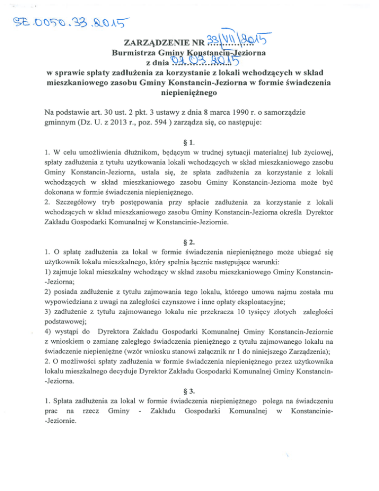 cp ZARZĄDZENIE Burmistrza Gmin I(oąstancTJeziorna z dnia w sprawie spłaty zadłużenia za korzystanie z lokali wchodzących w skiad mieszkaniowego zasobu Gminy Konstancin-Jeziorna w formie świadczenia niepieniężnego Na podstawie art. 30 ust. 2 pkt. 3 ustawy z dnia 8 marca 1990 r. o samorządzie gminnym (Dz. U. z 2013 r., poz. 594 ) zarządza się, co następuje: 1. 1. W celu umożliwienia dłużnikom, będącym w trudnej sytuacji materialnej lub życiowej, spłaty zadłużenia z tytułu użytkowania lokali wchodzących w skład mieszkaniowego zasobu Gminy Konstancin-Jeziorna, ustala się, że spłata zadłużenia za korzystanie z lokali wchodzących w skład mieszkaniowego zasobu Gminy Konstancin-Jeziorna może być dokonana w formie świadczenia niepieniężnego. 2. Szczegółowy tryb postępowania przy spłacie zadłużenia za korzystanie z lokali wchodzących w skład mieszkaniowego zasobu Gminy Konstancin-Jeziorna określa Dyrektor Zakładu Gospodarki Komunalnej w Konstancinie-Jeziornie. 2. 1. O spłatę zadłużenia za lokal w formie świadczenia niepieniężnego może ubiegać się użytkownik lokalu mieszkalnego, który spełnia łącznie następujące warunki: 1) zajmuje lokal mieszkalny wchodzący w skład zasobu mieszkaniowego Gminy Konstancin -Jeziorna; 2) posiada zadłużenie z tytułu zajmowania tego lokalu, którego umowa najmu została mu wypowiedziana z uwagi na zaległości czynszowe i inne opłaty eksploatacyjne; 3) zadłużenie z tytułu zajmowanego lokalu nie przekracza 10 tysięcy złotych zaległości podstawowej; 4) wystąpi do Dyrektora Zakładu Gospodarki Komunalnej Gminy Konstancin-Jeziornie z wnioskiem o zamianę zaległego świadczenia pieniężnego z tytułu ząjmowanego lokalu na świadczenie niepieniężne (wzór wniosku stanowi załącznik nr 1 do niniejszego Zarządzenia); 2. O możliwości spłaty zadłużenia w formie świadczenia niepieniężnego przez użytkownika lokalu mieszkalnego decyduje Dyrektor Zakładu Gospodarki Komunalnej Gminy Konstancin -Jeziorna. 3. 1. Spłata zadłużenia za lokal w formie świadczenia niepieniężnego polega na świadczeniu prac na rzecz Gminy Zakładu Gospodarki Komunalnej w Konstancinie -Jeziornie. - 2. Przedmiotem świadczenia rzeczowego mogą być wyłącznie prace porządkowe, konserwacyjne oraz pomocnicze prace administracyjne. 3. Użytkownik lokalu może wskazać inne osoby, które będą wykonywać w jego imieniu prace, o których mowa w ust. 2. 4. Wartość świadczenia rzeczowego jest ustalana jako iloczyn rzeczywistego czasu wykonywania świadczenia oraz stawki w wysokości 10,00 zł (dziesięć złotych) za godzinę. 1. Spłata zadłużenia za zajmowany lokal w formie świadczenia niepieniężnego może nastąpić po zawarciu porozumienia regulującego zasady spłaty zadłużenia pomiędzy użytkownikiem lokalu a Zakładem Gospodarki Komunalnej w Konstancinie-Jeziornie. 2. Porozumienie powinno zawierać w szczególności rodzaj i zakres usług lub prac, które mają być wykonane w ramach świadczenia niepieniężnego, wysokość zadłużenia wynikająca z użytkowania lokalu, która zostanie odpracowana w ramach świadczenia niepieniężnego, termin ich wykonywania oraz prawa i obowiązki stron porozumienia. 3. Wzór porozumienia stanowi załącznik nr 2 do niniejszego Zarządzenia. 5. Rejestr spraw, w których spłata zadłużenia nastąpiła w formie świadczenia niepieniężnego prowadzi Dyrektor Zakładu Gospodarki Komunalnej w Konstancinie -Jeziornie. 6. Wykonanie zarządzenia powierza się Dyrektorowi Zakładu Gospodarki Komunalnej w Konstancinie-Jeziornie. 7. Zarządzenie wchodzi w życie z dniem podpisania. BURMISTRZ Z:I Nr Burmistrza Gminy Konstancin-Jeziorna Konstancin-Jeziorna, dnia !imię / nazwisko Wnioskodawcy! !ulica, nr domu nr lokalu! /kod, miejscowość! PESEL !nr telefonu! zarządca lokalu siedziba zarządcy WNIOSEK o umożliwienie spłaty zadlużenia w formie spełnienia świadczenia rzeczowego Wnoszę o umożliwienie spłaty zadłużenia z tytułu korzystania z lokalu mieszkalnego (socjalnego, pomieszczenia tymczasowego) w formie świadczenia rzeczowego (odpracowania) na podstawie Zarządzenia Nr Burmistrza Gminy Konstancin-Jeziorna z dnia w sprawie umożliwienia spłaty zadłużenia z tytułu należności za korzystanie z lokali mieszkalnych stanowiących własność Gminy w formie świadczenia rzeczowego. Uzasadnienie: Propozycja sposobu i terminu odpracowania zadłużenia Osoby wskazane do odpracowania Lp. Data urodzenia deklarowana Deklarowany rodzaj liczba godzin do Podpis czynności do odpracowania osoby wykonania miesięcznie wskazanej 1. 27 37 47 :________ Uprzedzony o odpowiedzialności karnej z art. 233 1 Kodeksu karnego potwierdzam własnoręcznym podpisem prawdziwość danych zamieszczonych we wniosku. Jednocześnie oświadczam, że zgodnie z ustawą z dnia 29 sierpnia 1 997r. o ochronie danych osobowych (Dz. U. nr 133 poz. 883 z 1997r.) wyrażam zgodę na zbieranie moich danych w celu rozpatrzenia niniejszego wniosku. /podpis Wnioskodawcy! Załączniki: 1 2 3 Wniosek składa Warecka 22. się w Zakładzie Gospodarki Komunalnej, Konstancin-Jeziorna ul. Załącznik nr 2 do Zarządzenia POROZUMIENIE zawarte w Konstancinie-Jeziornie, w dniu pomiędzy: Gminą Konstancin-Jeziorna Zakladem Gospodarki Komunalnej w Konstancinie -Jeziornie, uł. Warecka 22, reprezentowanym na mocy pełnomocnictwa Burmistrza Gminy przez Pana Edwarda Skarżyńskiego -Dyrektora, zwaną dalej „Wierzycielem” a „ — Panem/Panią PESEL „ zam. Konstancin-Jeziorna ul zwanym/ą dalej „Dłużnikiem” zważywszy, że: 1 pozostaje dłużnikiem Gminy Konstancin-Jezioma Zakładu Gospodarki Komunalnej w Konstancinie-Jeziornie z tytułu zaległości w opłatach czynszu najmu i opłat eksploatacyjnych zajmowanego lokalu komunalnego. 2. Wolą Wierzyciela jest umożliwienie Dłużnikowi spłaty zadłużenia. Na podstawie Zarządzenia Burniistrza Gminy Konstancin- Jeziorna Nr z dnia w sprawie spłaty zad