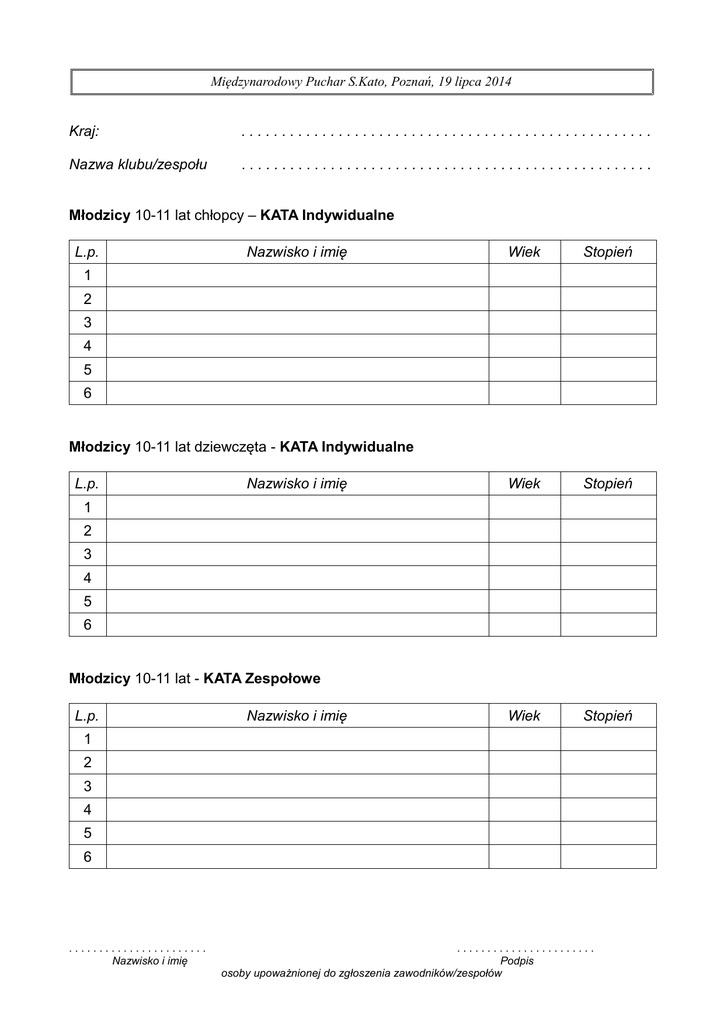 Międzynarodowy Puchar S.Kato, Poznań, 19 lipca 2014 Kraj: ................................................... Nazwa klubu/zespołu ................................................... Młodzicy 10-11 lat chłopcy – KATA Indywidualne L.p. Nazwisko i imię Wiek Stopień Wiek Stopień Wiek Stopień 1 2 3 4 5 6 Młodzicy 10-11 lat dziewczęta - KATA Indywidualne L.p. Nazwisko i imię 1 2 3 4 5 6 Młodzicy 10-11 lat - KATA Zespołowe L.p. Nazwisko i imię 1 2 3 4 5 6 ....................... Nazwisko i imię ....................... Podpis osoby upoważnionej do zgłoszenia zawodników/zespołów Międzynarodowy Puchar S.Kato, Poznań, 19 lipca 2014 Kraj: ................................................... Nazwa klubu/zespołu ................................................... Kadeci Młodsi 12-13 lat chłopcy – KATA Indywidualne L.p. Nazwisko i imię Wiek Stopień Wiek Stopień Wiek Stopień 1 2 3 4 5 6 Kadeci Młodsi 12-13 lat dziewczęta - KATA Indywidualne L.p. Nazwisko i imię 1 2 3 4 5 6 Kadeci Młodsi 12-13 lat - KATA Zespołowe L.p. Nazwisko i imię 1 2 3 4 5 6 ....................... Nazwisko i imię ....................... Podpis osoby upoważnionej do zgłoszenia zawodników/zespołów Międzynarodowy Puchar S.Kato, Poznań, 19 lipca 2014 Kraj: ................................................... Nazwa klubu/zespołu ................................................... Kadeci Młodsi 12-13 lat – KUMITE Indywidualne L.p. Nazwisko i imię Wiek Stopień 1 2 3 4 5 6 ....................... Nazwisko i imię ....................... Podpis osoby upoważnionej do zgłoszenia zawodników/zespołów Międzynarodowy Puchar S.Kato, Poznań, 19 lipca 2014 Kraj: ................................................... Nazwa klubu/zespołu ................................................... Kadeci 14-15 lat chłopcy – KATA Indywidualne L.p. Nazwisko i imię Wiek Stopień Wiek Stopień Wiek Stopień 1 2 3 4 5 6 Kadeci 14-15 lat dziewczęta - KATA Indywidualne L.p. Nazwisko i imię 1 2 3 4 5 6 Kadeci 14-15 lat chłopcy - KATA Zespołowe L.p. Nazwisko i imię 1 2 3 4 5 6 ....................... Nazwisko i imię ....................... Podpis osoby upoważnionej do zgłoszenia zawodników/zespołów Międzynarodowy Puchar S.Kato, Poznań, 19 lipca 2014 Kraj: ................................................... Nazwa klubu/zespołu ................................................... Kadeci 14-15 lat dziewczęta - KATA Zespołowe L.p. Nazwisko i imię Wiek Stopień Wiek Stopień Wiek Stopień 1 2 3 4 5 6 Kadeci 14-15 lat chłopcy – KUMITE Indywidualne L.p. Nazwisko i imię 1 2 3 4 5 6 Kadeci 14-15 lat dziewczęta – KUMITE Indywidualne L.p. Nazwisko i imię 1 2 3 4 5 6 ....................... Nazwisko i imię ....................... Podpis osoby upoważnionej do zgłoszenia zawodników/zespołów