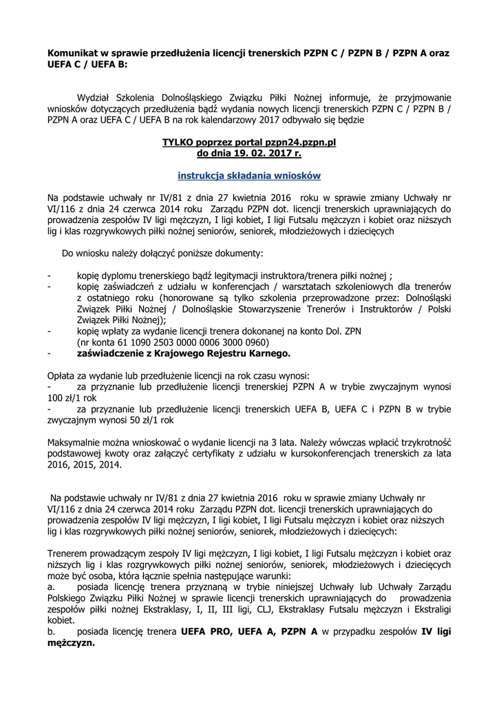 Komunikat w sprawie przedłużenia licencji trenerskich PZPN C / PZPN B / PZPN A oraz UEFA C / UEFA B: Wydział Szkolenia Dolnośląskiego Związku Piłki Nożnej informuje, że przyjmowanie wniosków dotyczących przedłużenia bądź wydania nowych licencji trenerskich PZPN C / PZPN B / PZPN A oraz UEFA C / UEFA B na rok kalendarzowy 2017 odbywało się będzie TYLKO poprzez portal pzpn24.pzpn.pl do dnia 19. 02. 2017 r. instrukcja składania wniosków Na podstawie uchwały nr IV/81 z dnia 27 kwietnia 2016 roku w sprawie zmiany Uchwały nr VI/116 z dnia 24 czerwca 2014 roku Zarządu PZPN dot. licencji trenerskich uprawniających do prowadzenia zespołów IV ligi mężczyzn, I ligi kobiet, I ligi Futsalu mężczyzn i kobiet oraz niższych lig i klas rozgrywkowych piłki nożnej seniorów, seniorek, młodzieżowych i dziecięcych Do wniosku należy dołączyć poniższe dokumenty: - - kopię dyplomu trenerskiego bądź legitymacji instruktora/trenera piłki nożnej ; kopię zaświadczeń z udziału w konferencjach / warsztatach szkoleniowych dla trenerów z ostatniego roku (honorowane są tylko szkolenia przeprowadzone przez: Dolnośląski Związek Piłki Nożnej / Dolnośląskie Stowarzyszenie Trenerów i Instruktorów / Polski Związek Piłki Nożnej); kopię wpłaty za wydanie licencji trenera dokonanej na konto Dol. ZPN (nr konta 61 1090 2503 0000 0006 3000 0960) zaświadczenie z Krajowego Rejestru Karnego. Opłata za wydanie lub przedłużenie licencji na rok czasu wynosi: za przyznanie lub przedłużenie licencji trenerskiej PZPN A w trybie zwyczajnym wynosi 100 zł/1 rok za przyznanie lub przedłużenie licencji trenerskich UEFA B, UEFA C i PZPN B w trybie zwyczajnym wynosi 50 zł/1 rok Maksymalnie można wnioskować o wydanie licencji na 3 lata. Należy wówczas wpłacić trzykrotność podstawowej kwoty oraz załączyć certyfikaty z udziału w kursokonferencjach trenerskich za lata 2016, 2015, 2014. Na podstawie uchwały nr IV/81 z dnia 27 kwietnia 2016 roku w sprawie zmiany Uchwały nr VI/116 z dnia 24 czerwca 2014 roku Zarządu PZPN dot. licencji trenerskich uprawniających do prowadzenia zespołów IV ligi mężczyzn, I ligi kobiet, I ligi Futsalu mężczyzn i kobiet oraz niższych lig i klas rozgrywkowych piłki nożnej seniorów, seniorek, młodzieżowych i dziecięcych: Trenerem prowadzącym zespoły IV ligi mężczyzn, I ligi kobiet, I ligi Futsalu mężczyzn i kobiet oraz niższych lig i klas rozgrywkowych piłki nożnej seniorów, seniorek, młodzieżowych i dziecięcych może być osoba, która łącznie spełnia następujące warunki: a. posiada licencję trenera przyznaną w trybie niniejszej Uchwały lub Uchwały Zarządu Polskiego Związku Piłki Nożnej w sprawie licencji trenerskich uprawniających do prowadzenia zespołów piłki nożnej Ekstraklasy, I, II, III ligi, CLJ, Ekstraklasy Futsalu mężczyzn i Ekstraligi kobiet. b. posiada licencję trenera UEFA PRO, UEFA A, PZPN A w przypadku zespołów IV ligi mężczyzn. c. posiada licencję trenera UEFA PRO, UEFA A, UEFA B, PZPN A w przypadku zespołów Klasy Okręgowej, II ligi Futsalu mężczyzn i kobiet, II ligi kobiet, Ligi Wojewódzkiej Juniorów Starszych i Młodszych, oraz niższych klas rozgrywkowych piłki nożnej męskiej, kobiecej, młodzieżowej i dziecięcej. d. wyjątkowo trenerzy posiadający licencję PZPN B w przypadku nieprzerwanego prowadzenia zespołu Klasy Okręgowej w sezonie 2015/2016 mogą ubiegać się o przyznanie warunkowej licencji UEFA B na okres 1 roku, uprawniającej wyłącznie do prowadzenia danego zespołu. e. posiada licencję trenera UEFA C / PZPN C w przypadku zespołów piłki nożnej dziecięcej do 12 lat i zespołów seniorów klasy A, B i C. f. posiada pełną zdolność do czynności prawnych. g. korzysta z pełni praw publicznych. h. nie może być skazana prawomocnym wyrokiem za umyślne przestępstwo, o którym mowa w art. 46-50, lub określone w rozdziale XIX,XXIII, z wyjątkiem art. 192i art.193, rozdziale XXV i XXVI ustawy z dnia 6 czerwca 1997 roku – Kodeks karny (Dz.U. Nr 88, poz. 553, z późn.zmian.), chyba że nastąpiło zatarcie skazania. i. nie może to być osoba wobec której został prawomocnie orzeczony środek karny w postaci zakazu działalności w piłce nożnej (wykonywania określonej działalności), chyba że nastąpiło zatarcie skazania lub która karze bezwzględnej dyskwalifikacji orzeczonej przez organy dyscyplinarne PZPN za przewinienie korupcji w sporcie. j. nie może to być osoba, wobec której toczy się postępowanie dyscyplinarne za przewinienia określone w art. 79 Regulaminu Dyscyplinarnego PZPN. Wnioski składane po tym terminie będą rozpatrywane w trybie nadzwyczajnym, co będzie skutkowało poniesieniem wyższej opłaty! Opłata dodatkowa za wydanie lub przedłużenie licencji w trybie nadzwyczajnym wynosi (zgodnie z uchwałą nr IV/81 z dnia 27 kwietnia 2016 roku Zarządu Polskiego Związku Piłki Nożnej): * * * * za za za za licencję licencję licencję licencję PZPN A UEFA B PZPN B UEFA C - 2.000 PLN 500 PLN 300 PLN 100 PLN Prowadzenie zespołu piłki nożnej podczas rozgrywek mistrzowskich i pucharowych przez trenera nie posiadającego ważnej licencji trenerskiej PZPN powoduje zastosowanie następujących kar dyscyplinarnych w stosunku do: 1.1 Klubu IV ligi: a) pierwszy mecz b) drugi mecz c) trzeci mecz – kara pieniężna 1.200 złotych – kara pieniężna 1.800 złotych – weryfikacja zawodów jako walkower (3:0) dla zespołu przeciwnego. 1.2 Klubu Klasy Okręgowej, Ligi wojewódzkiej juniorów starszych i młodszych, I i II ligi kobiet, I i II ligi Futsalu, oraz niższych klas rozgrywkowych piłki nożnej męskiej, kobiecej, młodzieżowej: a) pierwszy mecz – kara pieniężna 700 złotych b) drugi mecz – kara pieniężna 1.200 złotych c) trzeci mecz – weryfikacja zawodów jako walkower (3:0) dla zespołu przeciwnego. 1.3 Klubu seniorów A klasy, B klasy, C Klasy, zespołów dziecięcych: a) pierwszy mecz 