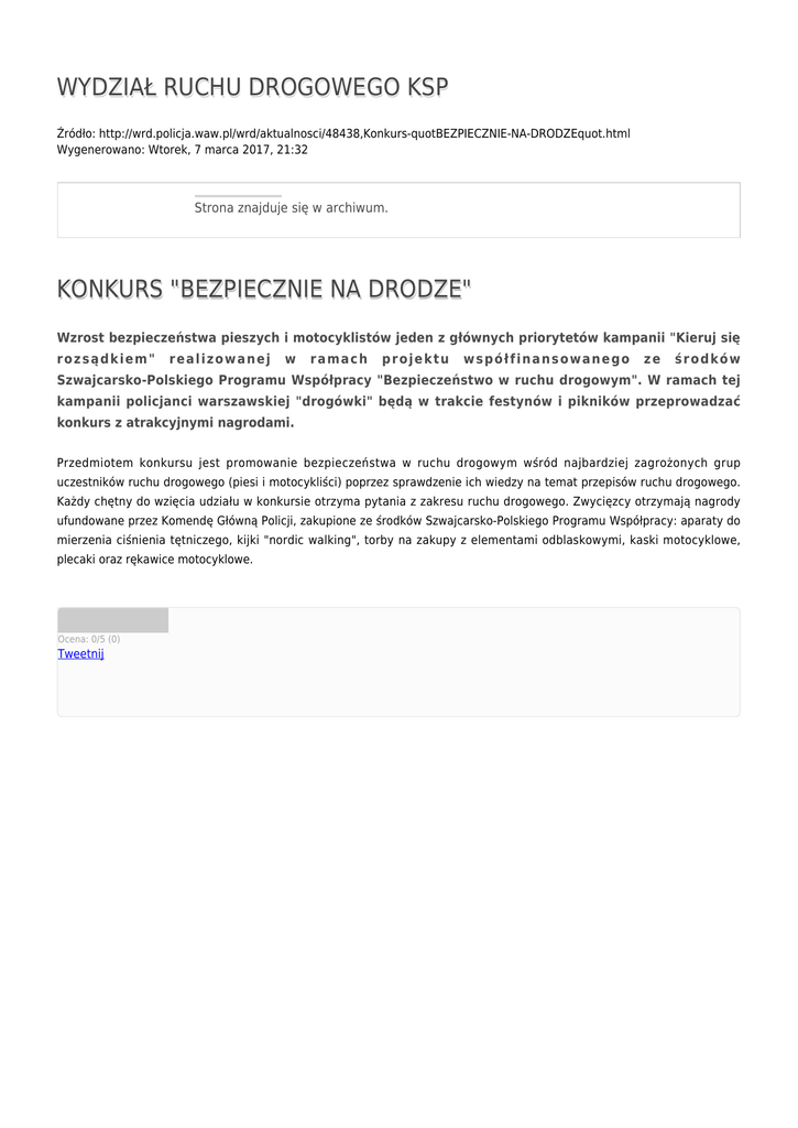 WYDZIAŁ RUCHU DROGOWEGO KSP Źródło: http://wrd.policja.waw.pl/wrd/aktualnosci/48438,Konkurs-quotBEZPIECZNIE-NA-DRODZEquot.html Wygenerowano: Wtorek, 7 marca 2017, 21:32 Strona znajduje się w archiwum. KONKURS "BEZPIECZNIE NA DRODZE" Wzrost bezpieczeństwa pieszych i motocyklistów jeden z głównych priorytetów kampanii "Kieruj się rozsądkiem" realizowanej w ramach projektu współfinansowanego ze środków Szwajcarsko-Polskiego Programu Współpracy "Bezpieczeństwo w ruchu drogowym". W ramach tej kampanii policjanci warszawskiej "drogówki" będą w trakcie festynów i pikników przeprowadzać konkurs z atrakcyjnymi nagrodami. Przedmiotem konkursu jest promowanie bezpieczeństwa w ruchu drogowym wśród najbardziej zagrożonych grup uczestników ruchu drogowego (piesi i motocykliści) poprzez sprawdzenie ich wiedzy na temat przepisów ruchu drogowego. Każdy chętny do wzięcia udziału w konkursie otrzyma pytania z zakresu ruchu drogowego. Zwycięzcy otrzymają nagrody ufundowane przez Komendę Główną Policji, zakupione ze środków Szwajcarsko-Polskiego Programu Współpracy: aparaty do mierzenia ciśnienia tętniczego, kijki "nordic walking", torby na zakupy z elementami odblaskowymi, kaski motocyklowe, plecaki oraz rękawice motocyklowe. Ocena: 0/5 (0) Tweetnij