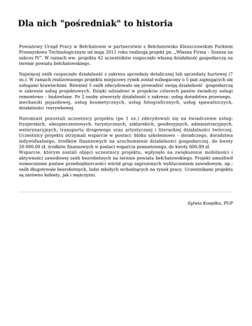Dla nich "pośredniak" to historia Powiatowy Urząd Pracy w Bełchatowie w partnerstwie z Bełchatowsko Kleszczowskim Parkiem Przemysłowo Technologicznym od maja 2011 roku realizują projekt pn. „Własna Firma – Szansa na sukces IV”. W ramach ww. projektu 42 uczestników rozpoczęło własną działalność gospodarczą na terenie powiatu bełchatowskiego. Najwięcej osób rozpoczęło działalność z zakresu sprzedaży detalicznej lub sprzedaży hurtowej (7 os.). W ramach realizowanego projektu miejscowy rynek został wzbogacony o 5 pań zajmujących się usługami krawieckimi. Również 5 osób zdecydowało się prowadzić swoją działalność gospodarczą w zakresie usług projektowych. Dzięki udziałowi w projekcie czterech panów świadczy usługi remontowo – budowlane. Po 2 osoby utworzyły działalność z zakresu: usług doradztwa prawnego, mechaniki pojazdowej, usług kosmetycznych, usług fotograficznych, usług spawalniczych, działalności rozrywkowej. Natomiast pozostali uczestnicy projektu (po 1 os.) zdecydowali się na świadczenie usług: fryzjerskich, ubezpieczeniowych, turystycznych, szklarskich, geodezyjnych, administracyjnych, weterynaryjnych, transportu drogowego oraz artystycznej i literackiej działalności twórczej. Uczestnicy projektu otrzymali wsparcie w postaci: bloku szkoleniowo – doradczego, doradztwa indywidualnego, środków finansowych na uruchomienie działalności gospodarczej, do kwoty 20.000,00 zł, środków finansowych w postaci wsparcia pomostowego, do kwoty 600,00 zł. Wsparcie, którym zostali objęci uczestnicy projektu, wpłynęło na zwiększenie mobilności i aktywności zawodowej osób bezrobotnych na terenie powiatu bełchatowskiego. Projekt umożliwił wzmocnienie postaw przedsiębiorczości wśród grup zagrożonych wykluczeniem zawodowym, np.: osób długotrwale bezrobotnych, ludzi młodych wchodzących na rynek pracy. Uczestnikami projektu są zarówno kobiety, jak i mężczyźni. Sylwia Kosędka, PUP