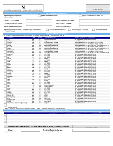 N Numer zlecenia NAWOZY ORGANICZNE I ORGANICZNO MINERALNE (wypełnia pracownik CentLab) INFORMACJE O PRÓBKACH Sposób poboru probek: przez Zleceniodawce przez pracownika CentLab (właściwe oznaczyć) Data poboru próbek: Godzina poboru próbek: Liczba próbek do badań: Oznaczenia próbek: Temp. przechowywania: Rodzaj opakowania: Sposób postepowania z próbkami po badaniach: zwrot Zleceniodawcy archiwizacja CentLab do zniszczenia (właściwe oznaczyć) RODZAJ ZLECONYCH BADAŃ W sytuacji w której wymagane jest inne badanie niż poniżej, prosze o kontakt z Kierownikiem CentLab badania: pH * sucha masa azotany * chlorki * chlorki * fluorki * fluorki * fosforany * siarczany * siarczany * antymon* arsen* bar* chrom chrom* cynk cynk* fosfor* glin* kadm* kadm magnez* mangan* miedż miedż* molibden* nikiel nikiel* ołów ołów* potas* rtęć rtęć selen* sód* wapń* żelazo* OW (TC) OWN (TIC) OWO (TOC) PCB PCDD/PCDF WWA zawartość substancji organicznej A/NA R/NR NA NA NA NA NA NA NA NA NA NA NA NA NA A NA A NA NA NA NA A NA NA A NA NA A NA A NA NA A A NA NA NA NA NA NA NA NA NA NA NA R R R R NR R NR R R NR R R R R R R R R R R R R R R R R R R R R R NR NR R R R R R R R NR R R R * wyciągi wodne A/NA – metodyka akredytowana / nieakredytowana metoda badania: norma / procedura badawcza: potencjometrycznie wagowa chromatografia jonowa chromatografia jonowa elektroforeza kapilarna chromatografia jonowa elektroforeza kapilarna chromatografia jonowa chromatografia jonowa elektroforeza kapilarna ICP-OES ICP-OES ICP-OES FAAS ICP-OES FAAS ICP-OES ICP-OES ICP-OES ICP-OES FAAS ICP-OES ICP-OES FAAS ICP-OES ICP-OES FAAS ICP-OES FAAS ICP-OES ICP-OES ASA / AMA 254 ASA / DMA-80 ICP-OES ICP-OES ICP-OES ICP-OES NDIR NDIR NDIR GC-ECD GC/MS/MS HPLC-FLD wagowa BL-PB-18 metodyka metodyka metodyka metodyka metodyka metodyka metodyka metodyka metodyka BL-PB-10 BL-PB-10 BL-PB-10 BL-PB-11 BL-PB-10 BL-PB-11 BL-PB-10 BL-PB-10 BL-PB-10 BL-PB-10 BL-PB-11 BL-PB-10 BL-PB-10 BL-PB-11 BL-PB-10 BL-PB-10 BL-PB-11 BL-PB-10 BL-PB-11 BL-PB-10 BL-PB-10 BL-PB-13 BL-PB-20 BL-PB-10 BL-PB-10 BL-PB-10 BL-PB-10 BL-PB-17 BL-PB-17 BL-PB-17 BL-PB-15 metodyka BL-PB-14 metodyka wyd. 3 z dnia 25.06.2015 własna własna wg PN-EN ISO 10304-1:2009 własna wg PN-EN ISO 10304-1:2009 własna wg BL-PB-05 wyd.10 z dnia 28.05.2015 własna wg PN-EN ISO 10304-1:2009 własna wg BL-PB-05 wyd.10 z dnia 28.05.2015 własna wg PN-EN ISO 10304-1:2009 własna wg PN-EN ISO 10304-1:2009 własna wg BL-PB-05 wyd.10 z dnia 28.05.2015 wyd. 9 z dnia 30.06.2015 wyd. 9 z dnia 30.06.2015 wyd. 9 z dnia 30.06.2015 wyd. 8 z dnia 01.07.2015 wyd. 9 z dnia 30.06.2015 wyd. 8 z dnia 01.07.2015 wyd. 9 z dnia 30.06.2015 wyd. 9 z dnia 30.06.2015 wyd. 9 z dnia 30.06.2015 wyd. 9 z dnia 30.06.2015 wyd. 8 z dnia 01.07.2015 wyd. 9 z dnia 30.06.2015 wyd. 9 z dnia 30.06.2015 wyd. 8 z dnia 01.07.2015 wyd. 9 z dnia 30.06.2015 wyd. 9 z dnia 30.06.2015 wyd. 8 z dnia 01.07.2015 wyd. 9 z dnia 30.06.2015 wyd. 8 z dnia 01.07.2015 wyd. 9 z dnia 30.06.2015 wyd. 9 z dnia 30.06.2015 wyd. 5 z dnia 28.02.2015 wyd. 2 z dnia 29.05.2015 wyd. 9 z dnia 30.06.2015 wyd. 9 z dnia 30.06.2015 wyd. 9 z dnia 30.06.2015 wyd. 9 z dnia 30.06.2015 wyd. 5 z dnia 14.02.2015 wyd. 5 z dnia 14.02.2015 wyd. 5 z dnia 14.02.2015 wyd. 5 z dnia 30.06.2015 własna wyd. 6 z dnia 30.05.2015 własna R/NR – metodyka referencyjna / niereferencyjna BADANIA ZLECONE PODWYKONAWCY badania: metoda badania: norma / procedura badawcza: Sprawdziłem aktualność zakresu akredytacji podwykonawcy badań Data: (wypełnia Zleceniodawca) Podpis Zleceniodawcy: (wypełnia Zleceniodawca) nr akredytacji PCA : Podpis pracownika CentLab