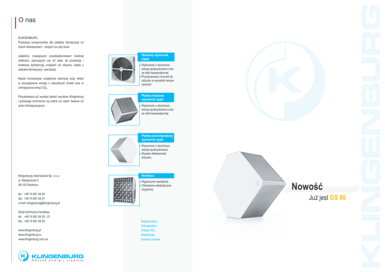 O nas KLINGENBURG Produkcja komponentów dla układów klimatyzacji od trzech dziesięcioleci – eksport na cały świat Jesteśmy rozwojowym przedsiębiorstwem średniej wielkości, zajmującym się od wielu lat produkcją i światową dystrybucją urządzeń do odzysku ciepła z układów klimatyzacji i wentylacji. Nasze innowacyjne urządzenia stanowią duży wkład w oszczędzanie energii z naturalnych źródeł oraz w zmniejszanie emisji CO2. Przysłowiowa już wysoka jakość wyrobów Klingenburg i przewaga techniczna są znane na całym świecie na rynku klimatyzacyjnym. Obrotowy wymiennik ciepła Wykonanie z aluminium, wersja epoksydowana oraz ze stali kwasoodpornej Przystosowany również do odzysku w wysokich temperaturach Płytowy krzyżowy wymiennik ciepła Wykonanie z aluminium, wersja epoksydowana oraz ze stali kwasoodpornej Płytowy przeciwprądowy wymiennik ciepła Wykonanie z aluminium, wersja epoksydowana Wysoka efektywność odzysku Nawilżacz Klingenburg International Sp. z o.o. ul. Metalowców 5 58-100 Świdnica Higieniczne nawilżanie Chłodzenie adiabatyczne (wyparne) tel.: +48 74 851 54 00 fax: +48 74 851 54 01 e-mail: [email protected] Już jest GS 80 Dział techniczno-handlowy tel.: +48 74 851 54 20 - 21 fax: +48 74 851 54 25 Regeneratory Rekuperatory Układy DEC Nawilżacze Budowa jachtów www.klingenburg.pl www.klingenburg.ru www.klingenburg.com.ua O d z y s k e n e r g i i Nowość c i e p l n e j Paleta produktów Klingenburg - wymienniki przeciwprądowe raco op fazie Zapowiedź nowości Pięć wielkości naszych wymienników przeciwprądowych wytwarzanych w ciągu ostatnich lat to największa oferta na rynku. Nie produkujemy wymienników z tworzywa ze względu na liczne zagrożenia i ryzyko oraz ich krótką żywotność. Wymienniki od początku wykonywane są maszynowo z aluminium odpornego na wodę morską, co zapewnia powtarzalność wyrobu z jego wszystkimi zaletami. Jak już zapowiedziano na targach ISH Aircontec 2007, asortyment poszerzony zostanie jeszcze o trzy wielkości . Podwójne zagięcie płyt zapewnia stabilność przy dużych konstrukcjach Bezpieczeństwo i zaufanie Wymiarowanie Wymiary D E B A 21 mm C 246 mm Produkty Klingenburg stale wyznaczają nowe standardy. Własny dział rozwoju i własna produkcja maszyn wytwórczych dają nam elastyczność do zaspokajania Państwa potrzeb. Dziś i jutro. Zapraszamy do skorzystania z nowej technologii w istotnym podzespole układu klimatyzacji i wentylacji. Typ A [mm] B [mm] C [mm] D [mm] E [mm] GS 18 404 176 dowolne 100 114 GS 25 454 230 dowolne 134 148 GS 30 496 271 dowolne 163 177 GS 35 537 312 dowolne 193 206 GS 45 619 394 dowolne 249 264 GS 62 758 534 dowolne 347 362 Wysoka efektywność odzysku wymienników przeciwprądowych potwierdzone zostały w wielu testach. Wiodący producenci sprzętu klimatyzacyjnego zlecili przeprowadzenie certyfikacji swoich urządzeń klimatyzacyjnych z wymiennikami przeciwprądowymi Klingenburg GS. GS 80 899 674 dowolne 447 462 Kompatybilność GS 95 1040 815 dowolne 547 562 GS 110 1182 957 dowolne Zastrzegamy sobie prawo do zmian technicznych 647 662 Wymienniki przeciwprądowe są kompatybilne ze standardowymi krzyżowymi wymiennikami płytowymi. Te kombinowane wymienniki stosowane są do dużych prze- Efektywność [%] on den sac ją 90 GS 85 G G G 25 S 30 S 35 S 45 GS 62 GS G GS 80 S 95 110 bez kon den sac ji 80 GS 11 0 80 120 35 30 GS 140 GS 160 45 GS 62 GS 180 25 Szczelność, higiena, stabilność kształtu i trwałość, to podstawowe cechy wymienników przeciwprądowych firmy Klingenburg. Jak wiadomo, wymagania w stosunku do wymienników rosną przy zwiększających się wydajnościach powietrza, GS 80 i jego obaj więksi „bracia“ wyposażeni są w podwójne zagięcie na krawędziach wlotowych i wylotowych, dzięki czemu posiadają ponad 5-krotną grubość materiału w tym obszarze. G GS 80 S 95 110 z k GS śc ko Wiel ść Nowo ane kow rodu ep cni i obe opr GS 62 100 80 60 40 20 2000 1000 500 200 100 50 500 400 300 200 100 Szerokość pakietu [mm] W ia an wyw 5 y acow GS GS GS GS GS 45 25 30 35 GS 8 GS 1 5 zie W fa ia wan 95 Straty ciśnienia [Pa] 0 GS 3 5 2 GS 2 GS 6 GS 4 GS 3 0 GS 8 5 GS 9 10 GS 1 W toku jest też opracowanie małego płaskiego przeciwprądowego wymiennika GS18, który z uwagi na niewielką wysokość konstrukcyjną (przy pionowych lamelach) przeznaczony jest przede wszystkim do zastosowania w przestrzeniach międzysufitowych. Wykres wydajności Strumień objętości [m3/h] Już jest Obecnie dostępny jest szósty rozmiar GS 80 z przepływem do 1500 m3/h (przy szerokości pakietu 500 mm) ( ). Wkrótce pojawią się wielkości ( ): GS 95 (do 1750 m3/h, przy szerokości pakietu 500mm) i GS 110 (do 2000 m3/h, przy szerokości pakietu 500 mm). Wykres wydajności tych samych strumieni powietrza nawiewanego i wywiewanego pływów. W przypadku tej kombinacji strumień objętości powietrza ulega podwojeniu, przy takiej samej szerokości pakietu. Zasada działania wymiennika kombinowanego