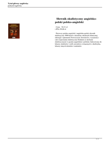 Tytuł główny nagłówka podtytuł nagłówka Słownik okulistyczny angielskopolski polsko-angielski Cena: 94.31 zł (-5%) 99.00 zł Pierwszy polsko-angielski i angielsko-polski słownik okulistyczny 5000 haseł z dziedziny okulistyki klinicznej, chirurgii i optometrii Nowoczesne słownictwo, wyrażenia i całe rozpoznania okulistyczne Dodatek ze skrótami okulistycznymi w języku angielskim i polskim Adresowany do lekarzy okulistów i osób zawodowo związanych z okulistyką, lekarzy innych dziedzin i studentów 1/1 Powered by TCPDF (www.tcpdf.org)