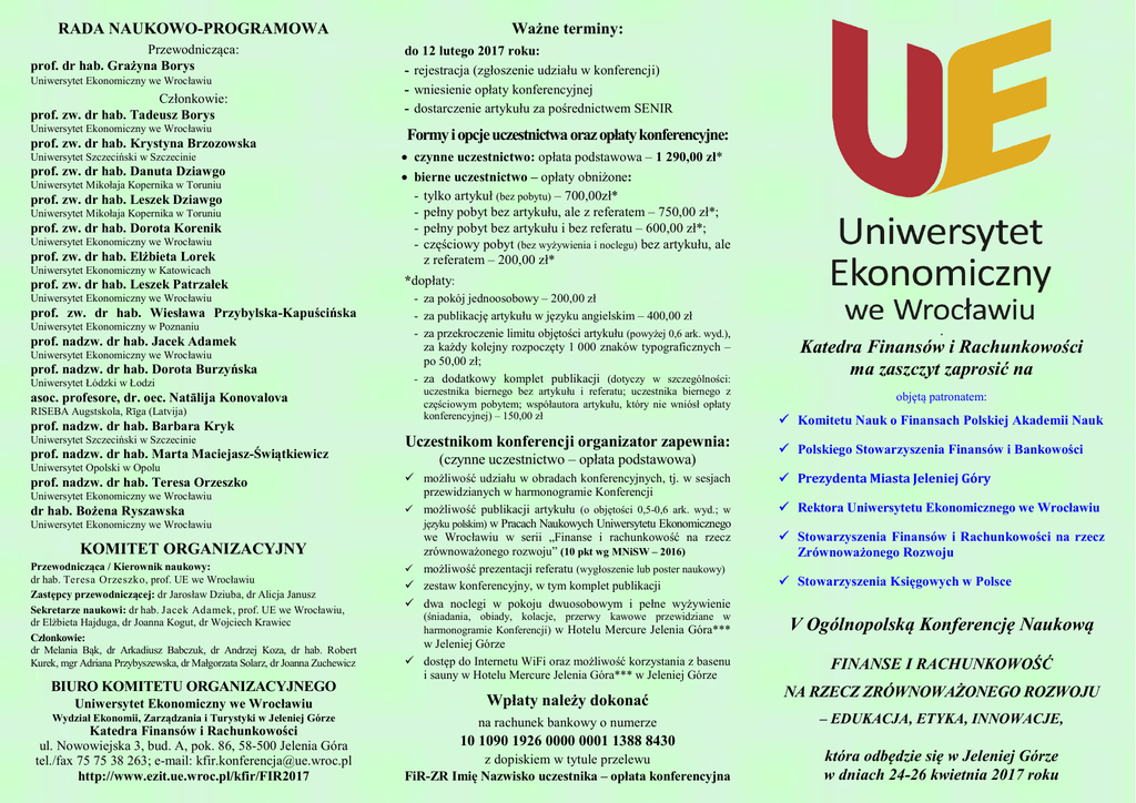 RADA NAUKOWO-PROGRAMOWA Przewodnicząca: prof. dr hab. Grażyna Borys Uniwersytet Ekonomiczny we Wrocławiu Członkowie: prof. zw. dr hab. Tadeusz Borys Uniwersytet Ekonomiczny we Wrocławiu prof. zw. dr hab. Krystyna Brzozowska Uniwersytet Szczeciński w Szczecinie prof. zw. dr hab. Danuta Dziawgo Uniwersytet Mikołaja Kopernika w Toruniu prof. zw. dr hab. Leszek Dziawgo Uniwersytet Mikołaja Kopernika w Toruniu prof. zw. dr hab. Dorota Korenik Uniwersytet Ekonomiczny we Wrocławiu prof. zw. dr hab. Elżbieta Lorek Uniwersytet Ekonomiczny w Katowicach prof. zw. dr hab. Leszek Patrzałek Uniwersytet Ekonomiczny we Wrocławiu prof. zw. dr hab. Wiesława Przybylska-Kapuścińska Uniwersytet Ekonomiczny w Poznaniu prof. nadzw. dr hab. Jacek Adamek Uniwersytet Ekonomiczny we Wrocławiu prof. nadzw. dr hab. Dorota Burzyńska Uniwersytet Łódzki w Łodzi asoc. profesore, dr. oec. Natālija Konovalova RISEBA Augstskola, Rīga (Latvija) prof. nadzw. dr hab. Barbara Kryk Uniwersytet Szczeciński w Szczecinie prof. nadzw. dr hab. Marta Maciejasz-Świątkiewicz Uniwersytet Opolski w Opolu prof. nadzw. dr hab. Teresa Orzeszko Uniwersytet Ekonomiczny we Wrocławiu dr hab. Bożena Ryszawska Uniwersytet Ekonomiczny we Wrocławiu KOMITET ORGANIZACYJNY Przewodnicząca / Kierownik naukowy: dr hab. Teresa Orzeszko, prof. UE we Wrocławiu Zastępcy przewodniczącej: dr Jarosław Dziuba, dr Alicja Janusz Sekretarze naukowi: dr hab. Jacek Adamek, prof. UE we Wrocławiu, dr Elżbieta Hajduga, dr Joanna Kogut, dr Wojciech Krawiec Członkowie: dr Melania Bąk, dr Arkadiusz Babczuk, dr Andrzej Koza, dr hab. Robert Kurek, mgr Adriana Przybyszewska, dr Małgorzata Solarz, dr Joanna Zuchewicz BIURO KOMITETU ORGANIZACYJNEGO Ważne terminy: do 12 lutego 2017 roku: - rejestracja (zgłoszenie udziału w konferencji) - wniesienie opłaty konferencyjnej - dostarczenie artykułu za pośrednictwem SENIR Formy i opcje uczestnictwa oraz opłaty konferencyjne: czynne uczestnictwo: opłata podstawowa – 1 290,00 zł* bierne uczestnictwo – opłaty obniżone: - tylko artykuł (bez pobytu) – 700,00zł* - pełny pobyt bez artykułu, ale z referatem – 750,00 zł*; - pełny pobyt bez artykułu i bez referatu – 600,00 zł*; - częściowy pobyt (bez wyżywienia i noclegu) bez artykułu, ale z referatem – 200,00 zł* *dopłaty: - za pokój jednoosobowy – 200,00 zł - za publikację artykułu w języku angielskim – 400,00 zł - za przekroczenie limitu objętości artykułu (powyżej 0,6 ark. wyd.), za każdy kolejny rozpoczęty 1 000 znaków typograficznych – po 50,00 zł; - za dodatkowy komplet publikacji (dotyczy w szczególności: uczestnika biernego bez artykułu i referatu; uczestnika biernego z częściowym pobytem; współautora artykułu, który nie wniósł opłaty konferencyjnej) – 150,00 zł Uczestnikom konferencji organizator zapewnia: (czynne uczestnictwo – opłata podstawowa) możliwość udziału w obradach konferencyjnych, tj. w sesjach przewidzianych w harmonogramie Konferencji możliwość publikacji artykułu (o objętości 0,5-0,6 ark. wyd.; w języku polskim) w Pracach Naukowych Uniwersytetu Ekonomicznego we Wrocławiu w serii „Finanse i rachunkowość na rzecz zrównoważonego rozwoju” (10 pkt wg MNiSW – 2016) możliwość prezentacji referatu (wygłoszenie lub poster naukowy) zestaw konferencyjny, w tym komplet publikacji dwa noclegi w pokoju dwuosobowym i pełne wyżywienie (śniadania, obiady, kolacje, przerwy kawowe przewidziane w harmonogramie Konferencji) w Hotelu Mercure Jelenia Góra*** w Jeleniej Górze dostęp do Internetu WiFi oraz możliwość korzystania z basenu i sauny w Hotelu Mercure Jelenia Góra*** w Jeleniej Górze Uniwersytet Ekonomiczny we Wrocławiu Wpłaty należy dokonać Wydział Ekonomii, Zarządzania i Turystyki w Jeleniej Górze na rachunek bankowy o numerze Katedra Finansów i Rachunkowości ul. Nowowiejska 3, bud. A, pok. 86, 58-500 Jelenia Góra tel./fax 75 75 38 263; e-mail: [email protected] http://www.ezit.ue.wroc.pl/kfir/FIR2017 10 1090 1926 0000 0001 1388 8430 z dopiskiem w tytule przelewu FiR-ZR Imię Nazwisko uczestnika – opłata konferencyjna Katedra Finansów i Rachunkowości ma zaszczyt zaprosić na objętą patronatem: Komitetu Nauk o Finansach Polskiej Akademii Nauk Polskiego Stowarzyszenia Finansów i Bankowości Prezydenta Miasta Jeleniej Góry Rektora Uniwersytetu Ekonomicznego we Wrocławiu Stowarzyszenia Finansów i Rachunkowości na rzecz Zrównoważonego Rozwoju Stowarzyszenia Księgowych w Polsce V Ogólnopolską Konferencję Naukową FINANSE I RACHUNKOWOŚĆ NA RZECZ ZRÓWNOWAŻONEGO ROZWOJU – EDUKACJA, ETYKA, INNOWACJE, która odbędzie się w Jeleniej Górze w dniach 24-26 kwietnia 2017 roku Cele konferencji: Prezentacja wyników badań oraz wymiana poglądów i doświadczeń w gronie naukowców zainteresowanych tematyką zrównoważonego rozwoju, w szczególności w kontekście finansów i rachunkowości oraz edukacji, etyki i innowacji. Pogłębienie wiedzy na temat zrównoważonego rozwoju, w tym o: - jego znaczeniu dla pomyślności społeczeństw i gospodarek oraz dobrostanu środowiska naturalnego, - możliwościach jego utrwalania poprzez doskonalenie działania systemów finansowych, procesów zarządzania finansami oraz rachunkowości. Rozwój nauk ekonomicznych (ekonomii, finansów, zarządzania) i krzewienie edukacji ekonomicznej. Popularyzacja wiedzy o różnorodnych aspektach zrównoważonego rozwoju. Integracja środowisk – pracowników naukowych z różnych ośrodków naukowo-badawczych; uczonych z różnym doświadczeniem w pracy naukowej; nauczycieli akademickich, doktorantów i studentów; naukowców i praktyków. Tematyka konferencji: 1. Sektor finansow y a zrów now ażoneg o rozw oju: cele i zasady - pomiar wiarygodności i odpowiedzialność podmiotowa banku centralnego, - standardy etyczne w polityce pieniężnej, - pieniądz wirtualny i jego wpływ na systemy monetarne, - standardy etyczne w transakcjach 