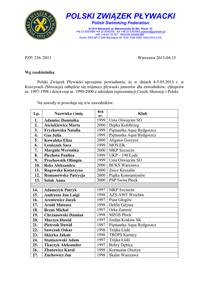 POLSKI ZWIĄZEK PŁYWACKI Polish Swimming Federation 01-813 Warszawa ul. Marymoncka 34 Skr. Poczt. 37 +48 22 8353589,+48 22 8342556, fax +48 22 8353983 [email protected] NIP:118-01-72-707 REGON 000866389 Konto: PKO BP II O/M Warszawa 90 1020 1026 0000 1502 0015 2132 PZP/ 236 /2013 Warszawa 2013-04-15 Wg rozdzielnika Polski Związek Pływacki uprzejmie powiadamia, że w dniach 4-5.05.2013 r. w Koszycach (Słowacja) odbędzie się trójmecz pływacki juniorów dla zawodników, chłopców ur. 1997-1998 i dziewcząt ur. 1999-2000 z udziałem reprezentacji Czech, Słowacji i Polski. Na zawody te powołuje się n/w zawodników: Lp. 1. 2. 3. 4. 5. 6. 7. 8. 9. 10. 11. 12. 13. 14. 15. 16. 17. 18. 19. 20. 21. 22. 23. 24. 25. 26. 27. Nazwisko i imię Rok ur. Klub Adamiec Dominika Aściukiewicz Marta Fryckowska Natalia Gus Julia Kowalska Eliza Leończuk Sara Margula Weronika Piechota Paulina Prochownik Olimpia Reks Aleksandra Rogowska Katarzyna Romanowska Patrycja Solak Anna 1999 2000 1999 1999 2000 1999 2000 1999 1999 2000 2000 2000 2000 Unia Oświęcim SO Depka Kołobrzeg Piętnastka Aqua Bydgoszcz Piętnastka Aqua Bydgoszcz Aligator Gorzyce MOS Ełk MKP Szczecin UKP – 190 Łodź Unia Oświęcim SO BUKS Warszawa Znicz Koszalin Piątka Konstantynów PSP Swim Płock Adamczyk Patryk Andreose Jan Luigi Arentewicz Jacek Arndt Mateusz Brzuś Michał Chrzanowski Damian Murzyn Dawid Pietrzak Dawid Sawczuk Oskar Skierka Jakub Staniszewski Adam Tkaczyk Aleksander Zbutowicz Karol Zuchowicz Jan 1997 1998 1997 1998 1997 1998 1997 1997 1998 1998 1997 1997 1998 1998 MKP Szczecin AZS-AWF Wrocław Piast Głogów Delfin Gdynia Orka Zamość MZOS Płock Jordan Kraków SK Piętnastka Aqua Bydgoszcz Trójka Łódź TROPS Kartuzy Trójka Łódź Bobry Dębica Kormoran Olsztyn Skalar Warszawa Prosimy także o oddelegowanie: 1. 2. 3. 4. 5. 6. 7. 8. Dorywalski Marek Grabysa Tomasz Czoków Przemysław Grzyb Daniel Kotus Tomasz Przasnek Beata Zemła Piotr Wiśniewski Paweł PZP Kormoran Olsztyn Delfin Gdynia Piętnastka Bydgoszcz Piątka Konstantynów MKP Szczecin Oświęcim PZP Kierownik Ekipy Trener Trener Trener Trener Trener Fizjoterapeuta Sędzia Wyjazd na zawody nastąpi 3 maja 2013 z Oświęcimia o godzinie 8.30 spod Krytej Pływalni MOSiR w Oświęcimiu ul. Chemików 2, 32-600 Oświęcim. Powrót z zawodów nastąpi w dniu 5 maja 2013 roku około godziny 19.00-20.00. W trakcie powrotu istnieje możliwość przejazdu przez Dworzec PKP Kraków Główny około godziny 18.00-19.00 (zależnie od natężenia ruchu drogowego). Zbiórka powołanych 1 maja w Hotelu „Salezjanie” w Oświęcimiu ul. Jagiełły do godziny 19.00 /od kolacji/. W sprawie potwierdzenia udziału w konsultacji szkoleniowej w Oświęcimiu /środa piątek/ oraz startów poza konkursem w Koszycach prosimy o kontakt z Kierownikiem p. Markiem Dorywalskim /do dnia 22.04.2013/ na adres [email protected] tel. 608 361 661 W ramach konsultacji przewidziane są treningi na pływalni MOSiR Oświęcim /basen 50m/ w czwartek oraz piątek rano. Zawodnicy proszeni są o zabranie sprzętu treningowego. Powołani zostaną wyposażeni w sprzęt firmy ARENA według następujących zasad: - uczestnicy wielomeczu w Poznaniu (otrzymali sprzęt na zawody w Poznaniu) -zawodnicy, którzy otrzymali w ubiegłym roku dres otrzymają koszulkę, szorty, klapki (zawodnicy ponadto czepki, slipy/kostiumy, okulary) - pozostali: dres, koszulkę, szorty, klapki (zawodnicy ponadto czepki, slipy/kostiumy, okulary), pozostały sprzęt indywidualny do zawodów należy zabrać ze sobą. Prosimy o bezzwłoczne podanie rozmiarów: koszulki i dresy (XL, L, M, S), klapki, kostiumy startowe arena wg rozmiarów „INT” kostium ARENA XP na adres [email protected] lub [email protected]. Uwaga: osoby, które otrzymały w ubiegłym roku dresy w bieżącym roku ich nie otrzymają, proszone są o zabranie posiadanego już sprzętu. Zawodnicy niepełnoletni muszą posiadać pisemne zgody rodziców na wyjazd, a ci którzy po powrocie nie będą odbierani przez swoich rodziców ponadto muszą posiadać pisemne upoważnienia opiekunów prawnych do odbioru przez wskazane osoby trzecie. Osoby wyjeżdżające z PZP po raz pierwszy proszone są o bezzwłoczne podanie (emailem [email protected] lub [email protected] faxem lub telefonicznie) dat urodzenia, adresu zamieszkania i nr. paszportu do ubezpieczenia. Koszty przyjazdu do Oświęcimia i powrót do miejsc zamieszkania po zawodach pokrywają jednostki delegujące. Pozostałe koszty pokrywa PZP. Kierownik Organizacyjno-Szkoleniowy PZP mgr Jerzy Kowalski Otrzymują: 1. Zainteresowane Kluby/SMS 2. a/a PREZES Andrzej Kowalski Program zawodów: