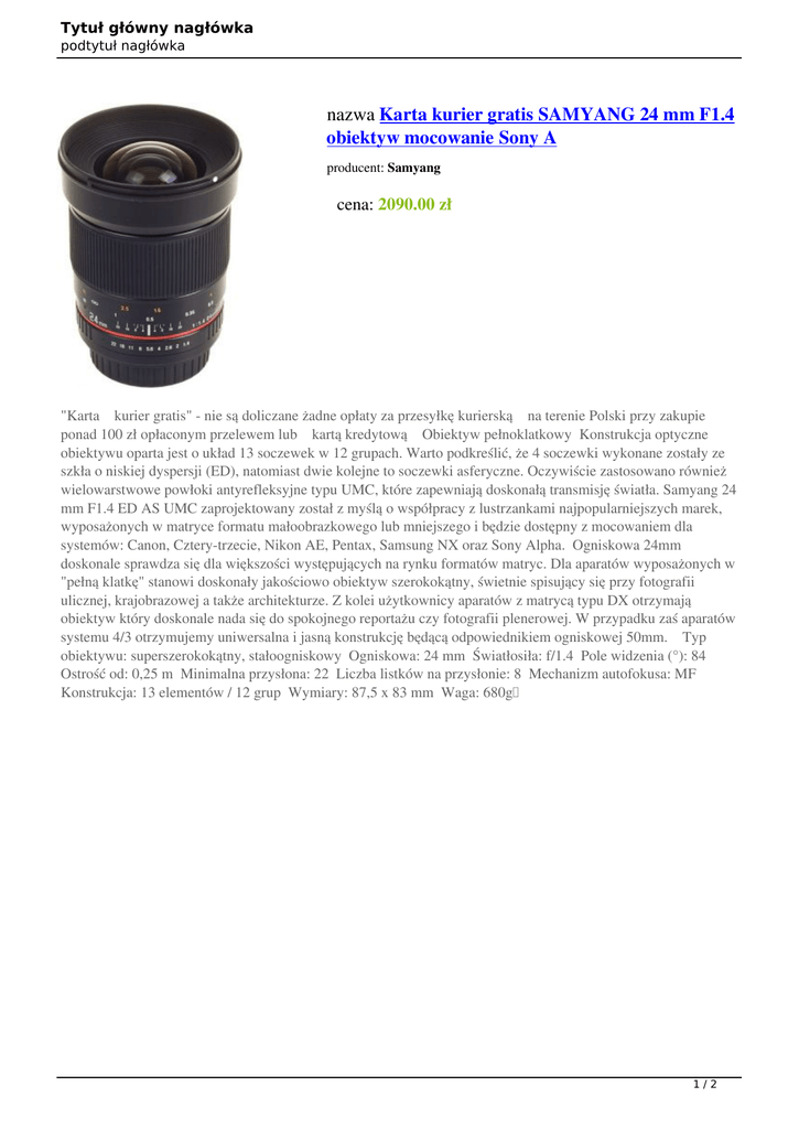 Tytuł główny nagłówka podtytuł nagłówka nazwa Karta kurier gratis SAMYANG 24 mm F1.4 obiektyw mocowanie Sony A producent: Samyang cena: 2090.00 zł "Karta kurier gratis" - nie są doliczane żadne opłaty za przesyłkę kurierską na terenie Polski przy zakupie ponad 100 zł opłaconym przelewem lub kartą kredytową Obiektyw pełnoklatkowy Konstrukcja optyczne obiektywu oparta jest o układ 13 soczewek w 12 grupach. Warto podkreślić, że 4 soczewki wykonane zostały ze szkła o niskiej dyspersji (ED), natomiast dwie kolejne to soczewki asferyczne. Oczywiście zastosowano również wielowarstwowe powłoki antyrefleksyjne typu UMC, które zapewniają doskonałą transmisję światła. Samyang 24 mm F1.4 ED AS UMC zaprojektowany został z myślą o współpracy z lustrzankami najpopularniejszych marek, wyposażonych w matryce formatu małoobrazkowego lub mniejszego i będzie dostępny z mocowaniem dla systemów: Canon, Cztery-trzecie, Nikon AE, Pentax, Samsung NX oraz Sony Alpha. Ogniskowa 24mm doskonale sprawdza się dla większości występujących na rynku formatów matryc. Dla aparatów wyposażonych w "pełną klatkę" stanowi doskonały jakościowo obiektyw szerokokątny, świetnie spisujący się przy fotografii ulicznej, krajobrazowej a także architekturze. Z kolei użytkownicy aparatów z matrycą typu DX otrzymają obiektyw który doskonale nada się do spokojnego reportażu czy fotografii plenerowej. W przypadku zaś aparatów systemu 4/3 otrzymujemy uniwersalna i jasną konstrukcję będącą odpowiednikiem ogniskowej 50mm. Typ obiektywu: superszerokokątny, stałoogniskowy Ogniskowa: 24 mm Światłosiła: f/1.4 Pole widzenia (°): 84 Ostrość od: 0,25 m Minimalna przysłona: 22 Liczba listków na przysłonie: 8 Mechanizm autofokusa: MF Konstrukcja: 13 elementów / 12 grup Wymiary: 87,5 x 83 mm Waga: 680g 1/2 Tytuł główny nagłówka podtytuł nagłówka EAN nazwa 8809298885304 wartość 2/2