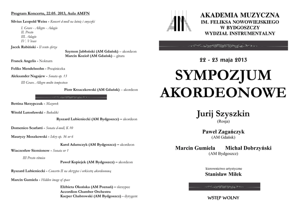 Program Koncertu, 22.05. 2013, Aula AMFN AKADEMIA MUZYCZNA Silvius Leopold Weiss - Koncert d-moll na lutnię i smyczki IM. FELIKSA NOWOWIEJSKIEGO W BYDGOSZCZY WYDZIAŁ INSTRUMENTALNY I. Grave - Allegro - Adagio II. Presto III. Adagio IV. Vivace Jacek Rabiński - Il vento sferza Szymon Jabłoński (AM Gdańsk) – akordeon Marcin Kozioł (AM Gdańsk) – gitara Franck Angelis - Nokturn Feliks Mendelssohn - Prząśniczka Aleksander Nagajew - Sonata op. 13 III Grave. Allegro molto tempestoso Piotr Krzaczkowski (AM Gdańsk) – akordeon 22 - 23 maja 2013 SYMPOZJUM AKORDEONOWE Bettina Skrzypczak - Mazurek Witold Lutosławski - Bukoliki Ryszard Lubieniecki (AM Bydgoszcz) – akordeon Domenico Scarlatti - Sonata d-moll, K 10 Maurycy Moszkowski - Iskry op. 36 nr 6 Karol Adamczyk (AM Bydgoszcz) – akordeon Wiaczesław Siemionow - Sonata nr 1 III Presto ritmico Jurij Szyszkin (Rosja) Paweł Zagańczyk (AM Gdańsk) Marcin Gumiela Michał Dobrzyński (AM Bydgoszcz) Paweł Kopiejek (AM Bydgoszcz) – akordeon Ryszard Lubieniecki - Concerto II na skrzypce i orkiestrę akordeonową kierownictwo artystyczne Stanisław Miłek Marcin Gumiela - Hidden image of space Elżbieta Okońska (AM Poznań) – skrzypce Accordion Chamber Orchestra Kacper Chabrowski (AM Bydgoszcz) - dyrygent WSTĘP WOLNY Program Sympozjum: Program Koncertu, 23.05. 2013, Aula AMFN środa, 22 maja 2013 roku Aula, ul. Słowackiego 7 Oleg Gorczakow Aplikacje polifoniczne 13.00 Tango jako inspiracja dla współczesnych kompozytorów Paweł Zagańczyk - Ragtime - Fuga Blues - Fuga Swing - Preludium Be-bop - Fuga Be-bop - Ballada - Fuga Jazz-rock - Finał 14.00 Inspiracje w muzyce współczesnej Marcina Gumieli i Michała Dobrzyńskiego na przykładzie wybranych utworów Marcin Gumiela, Michał Dobrzyński 17.00 Koncert Studentów AM Bydgoszcz /Gdańsk Galina Gontarenko Staroczermassk Suita Aleksander Głazunow Nokturn Felix Mendelssohn Bartholdy Pieśni bez słów: czwartek, 23 maja 2013 roku ul. Słowackiego 7 - Pieśń wiosenna - Prząśniczka 09.00, sala nr 208 Seminarium Interpretacji Jurij Szyszkin Joseph Hellmesberger Danse Diabolique 18.00, Aula Koncert Jurij Szyszkin George Gershwin Błękitna rapsodia wykonanie: Jurij Szyszkin - akordeon