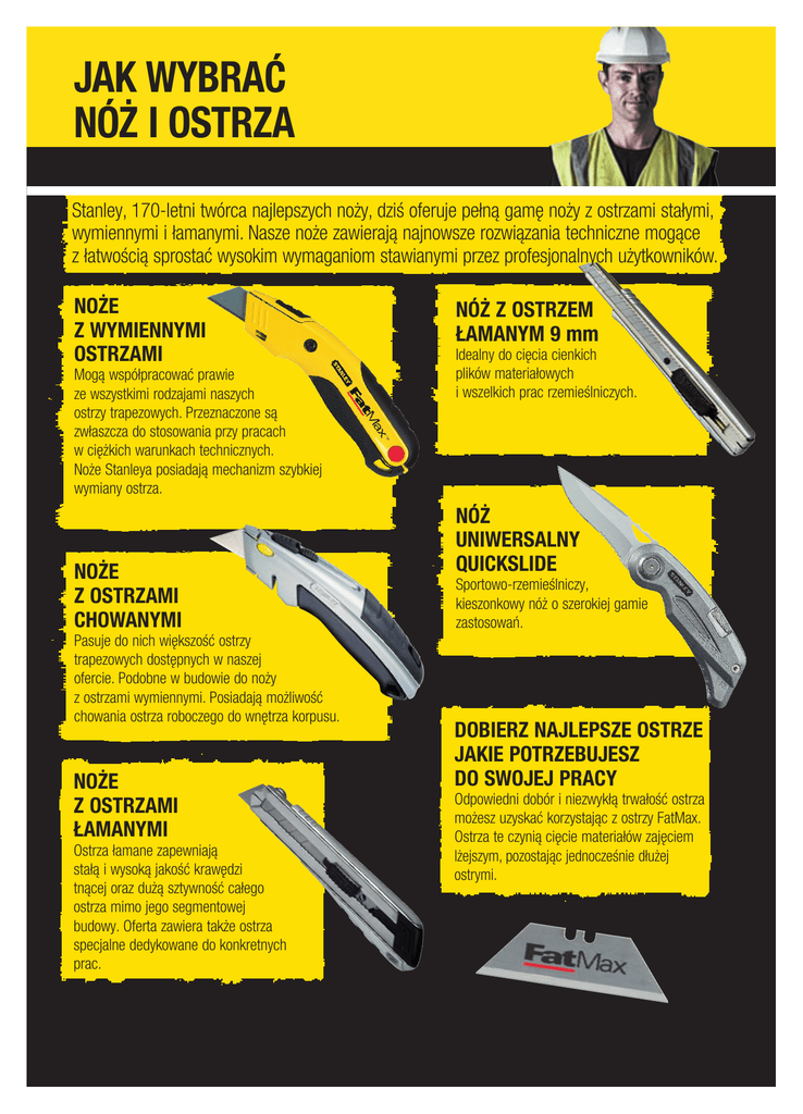 xxxxWYBRAĆ JAK NÓŻ I OSTRZA xxxx xxx Stanley, 170-letni twórca najlepszych noży, dziś oferuje pełną gamę noży z ostrzami stałymi, wymiennymi i łamanymi. Nasze noże zawierają najnowsze rozwiązania techniczne mogące z łatwością sprostać wysokim wymaganiom stawianymi przez profesjonalnych użytkowników. NOŻe Z WYmIeNNYmI OSTRZAmI Mogą współpracować prawie ze wszystkimi rodzajami naszych ostrzy trapezowych. Przeznaczone są zwłaszcza do stosowania przy pracach w ciężkich warunkach technicznych. Noże Stanleya posiadają mechanizm szybkiej wymiany ostrza. NOŻe Z OSTRZAmI chOWANYmI Pasuje do nich większość ostrzy trapezowych dostępnych w naszej ofercie. Podobne w budowie do noży z ostrzami wymiennymi. Posiadają możliwość chowania ostrza roboczego do wnętrza korpusu. NOŻe Z OSTRZAmI łAmANYmI Ostrza łamane zapewniają stałą i wysoką jakość krawędzi tnącej oraz dużą sztywność całego ostrza mimo jego segmentowej budowy. Oferta zawiera także ostrza specjalne dedykowane do konkretnych prac. NÓŻ Z OSTRZem łAmANYm 9 mm Idealny do cięcia cienkich plików materiałowych i wszelkich prac rzemieślniczych. NÓŻ uNIWeRSAlNY QuIcKSlIde Sportowo-rzemieślniczy, kieszonkowy nóż o szerokiej gamie zastosowań. dOBIeRZ NAJlepSZe OSTRZe JAKIe pOTRZeBuJeSZ dO SWOJeJ pRAcY Odpowiedni dobór i niezwykłą trwałość ostrza możesz uzyskać korzystając z ostrzy FatMax. Ostrza te czynią cięcie materiałów zajęciem lżejszym, pozostając jednocześnie dłużej ostrymi.