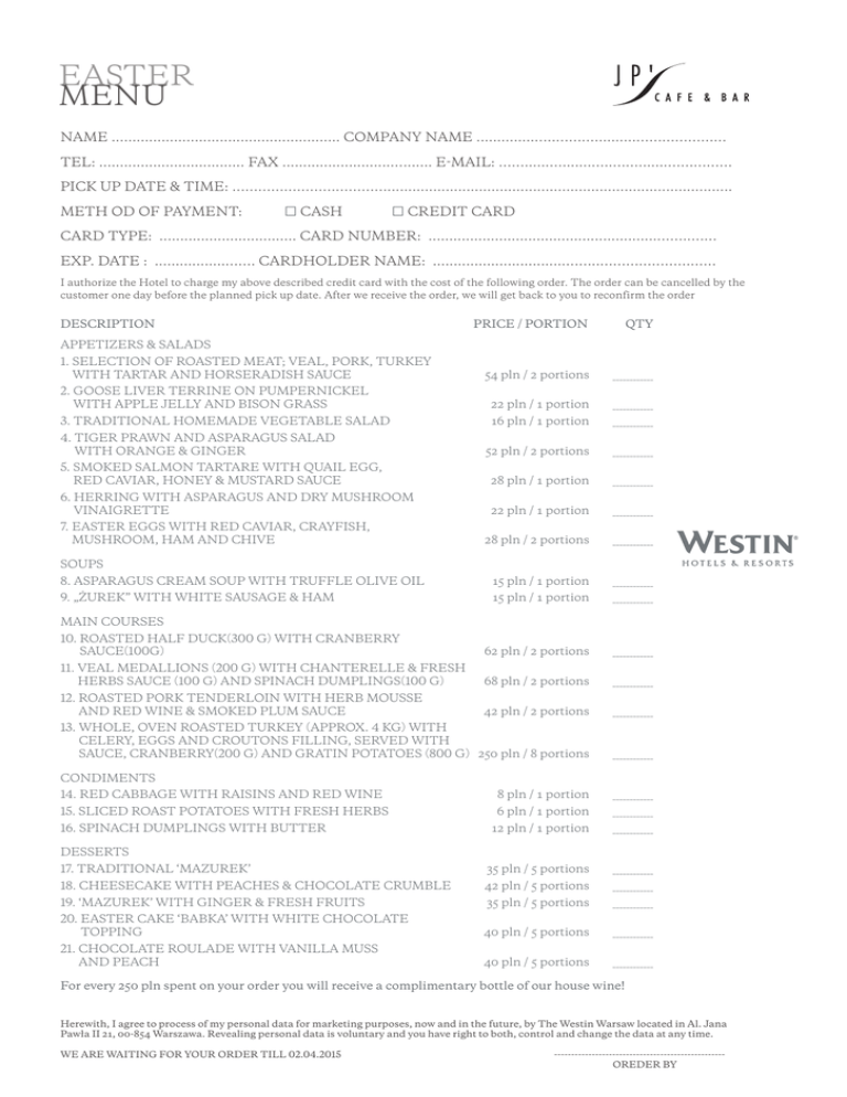 EASTER MENU NAME ....................................................... COMPANY NAME ..............…..………..........………………… TEL: ................................... FAX ...........................…...... E-MAIL: ……......….......…..…….......…………… PICK UP DATE & TIME: ………………………………................................................................................... METH OD OF PAYMENT: □ CASH □ CREDIT CARD CARD TYPE: ................................. CARD NUMBER: .......................................................……..…… EXP. DATE : .................……. CARDHOLDER NAME: ................................……..……………………… I authorize the Hotel to charge my above described credit card with the cost of the following order. The order can be cancelled by the customer one day before the planned pick up date. After we receive the order, we will get back to you to reconfirm the order DESCRIPTION PRICE / PORTION QTY 54 pln / 2 portions ____________ APPETIZERS & SALADS 1. S ELECTION OF ROASTED MEAT; VEAL, PORK, TURKEY WITH TARTAR AND HORSERADISH SAUCE 2. GOOSE LIVER TERRINE ON PUMPERNICKEL WITH APPLE JELLY AND BISON GRASS 22 pln / 1 portion ____________ 3. TRADITIONAL HOMEMADE VEGETABLE SALAD 16 pln / 1 portion ____________ 4. T IGER PRAWN AND ASPARAGUS SALAD WITH ORANGE & GINGER 52 pln / 2 portions ____________ 5. S MOKED SALMON TARTARE WITH QUAIL EGG, RED CAVIAR, HONEY & MUSTARD SAUCE 28 pln / 1 portion ____________ 6. HERRING WITH ASPARAGUS AND DRY MUSHROOM VINAIGRETTE 22 pln / 1 portion ____________ 28 pln / 2 portions ____________ 8. ASPARAGUS CREAM SOUP WITH TRUFFLE OLIVE OIL 15 pln / 1 portion ____________ 9. „ŻUREK” WITH WHITE SAUSAGE & HAM 15 pln / 1 portion ____________ 10. ROASTED HALF DUCK(300 G) WITH CRANBERRY SAUCE(100G) 62 pln / 2 portions ____________ 11. V EAL MEDALLIONS (200 G) WITH CHANTERELLE & FRESH HERBS SAUCE (100 G) AND SPINACH DUMPLINGS(100 G) 68 pln / 2 portions ____________ 12. R OASTED PORK TENDERLOIN WITH HERB MOUSSE AND RED WINE & SMOKED PLUM SAUCE 42 pln / 2 portions ____________ 13. W HOLE, OVEN ROASTED TURKEY (APPROX. 4 KG) WITH CELERY, EGGS AND CROUTONS FILLING, SERVED WITH SAUCE, CRANBERRY(200 G) AND GRATIN POTATOES (800 G) 250 pln / 8 portions ____________ 7. EASTER EGGS WITH RED CAVIAR, CRAYFISH, MUSHROOM, HAM AND CHIVE SOUPS MAIN COURSES CONDIMENTS 14. RED CABBAGE WITH RAISINS AND RED WINE 8 pln / 1 portion ____________ 15. SLICED ROAST POTATOES WITH FRESH HERBS 6 pln / 1 portion ____________ 12 pln / 1 portion ____________ 16. SPINACH DUMPLINGS WITH BUTTER DESSERTS 17. TRADITIONAL ‘MAZUREK’ 35 pln / 5 portions ____________ 18. CHEESECAKE WITH PEACHES & CHOCOLATE CRUMBLE 42 pln / 5 portions ____________ 19. ‘MAZUREK’ WITH GINGER & FRESH FRUITS 35 pln / 5 portions ____________ 20. EASTER CAKE ‘BABKA’ WITH WHITE CHOCOLATE TOPPING 40 pln / 5 portions ____________ 21. C HOCOLATE ROULADE WITH VANILLA MUSS AND PEACH 40 pln / 5 portions ____________ For every 250 pln spent on your order you will receive a complimentary bottle of our house wine! Herewith, I agree to process of my personal data for marketing purposes, now and in the future, by The Westin Warsaw located in Al. Jana Pawła II 21, 00-854 Warszawa. Revealing personal data is voluntary and you have right to both, control and change the data at any time. WE ARE WAITING FOR YOUR ORDER TILL 02.04.2015 -------------------------------------------------OREDER BY MENU WIELKANOCNE IMIĘ I NAZWISKO ....................................................... FIRMA ..............…..………..........………………… TEL: ................................... FAX ...........................…...... E-MAIL: ……......….......…..…….......…………… FORMA ZAPŁATY: □ GOTÓWKA □ KARTA KREDYTOWA ODBIÓR ZAMÓWIENIA – DATA I GODZINA …................................................................................... RODZAJ KARTY: ................................. NUMER KARTY .......................................................……..…… KARTA WAŻNA DO: .................. NAZWISKO WŁAŚCICIELA KARTY: ................................……..…… Wyrażam zgodę na obciążenie mojej karty kredytowej o podanym wyżej numerze zgodnie z zamówieniem. Klient może odwołać zamówienie w przeddzień jego realizacji. Po otrzymaniu formularza zadzwonimy do Państwa, aby potwierdzić zamówienie. NAZWA CENA / PORCJA ILOŚĆ PRZYSTAWKI I SAŁATKI 1. WYBÓR PIECZONYCH MIĘS: CIELĘCINA, WIEPRZOWINA, INDYK Z SOSAMI TATARSKIM I CHRZANOWYM 54 pln / 2 porcje ____________ 2. TERINA Z GĘSIEJ WĄTRÓBKI NA PUMPERNIKLU Z GALARETKĄ Z JABŁEK I TRAWY ŻUBROWEJ 22 pln / 1 porcja ____________ 3. T RADYCYJNA SAŁATKA WARZYWNA 16 pln / 1 porcja ____________ 4. SAŁATKA Z KREWETEK TYGRYSICH I SZPARAGÓW Z POMARAŃCZAMI I IMBIREM 52 pln / 2 porcje ____________ 5. T ATAR Z WĘDZONEGO ŁOSOSIA Z JAJKIEM PRZEPIÓRCZYM I CZERWONYM KAWIOREM Z SOSEM MIODOWO-MUSZTARDOWYM 28 pln / 1 porcja ____________ 6. ŚLEDŹ ZE SZPARAGAMI ORAZ SOSEM VINAIGRETTE Z SUSZONYCH GRZYBÓW 22 pln / 1 porcja ____________ 7. WIELKANOCNE JAJA FASZEROWANE CZERWONYM KAWIOREM, RAKAMI, GRZYBAMI, SZYNKĄ I SZCZYPIORKIEM 28 pln / 2 porcje ____________ ZUPY 8. KREM ZE SZPARAGÓW Z OLIWĄ TRUFLOWĄ 15 pln / 1 porcja ____________ 9. „ ŻUREK” Z BIAŁĄ KIEŁBASĄ I SZYNKĄ 15 pln / 1 porcja ____________ 10. PIECZONA KACZKA 1/2 SZT (300 G) Z SOSEM ŻURAWINOWYM (100 G) 62 pln / 2 porcje ____________ 11. MEDALIONY CIELĘCE (200 G) W SOSIE KURKOWYM ZE ŚWIEŻYMI ZIOŁAMI (100 G) ORAZ PIEROŻKI ZE SZPINAKIEM (100 G) 68 pln / 2 porcje ____________ 12. PIECZONA W MUSIE ZIOŁOWYM POLĘDWICZKA WIEPRZOWA (200 G) W SOSIE Z CZERWONEGO WINA I PODWĘDZANYCH ŚLIWEK (100 G) 42 pln / 2 porcje ____________ 13. P IECZONY W CAŁOŚCI INDYK NADZIEWANY FARSZEM Z SELERA, JAJ I KROTONÓW, PODANY Z: SOSEM PIECZENIOWYM, KONFITURĄ Z ŻURAWINY (200 G) I ZIEMNI