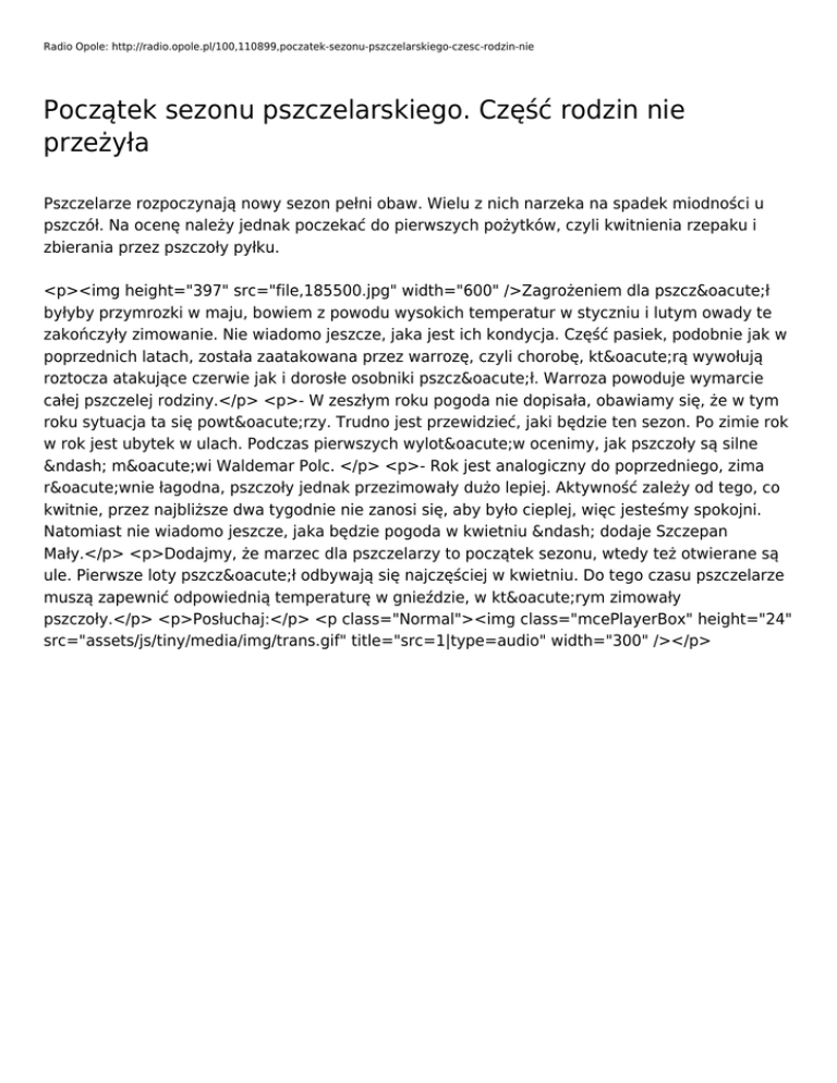 Radio Opole: http://radio.opole.pl/100,110899,poczatek-sezonu-pszczelarskiego-czesc-rodzin-nie Początek sezonu pszczelarskiego. Część rodzin nie przeżyła Pszczelarze rozpoczynają nowy sezon pełni obaw. Wielu z nich narzeka na spadek miodności u pszczół. Na ocenę należy jednak poczekać do pierwszych pożytków, czyli kwitnienia rzepaku i zbierania przez pszczoły pyłku. <p><img height="397" src="file,185500.jpg" width="600" />Zagrożeniem dla pszczół byłyby przymrozki w maju, bowiem z powodu wysokich temperatur w styczniu i lutym owady te zakończyły zimowanie. Nie wiadomo jeszcze, jaka jest ich kondycja. Część pasiek, podobnie jak w poprzednich latach, została zaatakowana przez warrozę, czyli chorobę, którą wywołują roztocza atakujące czerwie jak i dorosłe osobniki pszczół. Warroza powoduje wymarcie całej pszczelej rodziny.</p> <p>- W zeszłym roku pogoda nie dopisała, obawiamy się, że w tym roku sytuacja ta się powtórzy. Trudno jest przewidzieć, jaki będzie ten sezon. Po zimie rok w rok jest ubytek w ulach. Podczas pierwszych wylotów ocenimy, jak pszczoły są silne – mówi Waldemar Polc. </p> <p>- Rok jest analogiczny do poprzedniego, zima równie łagodna, pszczoły jednak przezimowały dużo lepiej. Aktywność zależy od tego, co kwitnie, przez najbliższe dwa tygodnie nie zanosi się, aby było cieplej, więc jesteśmy spokojni. Natomiast nie wiadomo jeszcze, jaka będzie pogoda w kwietniu – dodaje Szczepan Mały.</p> <p>Dodajmy, że marzec dla pszczelarzy to początek sezonu, wtedy też otwierane są ule. Pierwsze loty pszczół odbywają się najczęściej w kwietniu. Do tego czasu pszczelarze muszą zapewnić odpowiednią temperaturę w gnieździe, w którym zimowały pszczoły.</p> <p>Posłuchaj:</p> <p class="Normal"><img class="mcePlayerBox" height="24" src="assets/js/tiny/media/img/trans.gif" title="src=1|type=audio" width="300" /></p>