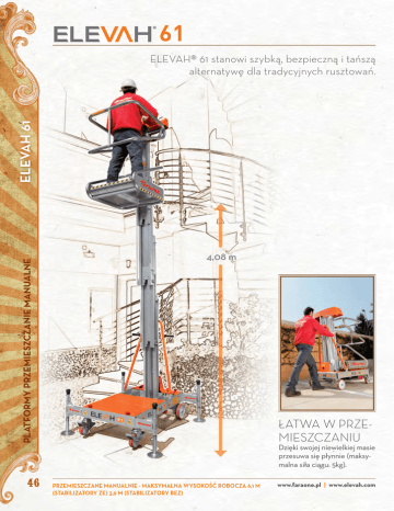 PLATFORMY PRZEMIESZCZANIE MANUALNE ELEVAH 61 ELEVAH® 61 stanowi szybką, bezpieczną i tańszą alternatywę dla tradycyjnych rusztowań. 46 4,08 m ŁATWA W PRZEMIESZCZANIU Dzięki swojej niewielkiej masie przesuwa się płynnie (maksymalna siła ciągu: 5kg). PRZEMIESZCZANE MANUALNIE - MAKSYMALNA WYSOKOŚĆ ROBOCZA 6,1 M (STABILIZATORY ZE) 3,9 M (STABILIZATORY BEZ) www.faraone.pl | www.elevah.com 237 kg 200 kg BEZPIECZEŃSTWO NA WYSOKOŚCI ELEVAH 61 Można ją używać bez stabilizatorów do wysokości roboczej 3,9 m PRZEZNACZONA DO KAŻDEJ SYTUACJI PLATFORMY PRZEMIESZCZANIE MANUALNE Urządzenie można wypoziomować ręcznie za pomocą stabilizatorów. 237 kg 1,2 m Zgodne z normą EN280, certyfikat CE wydany przez TÜV, zatwierdzone do użytku wewnętrznego w środowisku bezwietrznym. 47 Dane techniczne ELEVAH 61 Udźwig 200 kg Operatorzy 1 Wykorzystanie wewnętrzne OPIS Stabilizatory Stabilizatory bez ze kg. 200 A Wysokość złożonej maszyny 1730 mm b Min. odległość kosza od podłoża 400 mm c Max odległość kosza od podłoża 1895 mm 4085 mm d e f g h i j k Wymiary podstawy 1187 mm 1297 mm 770 mm 1252 mm Wewnętrzne wymiary kosza Max odległość kosza od ściany Wymiary zasobnika na przedmioty MAX KG 200 638 mm 620 mm 0 mm 275 mm 0 mm 30 mm 620 mm MAX KG 200 230 mm Pojemność zasobnika 20 kg Waga maszyny 219 kg Źródło zasilania 24 V 2 baterie AGM 12 V 45 Ah Ładowarka 110V - 220V Wymiary kół pędnych Ø 220 x 50 Wymiary kół obrotowych Ø 150 x 45 Max. prędkość podnoszenia 0,16 m/s Max. prędkość opuszczania 0,21 m/s 237 kg DANE TECHNICZNE Siła konieczna do wprawienia w ruch 7 kg 52 Siła konieczna do kontynuowania ruchu l 3 kg Max. nacisk na koło przy pełnym obciążeniu* 1,47 kN - Max. nacisk na Stabilizatory przy pełnym obciążeniu* - 1,53 kN nacisk przy uwzględnieniu, że ciężar podnośnika plus * Maksymalny maksymalne o bciążenie kosza są rozłożone całkowicie po jednej stronie urządzenia (obciążenie całkowicie asymetryczne) Zgodne z normą EN280, certyfikat CE wydany przez TÜV, zatwierdzone do użytku wewnętrznego w środowisku bezwietrznym. www.faraone.pl | www.elevah.com