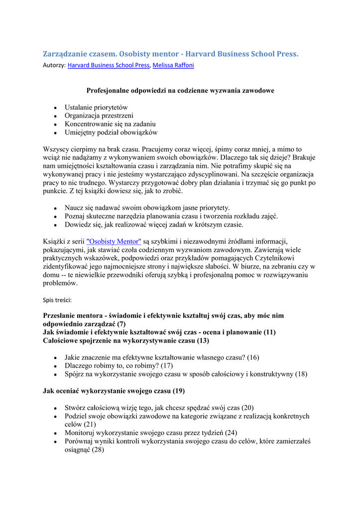 Zarządzanie czasem. Osobisty mentor - Harvard Business School Press. Autorzy: Harvard Business School Press, Melissa Raffoni Profesjonalne odpowiedzi na codzienne wyzwania zawodowe Ustalanie priorytetów Organizacja przestrzeni Koncentrowanie się na zadaniu Umiejętny podział obowiązków Wszyscy cierpimy na brak czasu. Pracujemy coraz więcej, śpimy coraz mniej, a mimo to wciąż nie nadążamy z wykonywaniem swoich obowiązków. Dlaczego tak się dzieje? Brakuje nam umiejętności kształtowania czasu i zarządzania nim. Nie potrafimy skupić się na wykonywanej pracy i nie jesteśmy wystarczająco zdyscyplinowani. Na szczęście organizacja pracy to nic trudnego. Wystarczy przygotować dobry plan działania i trzymać się go punkt po punkcie. Z tej książki dowiesz się, jak to zrobić. Naucz się nadawać swoim obowiązkom jasne priorytety. Poznaj skuteczne narzędzia planowania czasu i tworzenia rozkładu zajęć. Dowiedz się, jak realizować więcej zadań w krótszym czasie. Książki z serii "Osobisty Mentor" są szybkimi i niezawodnymi źródłami informacji, pokazującymi, jak stawiać czoła codziennym wyzwaniom zawodowym. Zawierają wiele praktycznych wskazówek, podpowiedzi oraz przykładów pomagających Czytelnikowi zidentyfikować jego najmocniejsze strony i największe słabości. W biurze, na zebraniu czy w domu -- te niewielkie przewodniki oferują szybką i profesjonalną pomoc w rozwiązywaniu problemów. Spis treści: Przesłanie mentora - świadomie i efektywnie kształtuj swój czas, aby móc nim odpowiednio zarządzać (7) Jak świadomie i efektywnie kształtować swój czas - ocena i planowanie (11) Całościowe spojrzenie na wykorzystywanie czasu (13) Jakie znaczenie ma efektywne kształtowanie własnego czasu? (16) Dlaczego robimy to, co robimy? (17) Spójrz na wykorzystanie swojego czasu w sposób całościowy i konstruktywny (18) Jak oceniać wykorzystanie swojego czasu (19) Stwórz całościową wizję tego, jak chcesz spędzać swój czas (20) Podziel swoje obowiązki zawodowe na kategorie związane z realizacją konkretnych celów (21) Monitoruj wykorzystanie swojego czasu przez tydzień (24) Porównaj wyniki kontroli wykorzystania swojego czasu do celów, które zamierzałeś osiągnąć (28) Jak stworzyć efektywny plan działania (31) Porównaj rzeczywistą alokację czasu pracy z docelową alokacją czasu pracy (35) Jak zarządzać czasem - wprowadź w życie swój plan (37) Wyznaczanie konkretnych ram czasowych (39) Wyznaczaj realne i konkretne ramy czasowe (40) Jak ustalać konkretne ramy czasowe (41) Jak zarządzać swoim czasem (51) Monitoruj i oceniaj rozkład swoich zajęć (52) Jak zminimalizować czas poświęcany na zadania, które nie są tak istotne? Dziel się obowiązkami! (55) Dzieląc się obowiązkami, bądź kreatywny (57) Deleguj zadania tak, by rezultaty były widoczne (57) Jak pokonywać trudności (61) Rozpoznaj typowe trudności w zarządzaniu czasem (62) Stawiaj czoła niesprzyjającej kulturze firmy i trudnym środowiskom pracy (63) Efektywnie kształtuj swój czas w kulturze nastawionej na wykorzystanie każdej chwili (69) Radź sobie z chaotycznie zorganizowanymi przestrzeniami do pracy (72) Staw czoła problemowi nieuzasadnionego odkładania obowiązków na później (78) Unikaj źle zaplanowanych spotkań i niepotrzebnych podróży (78) Daj sobie odpowiednią ilość czasu, by uniknąć lub przezwyciężyć trudności (81) Jak rozwinąć odpowiednie nawyki w zarządzaniu czasem (85) Zarządzaj informacjami (86) Wskazówki i narzędzia (93) Często zadawane pytania (95) Narzędzia do zarządzania czasem (101) Sprawdź się (107) Rozwiązanie testu (111) Do dalszego czytania (115) Artykuły (116) Książki (120)