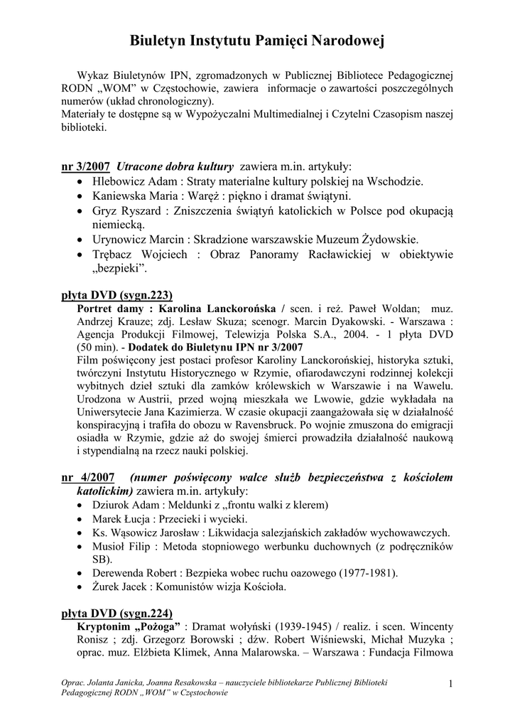 Biuletyn Instytutu Pamięci Narodowej Wykaz Biuletynów IPN, zgromadzonych w Publicznej Bibliotece Pedagogicznej RODN „WOM” w Częstochowie, zawiera informacje o zawartości poszczególnych numerów (układ chronologiczny). Materiały te dostępne są w Wypożyczalni Multimedialnej i Czytelni Czasopism naszej biblioteki. nr 3/2007 Utracone dobra kultury zawiera m.in. artykuły: Hlebowicz Adam : Straty materialne kultury polskiej na Wschodzie. Kaniewska Maria : Waręż : piękno i dramat świątyni. Gryz Ryszard : Zniszczenia świątyń katolickich w Polsce pod okupacją niemiecką. Urynowicz Marcin : Skradzione warszawskie Muzeum Żydowskie. Trębacz Wojciech : Obraz Panoramy Racławickiej w obiektywie „bezpieki”. płyta DVD (sygn.223) Portret damy : Karolina Lanckorońska / scen. i reż. Paweł Woldan; muz. Andrzej Krauze; zdj. Lesław Skuza; scenogr. Marcin Dyakowski. - Warszawa : Agencja Produkcji Filmowej, Telewizja Polska S.A., 2004. - 1 płyta DVD (50 min). - Dodatek do Biuletynu IPN nr 3/2007 Film poświęcony jest postaci profesor Karoliny Lanckorońskiej, historyka sztuki, twórczyni Instytutu Historycznego w Rzymie, ofiarodawczyni rodzinnej kolekcji wybitnych dzieł sztuki dla zamków królewskich w Warszawie i na Wawelu. Urodzona w Austrii, przed wojną mieszkała we Lwowie, gdzie wykładała na Uniwersytecie Jana Kazimierza. W czasie okupacji zaangażowała się w działalność konspiracyjną i trafiła do obozu w Ravensbruck. Po wojnie zmuszona do emigracji osiadła w Rzymie, gdzie aż do swojej śmierci prowadziła działalność naukową i stypendialną na rzecz nauki polskiej. nr 4/2007 (numer poświęcony walce służb bezpieczeństwa z kościołem katolickim) zawiera m.in. artykuły: Dziurok Adam : Meldunki z „frontu walki z klerem) Marek Łucja : Przecieki i wycieki. Ks. Wąsowicz Jarosław : Likwidacja salezjańskich zakładów wychowawczych. Musioł Filip : Metoda stopniowego werbunku duchownych (z podręczników SB). Derewenda Robert : Bezpieka wobec ruchu oazowego (1977-1981). Żurek Jacek : Komunistów wizja Kościoła. płyta DVD (sygn.224) Kryptonim „Pożoga” : Dramat wołyński (1939-1945) / realiz. i scen. Wincenty Ronisz ; zdj. Grzegorz Borowski ; dźw. Robert Wiśniewski, Michał Muzyka ; oprac. muz. Elżbieta Klimek, Anna Malarowska. – Warszawa : Fundacja Filmowa Oprac. Jolanta Janicka, Joanna Resakowska – nauczyciele bibliotekarze Publicznej Biblioteki Pedagogicznej RODN „WOM” w Częstochowie 1 Armii Krajowej, Agencja Produkcji Filmowej, Telewizja Polska, 1998. - 1 płyta DVD (87 min). - Dodatek do Biuletynu IPN Nr 4/2007 Film przedstawia złożone stosunki polsko-ukraińskie w latach międzywojennych i w efekcie dramat polskiej ludności Wołynia w okresie II wojny światowej. Mówi o eksterminacji i prześladowaniach dokonywanych przez okupantów sowieckich, niemieckich i nacjonalistów ukraińskich, organizacji polskiej samoobrony i walkach 27 Dywizji piechoty Armii Krajowej – najliczniejszej jednostki zbrojnej polskiego Państwa Podziemnego. nr 5-6/2007 Czarne Juwenalia – powstanie SKS zawiera m.in. artykuły: Waligóra Grzegorz : KOR – geneza. Szarek Jarosław : Nim powstał SKS. Kamiński Łukasz : Solidarność Walcząca. Ruzikowski Tadeusz : Zima wasza, wiosna nasza! Handke Waldemar : Dwie teczki, dwa życiorysy – jedno życie esbeka… Hera Janina : Narodziny cenzury. płyta DVD (sygn.225) Polskie Państwo Podziemne (1939-1945) / scen. i reż. Andrzej Sapija ; zdj. Henryk Janas, Andrzej Sapija ; oprac. muz. Joanna Badełek ; montaż Jan Mikołaj Mironowicz. - Film dokumentalny. - Warszawa : Fundacja Filmowa Armii Krajowej, Agencja Produkcji Filmowej, - 1 płyta DVD (62 min). - Dodatek do Biuletynu IPN 2007 nr 5/6. „Polskie Państwo Podziemne” - w odróżnieniu od innych produkcji filmowych poświęconych okresowi II wojny światowej - skupia się nie tylko na działaniach wojennych, ale ma ambicję objęcia i opisania całości unikatowego w skali europejskiej zjawiska tamtego okresu, jakim w rzeczywistości okupowanej Polski lat 1939-45 były struktury cywilne, administracyjne, polityczne tworzące Polskie Państwo Podziemne (PPP). Mowa jest, więc w tym filmie m. in. o strukturach administracyjno-politycznych Delegatury Rządu na Kraj, o tajnym nauczaniu, tajnej prasie i wydawnictwach, działalności Rady Pomocy Żydom „Żegota”, podziemnym wymiarze sprawiedliwości i programie „działań przyszłościowych”. O fenomenie Polskiego Państwa Podziemnego mówią świadkowie, uczestnicy tamtych wydarzeń, m. in. Maria Dmochowska, Maria Staszewska, Krystyna Grostal, Kazimierz Łodziński, Józef Garliński i Władysław Bartoszewski. W dyskusji uczestniczą także historycy zarówno polscy, jak i zagraniczni: Andrzej Ajnenkiel, Janusz Tazbir, Norman Davies (Wielka Brytania) i B. Martin (Niemcy). nr 8-9/2007 Ruch narodowy zawiera m.in. artykuły Muszyński Wojciech : Z dziejów Stronnictwa Narodowego (1928-1947). Sierchuła Rafał : Narodowe Siły Zbrojne (1942-1946). Żaryn Jan: Stronnictwo Narodowe we Francji (1939-1955). Klecel Marek : Jan Dobraczyński – wielki pisarz, wielkie uwikłanie. Życiński Zdzisław : O Pomniku Powstania Warszawskiego. Oprac. Jolanta Janicka, Joanna Resakowska – nauczyciele bibliotekarze Publicznej Biblioteki Pedagogicznej RODN „WOM” w Częstochowie 2 płyta DVD (sygn.232) Roman Dmowski (1864-1939) / reż. Marian Kubera ; scen. Krzysztof Kawęcki, Marian Kubera ; muz. Wacław Pilkowski ; zdj. Andrzej Wójcik. - Warszawa : Telewizja Polska, 1995.- 1 dysk optyczny DVD (49 min) : dżw., cz.-b., kolor. ; 12 cm. - Dodatek do Biuletynu IPN nr 8-9/2007 Film dokumentujący zasługi Romana Dmowskiego w odbudowę państwa polskiego oraz dyskusja studyjna. Zawiera : program telewizyjny „Ojciec założyciel II Rzeczypospolitej” z cyklu Kontrowersje / scen. Piotr Czerwiński ; prowadzący Rafał Ziemkiewicz nr 10-11/2007 Polskie Siły Zbrojne na Zachodzie zawiera m.in. artykuły: