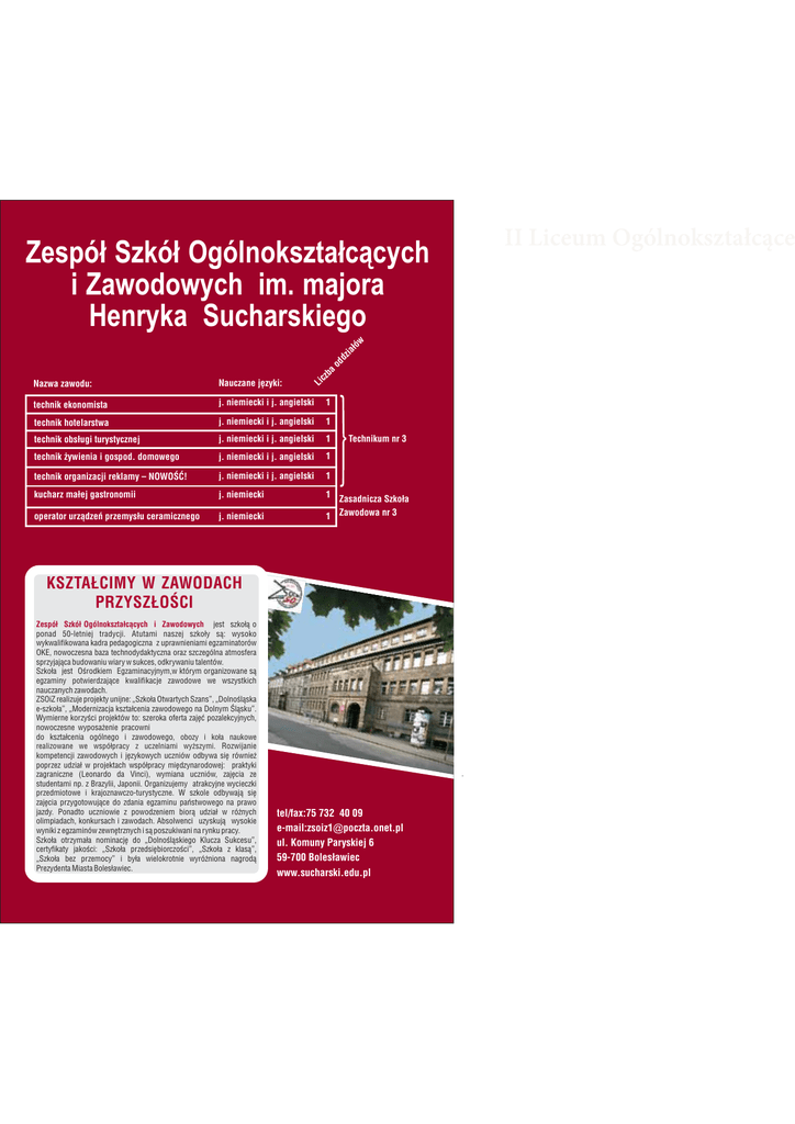 Li cz ba od dz ia łó w Zespół Szkół Ogólnokształcących i Zawodowych im. majora Henryka Sucharskiego Nazwa zawodu: Nauczane języki: technik ekonomista j. niemiecki i j. angielski technik hotelarstwa j. niemiecki i j. angielski 1 technik obsługi turystycznej j. niemiecki i j. angielski 1 technik żywienia i gospod. domowego j. niemiecki i j. angielski 1 technik organizacji reklamy – NOWOŚĆ! j. niemiecki i j. angielski 1 kucharz małej gastronomii j. niemiecki operator urządzeń przemysłu ceramicznego j. niemiecki 1 Zasadnicza Szkoła 1 Zawodowa nr 3 1 Technikum nr 3 KSZTAŁCIMY W ZAWODACH PRZYSZŁOŚCI Zespół Szkół Ogólnokształcących i Zawodowych jest szkołą o ponad 50-letniej tradycji. Atutami naszej szkoły są: wysoko wykwalifikowana kadra pedagogiczna z uprawnieniami egzaminatorów OKE, nowoczesna baza technodydaktyczna oraz szczególna atmosfera sprzyjająca budowaniu wiary w sukces, odkrywaniu talentów. Szkoła jest Ośrodkiem Egzaminacyjnym,w którym organizowane są egzaminy potwierdzające kwalifikacje zawodowe we wszystkich nauczanych zawodach. ZSOiZ realizuje projekty unijne: „Szkoła Otwartych Szans”, „Dolnośląska e-szkoła”, „Modernizacja kształcenia zawodowego na Dolnym Śląsku”. Wymierne korzyści projektów to: szeroka oferta zajęć pozalekcyjnych, nowoczesne wyposażenie pracowni do kształcenia ogólnego i zawodowego, obozy i koła naukowe realizowane we współpracy z uczelniami wyższymi. Rozwijanie kompetencji zawodowych i językowych uczniów odbywa się również poprzez udział w projektach współpracy międzynarodowej: praktyki zagraniczne (Leonardo da Vinci), wymiana uczniów, zajęcia ze studentami np. z Brazylii, Japonii. Organizujemy atrakcyjne wycieczki przedmiotowe i krajoznawczo-turystyczne. W szkole odbywają się zajęcia przygotowujące do zdania egzaminu państwowego na prawo jazdy. Ponadto uczniowie z powodzeniem biorą udział w różnych olimpiadach, konkursach i zawodach. Absolwenci uzyskują wysokie wyniki z egzaminów zewnętrznych i są poszukiwani na rynku pracy. Szkoła otrzymała nominację do „Dolnośląskiego Klucza Sukcesu”, certyfikaty jakości: „Szkoła przedsiębiorczości”, „Szkoła z klasą”, „Szkoła bez przemocy” i była wielokrotnie wyróżniona nagrodą Prezydenta Miasta Bolesławiec. tel/fax:75 732 40 09 e-mail:[email protected] ul. Komuny Paryskiej 6 59-700 Bolesławiec www.sucharski.edu.pl II Liceum Ogólnokształcące