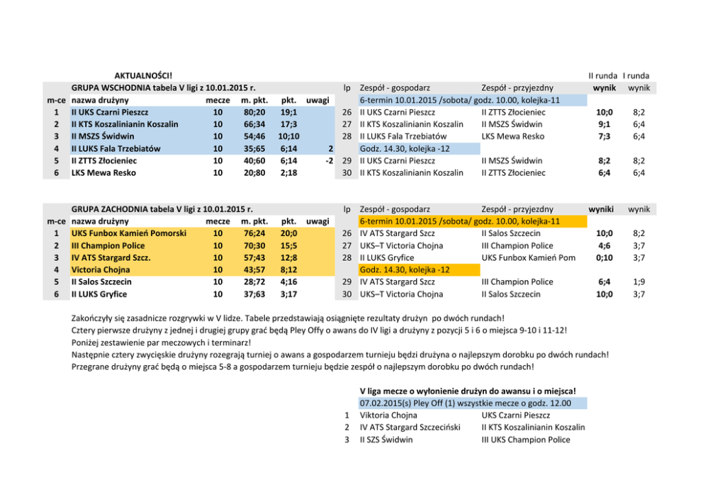 AKTUALNOŚCI! GRUPA WSCHODNIA tabela V ligi z 10.01.2015 r. m-ce nazwa drużyny mecze m. pkt. 1 II UKS Czarni Pieszcz 10 80;20 2 II KTS Koszalinianin Koszalin 10 66;34 3 II MSZS Świdwin 10 54;46 4 II LUKS Fala Trzebiatów 10 35;65 5 II ZTTS Złocieniec 10 40;60 6 LKS Mewa Resko 10 20;80 GRUPA ZACHODNIA tabela V ligi z 10.01.2015 r. m-ce nazwa drużyny mecze m. pkt. 1 UKS Funbox Kamień Pomorski 10 76;24 2 III Champion Police 10 70;30 3 IV ATS Stargard Szcz. 10 57;43 4 Victoria Chojna 10 43;57 5 II Salos Szczecin 10 28;72 6 II LUKS Gryfice 10 37;63 lp pkt. uwagi 19;1 17;3 10;10 6;14 2 6;14 -2 2;18 26 27 28 29 30 lp pkt. uwagi 20;0 15;5 12;8 8;12 4;16 3;17 26 27 28 29 30 Zespół - gospodarz Zespół - przyjezdny 6-termin 10.01.2015 /sobota/ godz. 10.00, kolejka-11 II UKS Czarni Pieszcz II ZTTS Złocieniec II KTS Koszalinianin Koszalin II MSZS Świdwin II LUKS Fala Trzebiatów LKS Mewa Resko Godz. 14.30, kolejka -12 II UKS Czarni Pieszcz II MSZS Świdwin II KTS Koszalinianin Koszalin II ZTTS Złocieniec Zespół - gospodarz Zespół - przyjezdny 6-termin 10.01.2015 /sobota/ godz. 10.00, kolejka-11 IV ATS Stargard Szcz II Salos Szczecin UKS–T Victoria Chojna III Champion Police II LUKS Gryfice UKS Funbox Kamień Pom Godz. 14.30, kolejka -12 IV ATS Stargard Szcz III Champion Police UKS–T Victoria Chojna II Salos Szczecin II runda I runda wynik wynik 10;0 9;1 7;3 8;2 6;4 6;4 8;2 6;4 8;2 6;4 wyniki 10;0 4;6 0;10 8;2 3;7 3;7 6;4 10;0 1;9 3;7 Zakończyły się zasadnicze rozgrywki w V lidze. Tabele przedstawiają osiągnięte rezultaty drużyn po dwóch rundach! Cztery pierwsze drużyny z jednej i drugiej grupy grać będą Pley Offy o awans do IV ligi a drużyny z pozycji 5 i 6 o miejsca 9-10 i 11-12! Poniżej zestawienie par meczowych i terminarz! Następnie cztery zwycięskie drużyny rozegrają turniej o awans a gospodarzem turnieju będzi drużyna o najlepszym dorobku po dwóch rundach! Przegrane drużyny grać będą o miejsca 5-8 a gospodarzem turnieju będzie zespół o najlepszym dorobku po dwóch rundach! 1 2 3 V liga mecze o wyłonienie drużyn do awansu i o miejsca! 07.02.2015(s) Pley Off (1) wszystkie mecze o godz. 12.00 Viktoria Chojna UKS Czarni Pieszcz IV ATS Stargard Szczeciński II KTS Koszalinianin Koszalin II SZS Świdwin III UKS Champion Police wynik 4 II LUKS Fala Trzebiatów 5 07.02.2015(s) Pley Off (1) wszystkie mecze o godz. 12.00 Mecze o miejsca od 9 i 10 II Salos Szczecin II ZTTS Złocieniec Mecze o miejsca 11 i 12 LKS Mewa Resko II LUKS Gryfice 6 UKS Funbox Kamień Pomorski Mecze rewanżowe 14.02.2015(s) godz. 12.00 Pley Off(2) Opracowanie Piotr Bochnacki Koszalin 12.01.2015 r. Uwagi regulaminowe! Gospodarzem pierwszego meczu będzie drużyna która ma mniejszy dorobek w parze po dwóch rundach. W meczach tych obowiązuje ranking! Zwycięskie drużyny z poszczególnych par rozegrają turniej o miejsca 1-4 i awans do IV ligi a cztery przegrane drużyny rozegrają turniej o miejsca 5-8. Turnieje te będą rozegrane 28.03.2015(s)-będzie komunikat organizacyjny ZPZTS. wygrane drużyny z pozycji 5 i 11 kończą rozgrywki zajmując miejsce 9 i 10 w V lidze! wygrane drużyny z pozycji 6 i 12 kończą rozgrywki zajmując miejsce 11 i 12 w V lidze! ZPZTS prowadzący rozgrywki Piotr Bochnacki Koszalin 11.12.2014 r. Otrzymują: Wszystkie kluby biorące udział w rozgrywkach V ligi