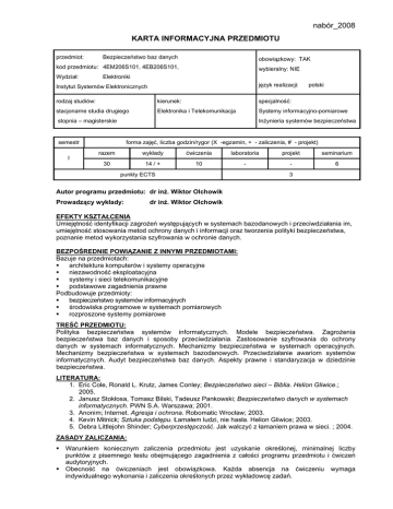 nabór_2008 KARTA INFORMACYJNA PRZEDMIOTU przedmiot: Bezpieczeństwo baz danych obowiązkowy: TAK kod przedmiotu: 4EM206S101, 4EB206S101, Wydział: wybieralny: NIE Elektroniki język realizacji: Instytut Systemów Elektronicznych polski rodzaj studiów: kierunek: specjalność: stacjonarne studia drugiego Elektronika i Telekomunikacja Systemy informacyjno-pomiarowe stopnia – magisterskie Inżynieria systemów bezpieczeństwa semestr I forma zajęć, liczba godzin/rygor (X -egzamin, + - zaliczenia, # - projekt) razem wykłady ćwiczenia laboratoria projekt seminarium 30 14 / + 10 - - 6 punkty ECTS 3 Autor programu przedmiotu: dr inż. Wiktor Olchowik Prowadzący wykłady: dr inż. Wiktor Olchowik EFEKTY KSZTAŁCENIA Umiejętność identyfikacji zagrożeń występujących w systemach bazodanowych i przeciwdziałania im, umiejętność stosowania metod ochrony danych i informacji oraz tworzenia polityki bezpieczeństwa, poznanie metod wykorzystania szyfrowania w ochronie danych. BEZPOŚREDNIE POWIĄZANIE Z INNYMI PRZEDMIOTAMI: Bazuje na przedmiotach: architektura komputerów i systemy operacyjne niezawodność eksploatacyjna systemy i sieci telekomunikacyjne podstawowe zagadnienia prawne Podbudowuje przedmioty: bezpieczeństwo systemów informacyjnych środowiska programowe w systemach pomiarowych rozproszone systemy pomiarowe TREŚĆ PRZEDMIOTU: Polityka bezpieczeństwa systemów informatycznych. Modele bezpieczeństwa. Zagrożenia bezpieczeństwa baz danych i sposoby przeciwdziałania. Zastosowanie szyfrowania do ochrony danych w systemach informatycznych. Mechanizmy bezpieczeństwa w systemach operacyjnych. Mechanizmy bezpieczeństwa w systemach bazodanowych. Przeciwdziałanie awariom systemów informatycznych. Audyt bezpieczeństwa baz danych. Aspekty prawne i standaryzacja w dziedzinie bezpieczeństwa. LITERATURA: 1. Eric Cole, Ronald L. Krutz, James Conley; Bezpieczeństwo sieci – Biblia. Helion Gliwice.; 2005. 2. Janusz Stokłosa, Tomasz Bilski, Tadeusz Pankowski; Bezpieczeństwo danych w systemach informatycznych. PWN S.A. Warszawa; 2001. 3. Anonim; Internet. Agresja i ochrona. Robomatic Wrocław; 2003. 4. Kevin Mitnick; Sztuka podstępu. Łamałem ludzi, nie hasła. Helion Gliwice; 2003. 5. Debra Littlejohn Shinder; Cyberprzestępczość. Jak walczyć z łamaniem prawa w sieci. ; 2004. ZASADY ZALICZANIA: Warunkiem koniecznym zaliczenia przedmiotu jest uzyskanie określonej, minimalnej liczby punktów z pisemnego testu obejmującego zagadnienia z całości programu przedmiotu i ćwiczeń audytoryjnych. Obecność na ćwiczeniach jest obowiązkowa. Każda absencja na ćwiczeniu wymaga indywidualnego wykonania i zaliczenia określonych przez wykładowcę zadań.