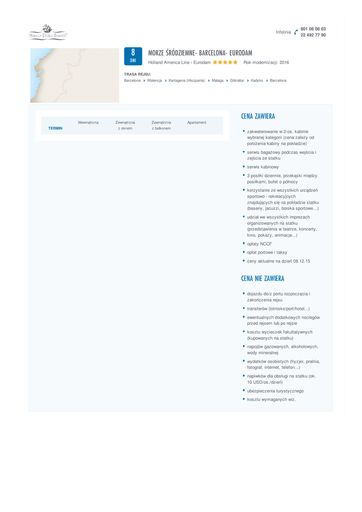 Infolinia 8 MORZE ŚRÓDZIEMNE- BARCELONA- EURODAM DNI Holland America Line - Eurodam 801 08 08 03 22 492 77 90 | Rok modernizacji: 2016 TRASA REJSU: Barcelona Wewnętrzna TERMIN Walencja Kartagena (Hiszpania) Zewnętrzna Zewnętrzna z oknem z balkonem Apartament Malaga Gibraltar Kadyks Barcelona CENA ZAWIERA zakwaterowanie w 2-os. kabinie wybranej kategorii (cena zależy od położenia kabiny na pokładzie) serwis bagażowy podczas wejścia i zejścia ze statku serwis kabinowy 3 posiłki dziennie, przekąski między posiłkami, bufet o północy korzystanie ze wszystkich urządzeń sportowo - rekreacyjnych znajdujących się na pokładzie statku (baseny, jacuzzi, boiska sportowe…) udział we wszystkich imprezach organizowanych na statku (przedstawienia w teatrze, koncerty, kino, pokazy, animacje...) opłaty NCCF opłat portowe i taksy ceny aktualne na dzień 08.12.15 CENA NIE ZAWIERA dojazdu do/z portu rozpoczęcia i zakończenia rejsu transferów (lotnisko/port/hotel...) ewentualnych dodatkowych noclegów przed rejsem lub po rejsie kosztu wycieczek fakultatywnych (kupowanych na statku) napojów gazowanych, alkoholowych, wody mineralnej wydatków osobistych (fryzjer, pralnia, fotograf, internet, telefon...) napiwków dla obsługi na statku (ok. 10 USD/os./dzień) ubezpieczenia turystycznego kosztu wymaganych wiz.
