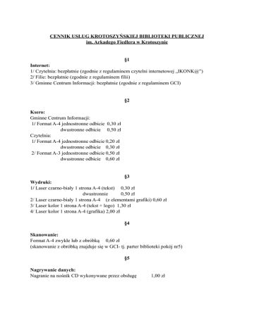 CENNIK USŁUG KROTOSZYŃSKIEJ BIBLIOTEKI PUBLICZNEJ im. Arkadego Fiedlera w Krotoszynie §1 Internet: 1/ Czytelnia: bezpłatnie (zgodnie z regulaminem czytelni internetowej „IKONK@”) 2/ Filie: bezpłatnie (zgodnie z regulaminem filii) 3/ Gminne Centrum Informacji: bezpłatnie (zgodnie z regulaminem GCI) §2 Ksero: Gminne Centrum Informacji: 1/ Format A-4 jednostronne odbicie 0,30 zł dwustronne odbicie 0,50 zł Czytelnia: 1/ Format A-4 jednostronne odbicie 0,20 zł dwustronne odbicie 0,30 zł 2/ Format A-3 jednostronne odbicie 0,50 zł dwustronne odbicie 0,60 zł §3 Wydruki: 1/ Laser czarno-biały 1 strona A-4 (tekst) 0,30 zł dwustronnie 0,50 zł 2/ Laser czarno-biały 1 strona A-4 (z elementami grafiki) 0,60 zł 3/ Laser kolor 1 strona A-4 (tekst + logo) 1,30 zł 4/ Laser kolor 1 strona A-4 (grafika) 2,00 zł §4 Skanowanie: Format A-4 zwykłe lub z obróbką 0,60 zł (skanowanie z obróbką znajduje się w GCI- tj. parter biblioteki pokój nr5) §5 Nagrywanie danych: Nagranie na nośnik CD wykonywane przez obsługę 1,00 zł §6 Przepisywanie danych: Jedna strona formatu A-4 2,00 zł (przepisywanie odbywa się w GCI -parter biblioteki pokój nr 5 §7 Faks: 1/ lokalny: - połączenie: 2,50 zł (w tym jedna strona danych) - każda następna strona: 0,50 zł 2/ międzymiastowy: - połączenie; 3,50 zł (w tym jedna strona danych) - każda nastopna strona: 0,50 zł 3/ międzynarodowy: - połączenie; 8,00 zł (w tym jedna strona danych) - każda następna strona: 0,50 zł Krotoszyn, dnia 6 października 2010r.