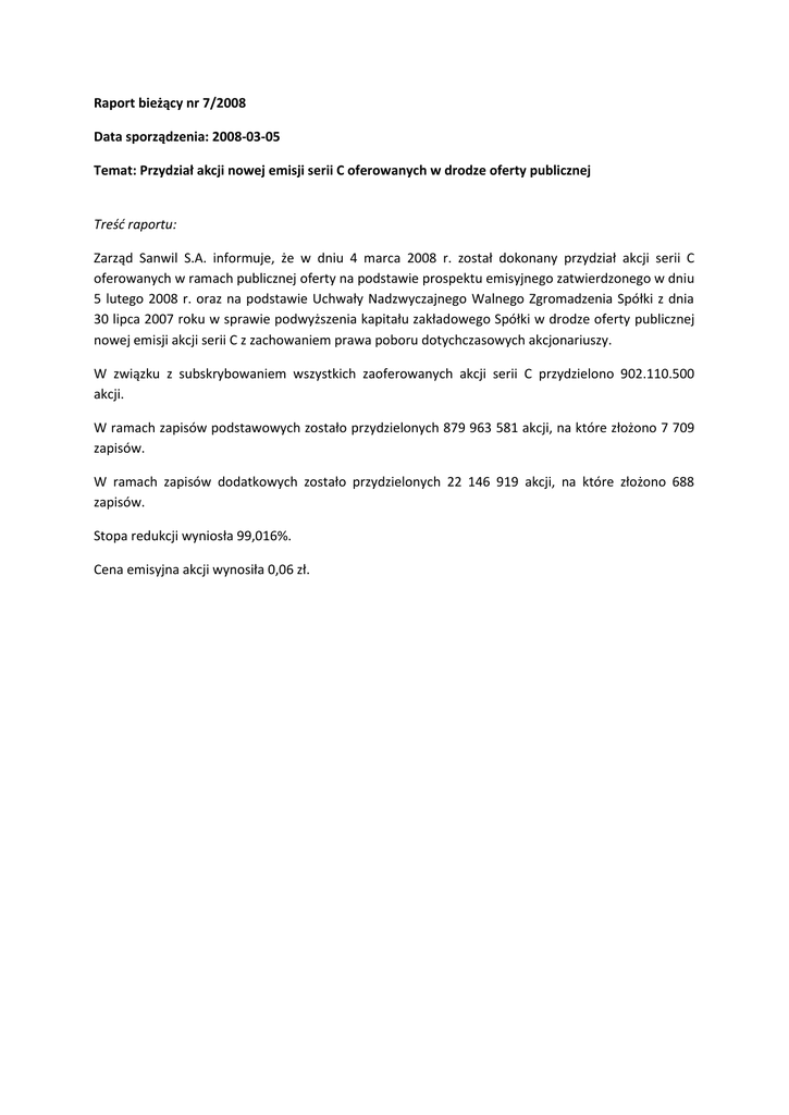 Raport bieżący nr 7/2008 Data sporządzenia: 2008-03-05 Temat: Przydział akcji nowej emisji serii C oferowanych w drodze oferty publicznej Treść raportu: Zarząd Sanwil S.A. informuje, że w dniu 4 marca 2008 r. został dokonany przydział akcji serii C oferowanych w ramach publicznej oferty na podstawie prospektu emisyjnego zatwierdzonego w dniu 5 lutego 2008 r. oraz na podstawie Uchwały Nadzwyczajnego Walnego Zgromadzenia Spółki z dnia 30 lipca 2007 roku w sprawie podwyższenia kapitału zakładowego Spółki w drodze oferty publicznej nowej emisji akcji serii C z zachowaniem prawa poboru dotychczasowych akcjonariuszy. W związku z subskrybowaniem wszystkich zaoferowanych akcji serii C przydzielono 902.110.500 akcji. W ramach zapisów podstawowych zostało przydzielonych 879 963 581 akcji, na które złożono 7 709 zapisów. W ramach zapisów dodatkowych zostało przydzielonych 22 146 919 akcji, na które złożono 688 zapisów. Stopa redukcji wyniosła 99,016%. Cena emisyjna akcji wynosiła 0,06 zł.