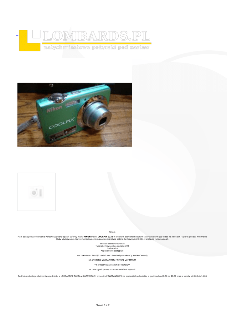 Witam Mam dzisiaj do zaoferowania Państwu używany aparat cyforwy marki NIKON model COOLPIX S220 w idealnym stanie technicznym jak i wizualnym (co widać na zdjęciach - aparat posiada minimalne ślady użytkowania). Jedynym mankamentem aparatu jest słaba bateria (wytrzymuje 20-30 i sygnalizuje rozładowanie). W skład zestawu wchodzi: *aparat cyfrowy nikon coolpix s220 *ładowarka *opakowanie zastępcze NA ZAKUPIONY SPRZĘT UDZIELAM 2 DNIOWEJ GWARANCJI ROZRUCHOWEJ NA ŻYCZENIE WYSTAWIAMY FAKTURĘ VAT MARŻA **Serdecznie zapraszam do licytacji** W razie pytań proszę o kontakt telefoniczny/mail Bądź do osobistego obejrzenia przedmiotu w LOMBARDZIE TAMPA w KATOWICACH przy ulicy POWSTAŃCÓW 6 od poniedziałku do piątku w godzinach od 8.00 do 18.00 oraz w soboty od 8.00 do 14.00 Strona 1 z 2 Strona 2 z 2