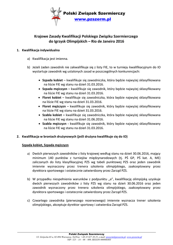 Polski Związek Szermierczy www.pzszerm.pl Krajowe Zasady Kwalifikacji Polskiego Związku Szermierczego do Igrzysk Olimpijskich – Rio de Janeiro 2016 1. Kwalifikacja indywidualna a) Kwalifikacja jest imienna. b) Jeżeli żaden zawodnik nie zakwalifikuje się z listy FIE, to w turnieju kwalifikacyjnym do IO wystartuje zawodnik wg ustalonych zasad w poszczególnych konkurencjach: Szpada kobiet – kwalifikuje się zawodniczka, która będzie najwyżej sklasyfikowana na liście FIE wg stanu na dzień 31.03.2016. Szpada mężczyzn – kwalifikuje się zawodnik, który będzie najwyżej sklasyfikowany na liście FIE wg stanu na dzień 31.03.2016. Floret kobiet – kwalifikuje się zawodniczka, która będzie najwyżej sklasyfikowana na liście FIE wg stanu na dzień 31.03.2016. Floret mężczyzn – kwalifikuje się zawodnik, który będzie najwyżej sklasyfikowany na liście FIE wg stanu na dzień 31.03.2016. Szabla kobiet – kwalifikuje się zawodniczka, która będzie najwyżej sklasyfikowana na liście FIE wg stanu na dzień 31.06.2016. Szabla mężczyzn - kwalifikuje się zawodnik, który będzie najwyżej sklasyfikowany na liście FIE wg stanu na dzień 31.03.2016. 2. Kwalifikacja w broniach drużynowych (jeśli drużyna kwalifikuje się do IO) Szpada kobiet, Szpada mężczyzn a) Dwóch pierwszych zawodników z listy krajowej według stanu na dzień 30.06.2016, mający minimum 140 punktów z turniejów międzynarodowych (tj. PŚ GP, PŚ kat. A, ME) zaliczanych do listy klasyfikacyjnej PZS wg tabeli punktowej PZS oraz jeden zawodnik imiennie wyznaczony przez trenera szkolenia olimpijskiego, zaakceptowany przez dyrektora sportowego i ostatecznie zatwierdzony przez Zarząd PZS. b) W przypadku niespełnienia warunków z podpunktu „a”, kwalifikację olimpijską uzyskuje dwóch pierwszych zawodników z listy PZS wg stanu na dzień 30.06.2016 oraz jeden zawodnik wyznaczony przez trenera szkolenia olimpijskiego, zaakceptowany przez dyrektora sportowego i ostatecznie zatwierdzony przez Zarząd PZS. c) Czwartego zawodnika (pierwszego rezerwowego) imiennie wyznacza trener szkolenia olimpijskiego, akceptuje dyrektor sportowy i zatwierdza Zarząd PZS. Polski Związek Szermierczy Ul. Grójecka 65 a, 02-094 Warszawa, Tel/Fax: +48 22 827 28 25, e-mail: [email protected], www.pzszerm.pl NIP: 525 – 14 – 08 – 089, REGON 000866403 Polski Związek Szermierczy www.pzszerm.pl Szabla kobiet a) Pierwsza zawodniczka z listy krajowej według stanu na dzień 30.06.2016 oraz dwie zawodniczki najwyżej sklasyfikowane (oprócz pierwszej zawodniczki z listy krajowej według stanu na dzień 30.06.2016) na liście rankingowej FIE wg stanu na dzień 30.06.2016, pod warunkiem że są w pierwszej "szesnastce" tej listy. b) W przypadku, gdy warunek z punktu „a”, dotyczący kwalifikacji zawodniczek z listy FIE, spełni tylko jedna z dwóch zawodniczek, to trzecia zawodniczka zostaje wyznaczona przez trenera szkolenia olimpijskiego, zaakceptowana przez dyrektora sportowego i ostatecznie zatwierdzona przez Zarząd PZS. c) W przypadku, gdy w warunku z punktu „a”, dotyczącego kwalifikacji zawodniczek z listy FIE, nie spełni żadna z dwóch zawodniczek, to dwie zawodniczki: druga i trzecia, zostają wyznaczone przez trenera szkolenia olimpijskiego, zaakceptowane przez dyrektora sportowego i ostatecznie zatwierdzone przez Zarząd PZS. d) Czwartą zawodniczkę (pierwszą rezerwową) imiennie wyznacza trener szkolenia olimpijskiego, akceptuje dyrektor sportowy i zatwierdza Zarząd PZS. Floret mężczyzn a) Dwóch najwyżej sklasyfikowanych zawodników z listy FIE według stanu na dzień 30.06.2016 oraz jeden zawodnik wyznaczony przez trenera szkolenia olimpijskiego, zaakceptowany przez dyrektora sportowego i ostatecznie zatwierdzona przez Zarząd PZS. b) Czwartego zawodnika (pierwszego rezerwowego) imiennie wyznacza trener szkolenia olimpijskiego akceptuje dyrektor sportowy i zatwierdza Zarząd PZS. 3. Bronie drużynowe (drużyna nie kwalifikuje się), a) Zasady takie jak dla zawodników startujących w konkurencjach indywidualnych. Niniejszym uchyla się punkt 5.7 Regulaminu Polskiego Związku Szermierczego, zatwierdzonego przez Zarząd PZS po ostatnich zmianach dnia 30.08.2014. Zasady zostały przyjęte przez Zarząd PZS, dnia 29 grudnia 2014 W imieniu Zarządu Adam Konopka Prezes Zarządu PZS Polski Związek Szermierczy Ul. Grójecka 65 a, 02-094 Warszawa, Tel/Fax: +48 22 827 28 25, e-mail: [email protected], www.pzszerm.pl NIP: 525 – 14 – 08 – 089, REGON 000866403