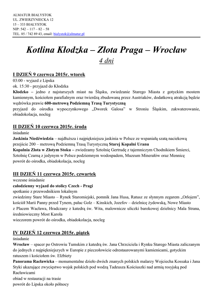 ALMATUR BIAŁYSTOK UL. ZWIERZYNIECKA 12 15 – 333 BIAŁYSTOK NIP: 542 – 117 – 82 – 58 TEL. 85 / 742 89 43, email: [email protected] Kotlina Kłodzka – Złota Praga – Wrocław 4 dni I DZIEŃ 9 czerwca 2015r. wtorek 03:00 - wyjazd z Lipska ok. 15:30 - przyjazd do Kłodzka Kłodzko – jedno z najstarszych miast na Śląsku, zwiedzanie Starego Miasta z gotyckim mostem kamiennym, kościołem parafialnym oraz twierdzą zbudowaną przez Austriaków, dodatkową atrakcją będzie wędrówka prawie 600-metrową Podziemną Trasą Turystyczną przyjazd do ośrodka wypoczynkowego „Dworek Galosa” w Stroniu Śląskim, zakwaterowanie, obiadokolacja, nocleg II DZIEŃ 10 czerwca 2015r. środa śniadanie Jaskinia Niedźwiedzia – najdłuższa i najpiękniejsza jaskinia w Polsce ze wspaniałą szatą naciekową przejście 200 – metrową Podziemną Trasą Turystyczną Starej Kopalni Uranu Kopalnia Złota w Złotym Stoku – zwiedzamy Sztolnię Gertrudę z tajemniczym Chodnikiem Śmierci, Sztolnię Czarną z jedynym w Polsce podziemnym wodospadem, Muzeum Minerałów oraz Mennicę powrót do ośrodka, obiadokolacja, nocleg III DZIEŃ 11 czerwca 2015r. czwartek wczesne śniadanie całodzienny wyjazd do stolicy Czech - Pragi spotkanie z przewodnikiem lokalnym zwiedzimy Stare Miasto – Rynek Staromiejski, pomnik Jana Husa, Ratusz ze słynnym zegarem „Orlojem”, kościół Marii Panny przed Tynem, pałac Golz – Kinskich, Jozefov – dzielnicę żydowską, Nowe Miasto z Placem Wacława, Hradczany z katedrą św. Wita, malownicze uliczki barokowej dzielnicy Mala Strana, średniowieczny Most Karola wieczorem powrót do ośrodka, obiadokolacja, nocleg IV DZIEŃ 12 czerwca 2015r. piątek śniadanie Wrocław – spacer po Ostrowiu Tumskim z katedrą św. Jana Chrzciciela i Rynku Starego Miasta zaliczanym do jednych z najpiękniejszych w Europie z pieczołowicie odrestaurowanymi kamienicami, gotyckim ratuszem i kościołem św. Elżbiety Panorama Racławicka – monumentalne dzieło dwóch znanych polskich malarzy Wojciecha Kossaka i Jana Styki ukazujące zwycięstwo wojsk polskich pod wodzą Tadeusza Kościuszki nad armią rosyjską pod Racławicami obiad w restauracji na trasie powrót do Lipska około północy ZAKRES ŚWIADCZEŃ: przejazd wysokopokładowym, klimatyzowanym autokarem produkcji zachodniej opieka licencjonowanego pilota – przewodnika przewodnicy lokalni ubezpieczenie NNW i KL 3 noclegi w ośrodku wypoczynkowym 3 śniadania, 3 obiadokolacje, obiad w drodze powrotnej bilety wstępu: Podziemna Trasa Turystyczna w Kłodzku Jaskinia Niedźwiedzia Stara Kopalnia Uranu w Kletnie Kopalnia Złota w Złotym Stoku Panorama Racławicka we Wrocławiu CENA: 689zł brutto